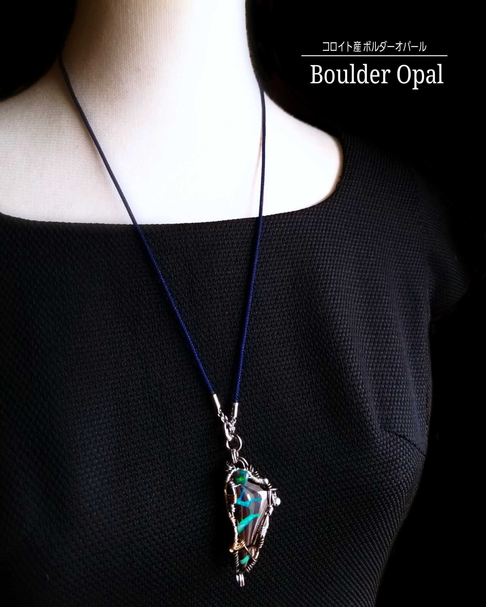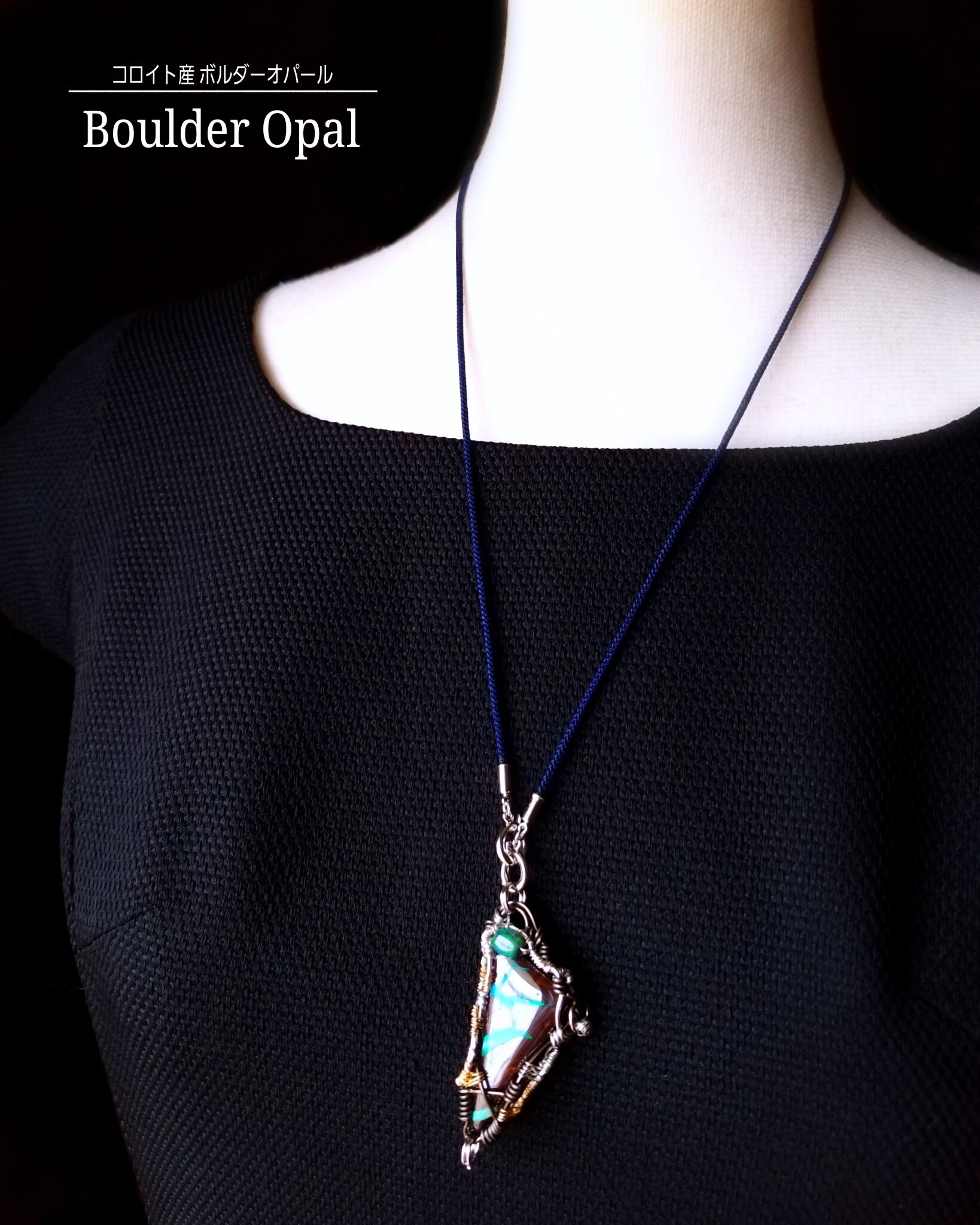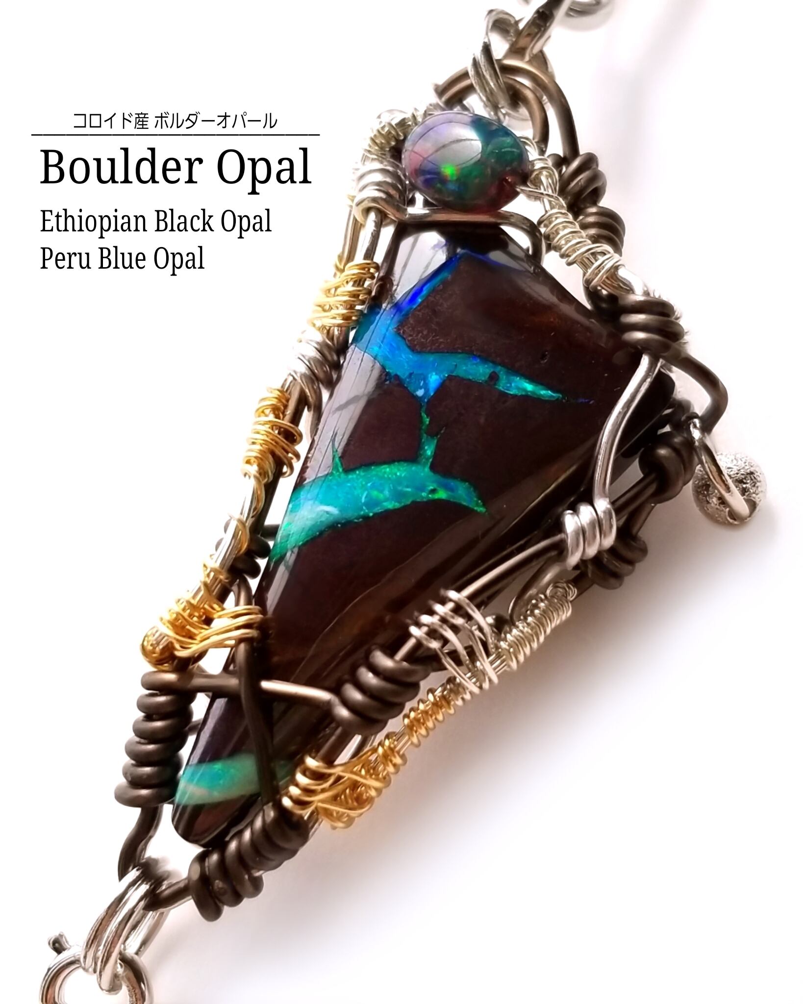グリーンとブルーの遊色効果が大変に美しい、クィーンズランド州はコロイト産のボルダーオパールに、エチオピアンオパールとペルー産のブルーオパールのチャームを組み合わせ、ゴールドとシルバーのアーティスティックワイヤーとブラックとシルバーのアルマイト鍍金アルミ製ワイヤーを使用し、ペンダントトップにデザインしました。