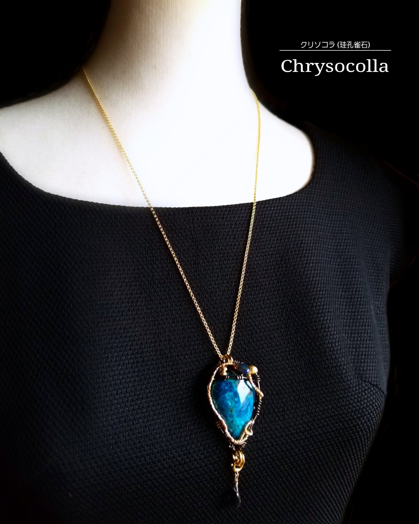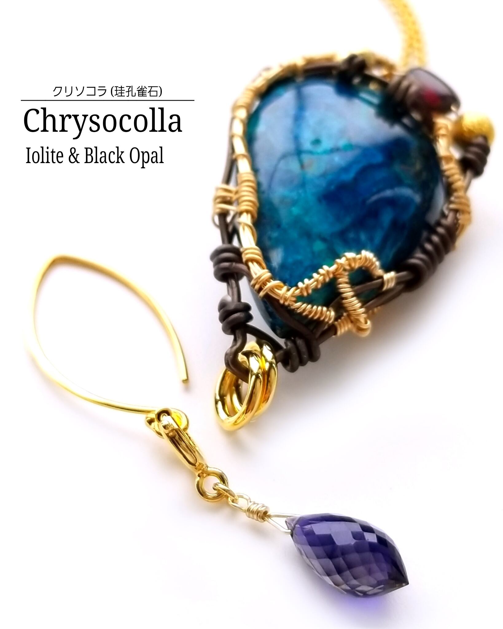 地球を思わせるような美しいクリソコラとブラックオパール(エチオピア産着色)と、アイオライトのチャームを組み合わせ、ゴールドのアーティスティックワイヤーとブラックのアルマトイ鍍金アルミ製ワイヤーを使用し、ペンダントトップにデザインしました。