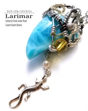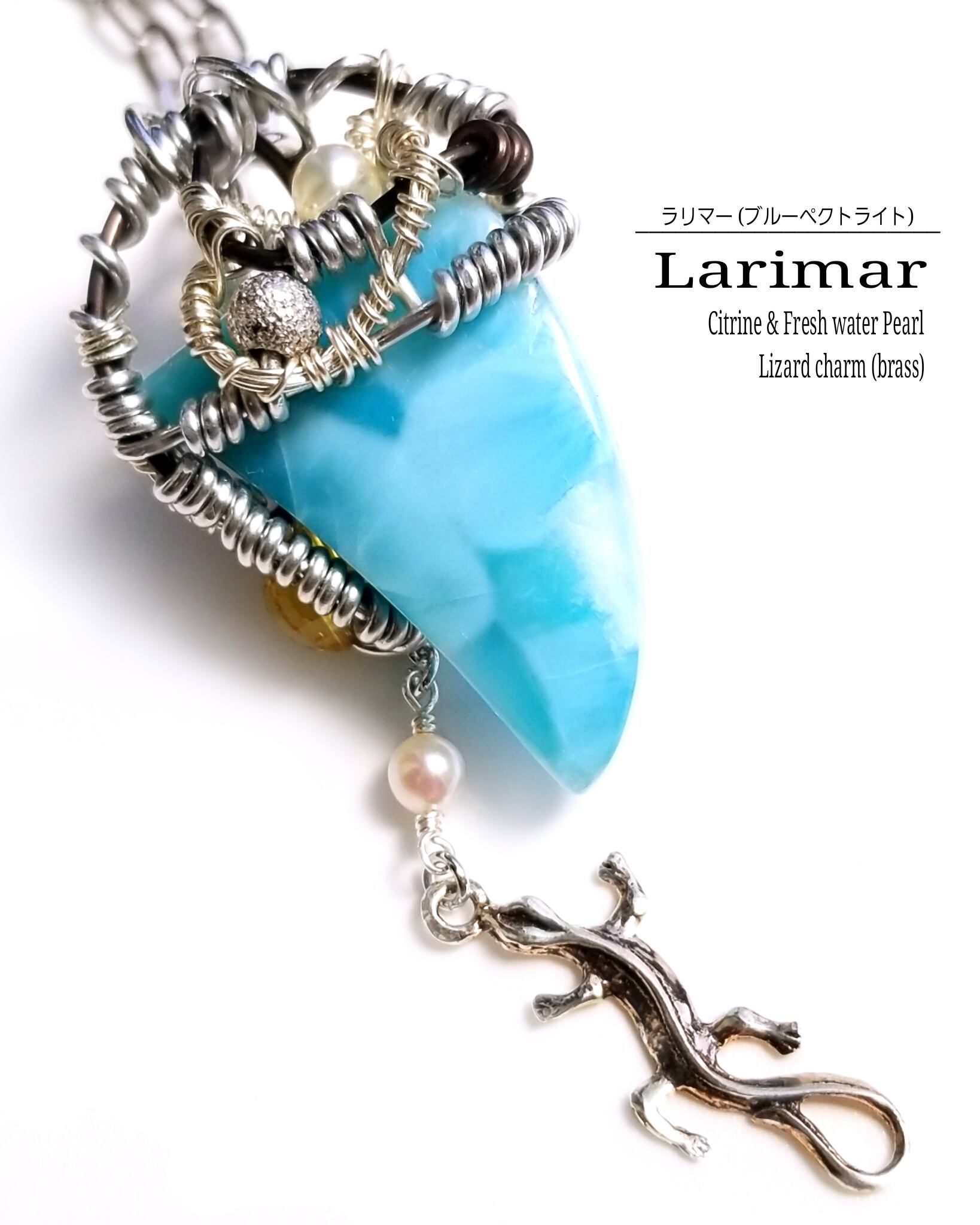 牙のようなシャープなフォルムのドミニカ産ラリマーにシトリンと淡水パール、そして蜥蜴(真鍮)と淡水パールのチャームを組み合わせ、シルバーのアーティスティックワイヤーと、シルバーとブラックのアルマイト鍍金アルミ製ワイヤーを使用し、ペンダントトップにデザインしました。