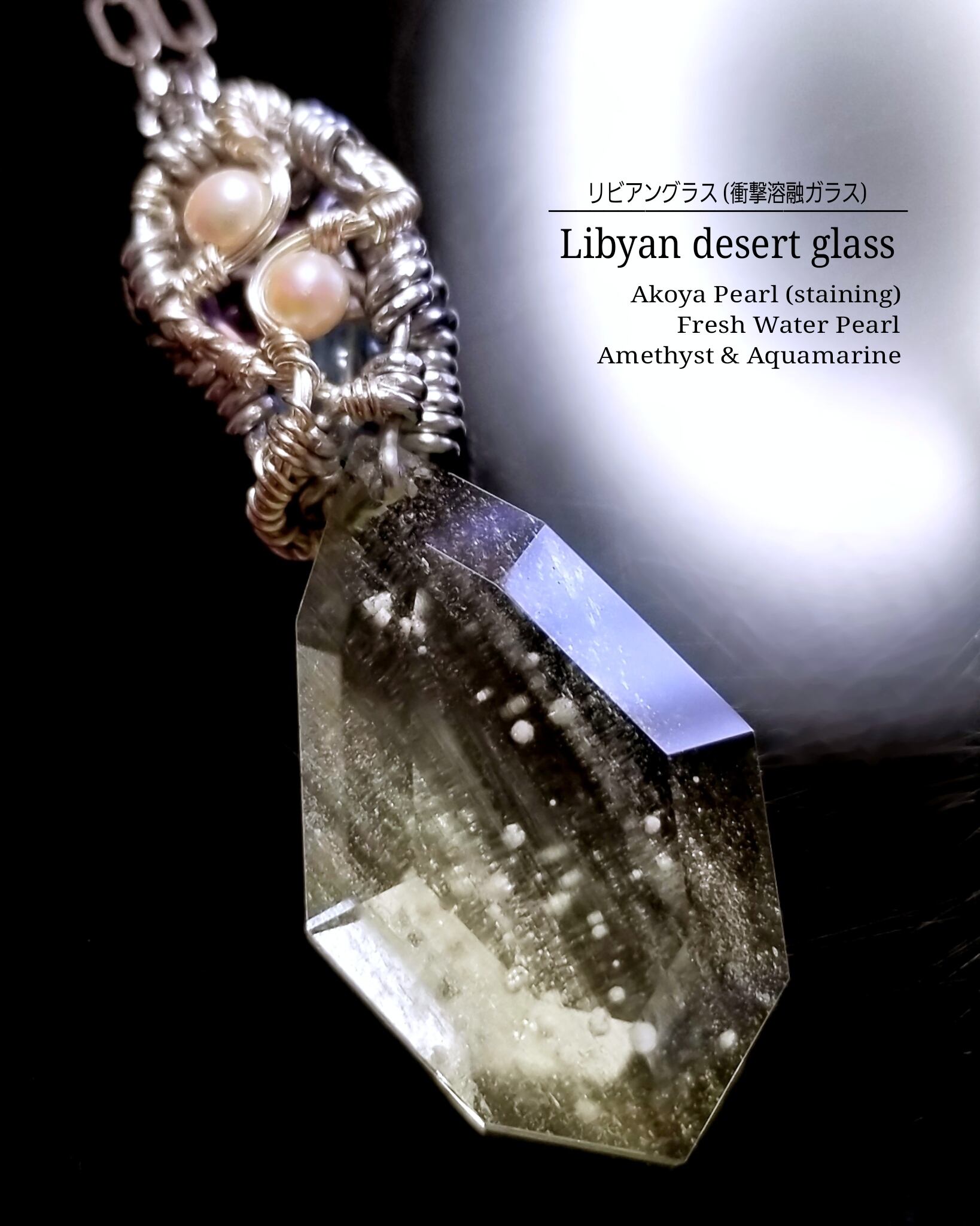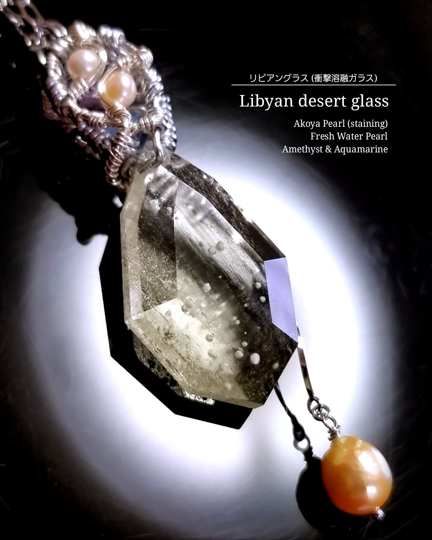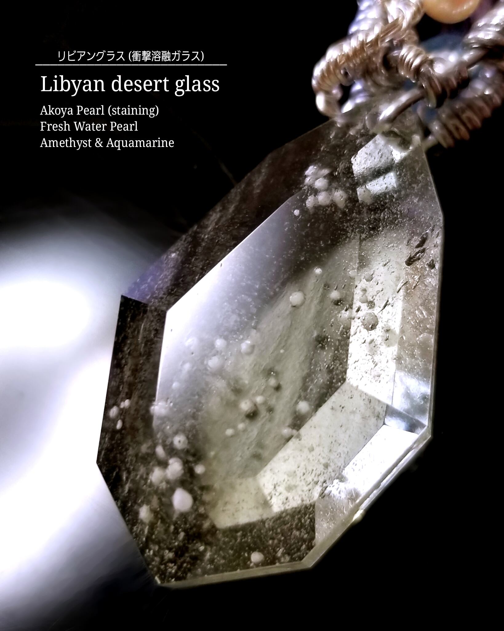 ソーダのような小さな気泡と白いクリストパライトがたくさん詰まっているリビアングラスに淡水パールとピンクアメジストとアクアマリン、そしてゴールドに染色された伊勢志摩産あこや真珠のチャームを組み合わせ、シルバーのアーティスティックワイヤーとアンマイト鍍金アルミ製のワイヤーを使用し、ペンダントトップにデザインしました。