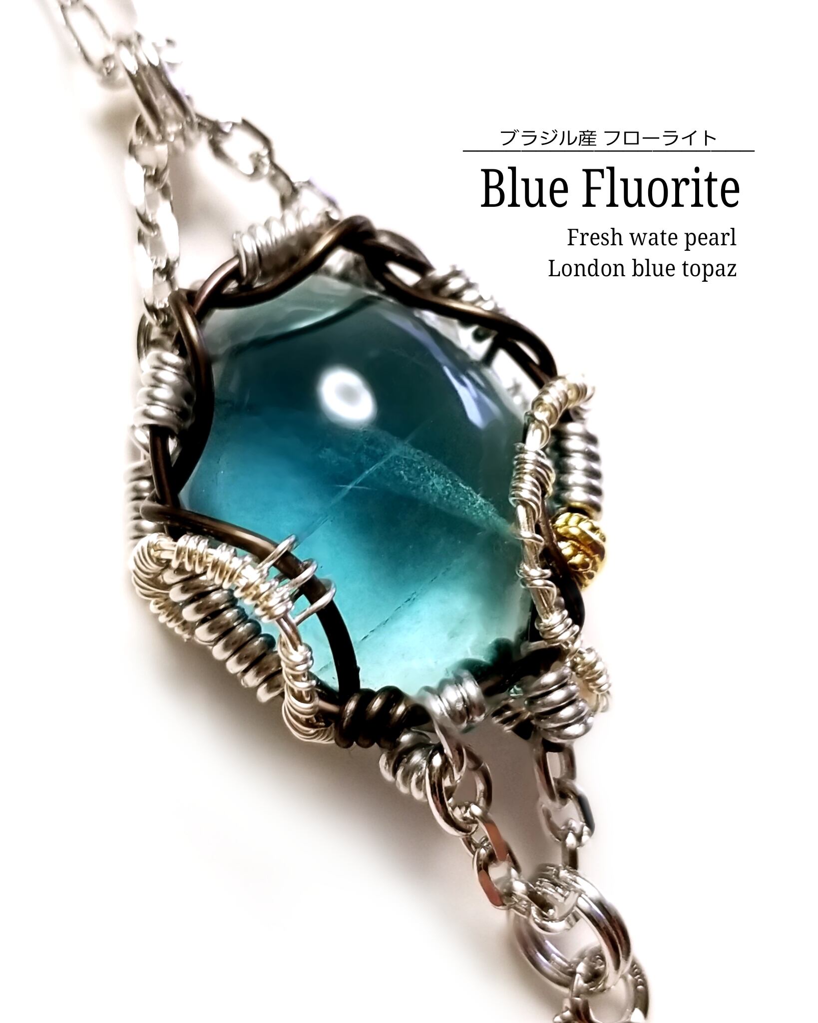 南国の澄んだ海のように美しいブラジル産のブルーフローライトと淡水パール、そしてロンドンブルートパーズのチャームを組み合わせ、シルバーのアーティスティックワイヤーとブラックのアルマイト鍍金アルミ製ワイヤーを使用し、ペンダントトップにデザインしました。