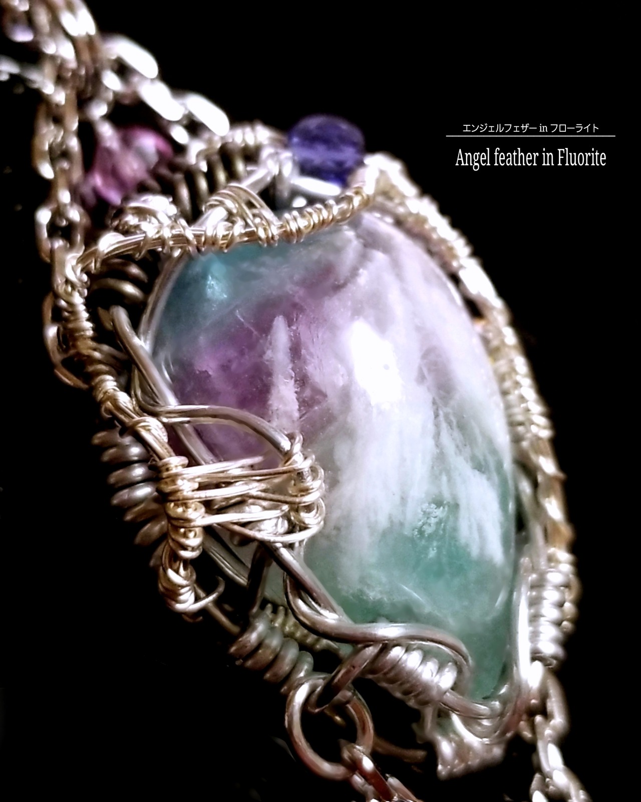 大変に珍しいのエンジェルフェザーinフローライトとアイオライト、そしてピンクアメジストのチャームを組み合わせ、シルバーのアーティスティックワイヤーとアルマイト鍍金アルミ製のワイヤーを使用し、ペンダントトップにデザインしました。