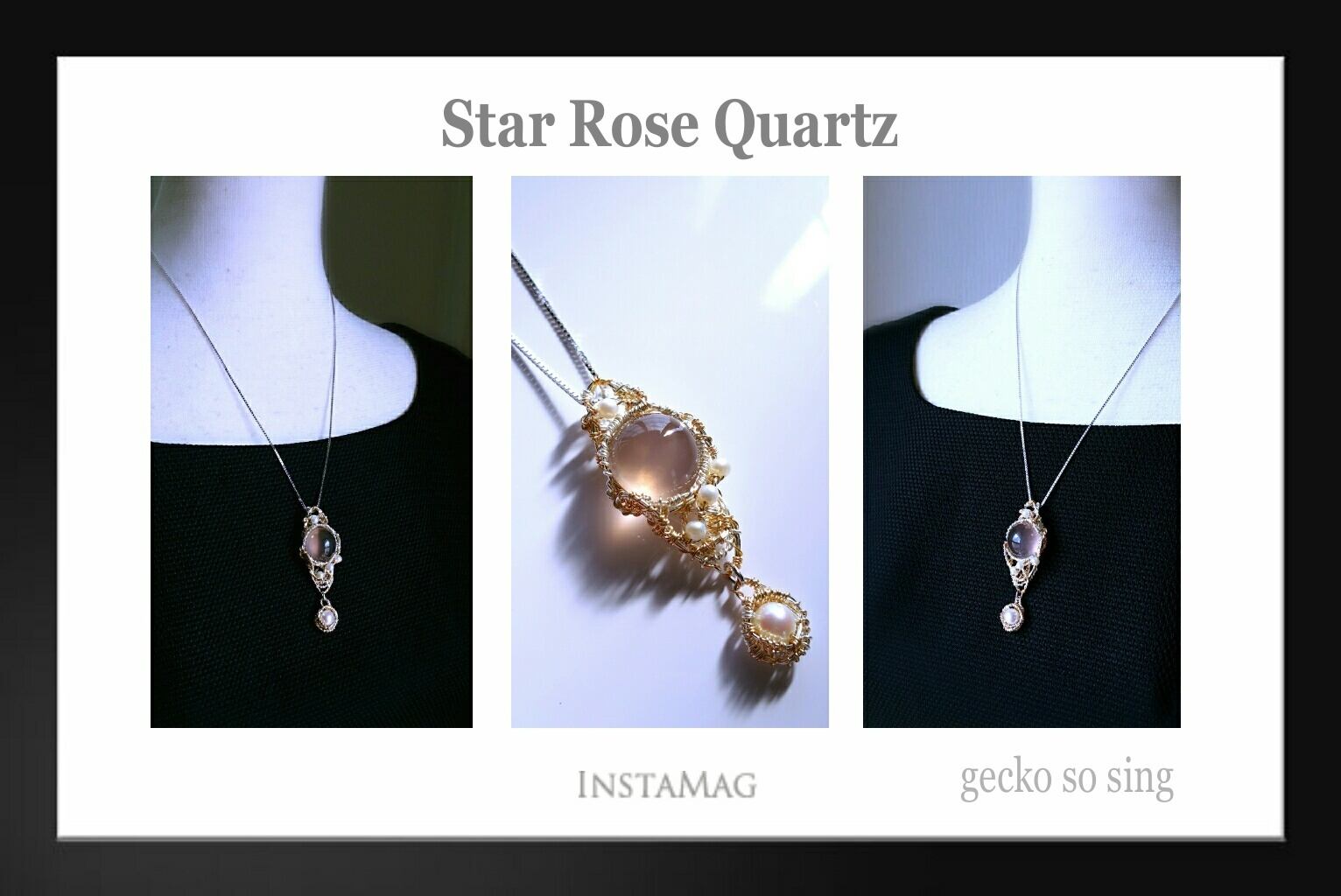 六条のスターが美しく浮かび上がる高品質スターローズクォーツと、伊勢志摩産のアコヤ真珠を組み合わせ、ゴールドとシルバーのアーティスティックワイヤーでペンダントトップにデザインしました。