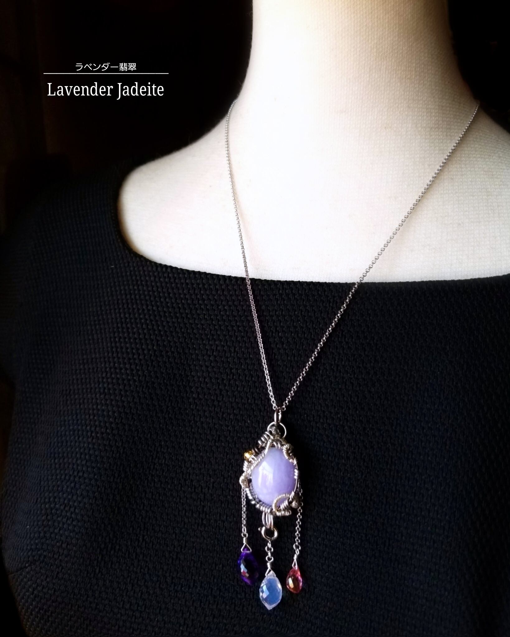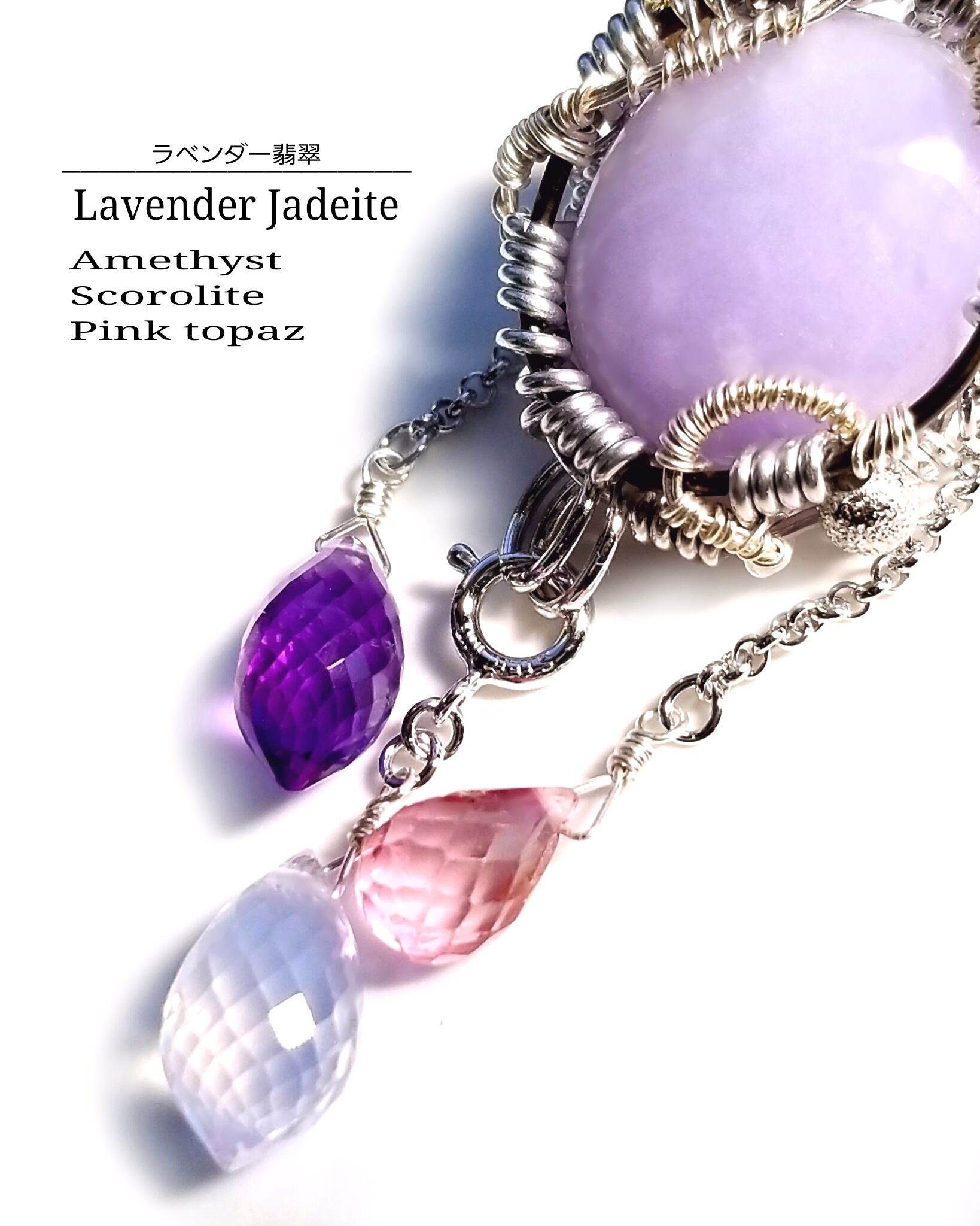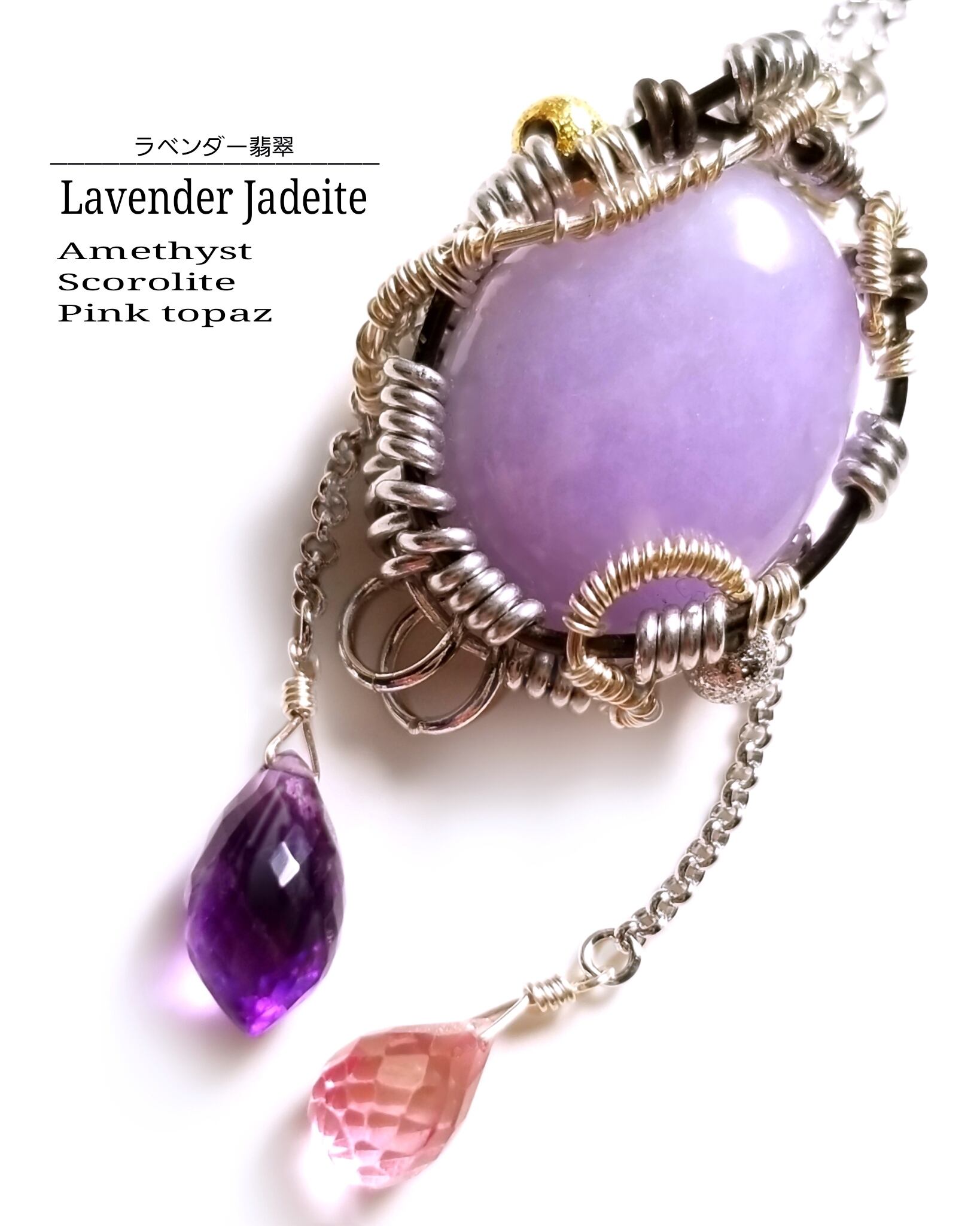 淡いラベンダー色の翡翠とアメジストとピンクトパーズ、そしてスコロライトのチャームと組み合わせて、シルバーのアーティスティックワイヤーとアルマイト鍍金アルミ製ワイヤーを使用し、ペンダントトップにデザインしました。