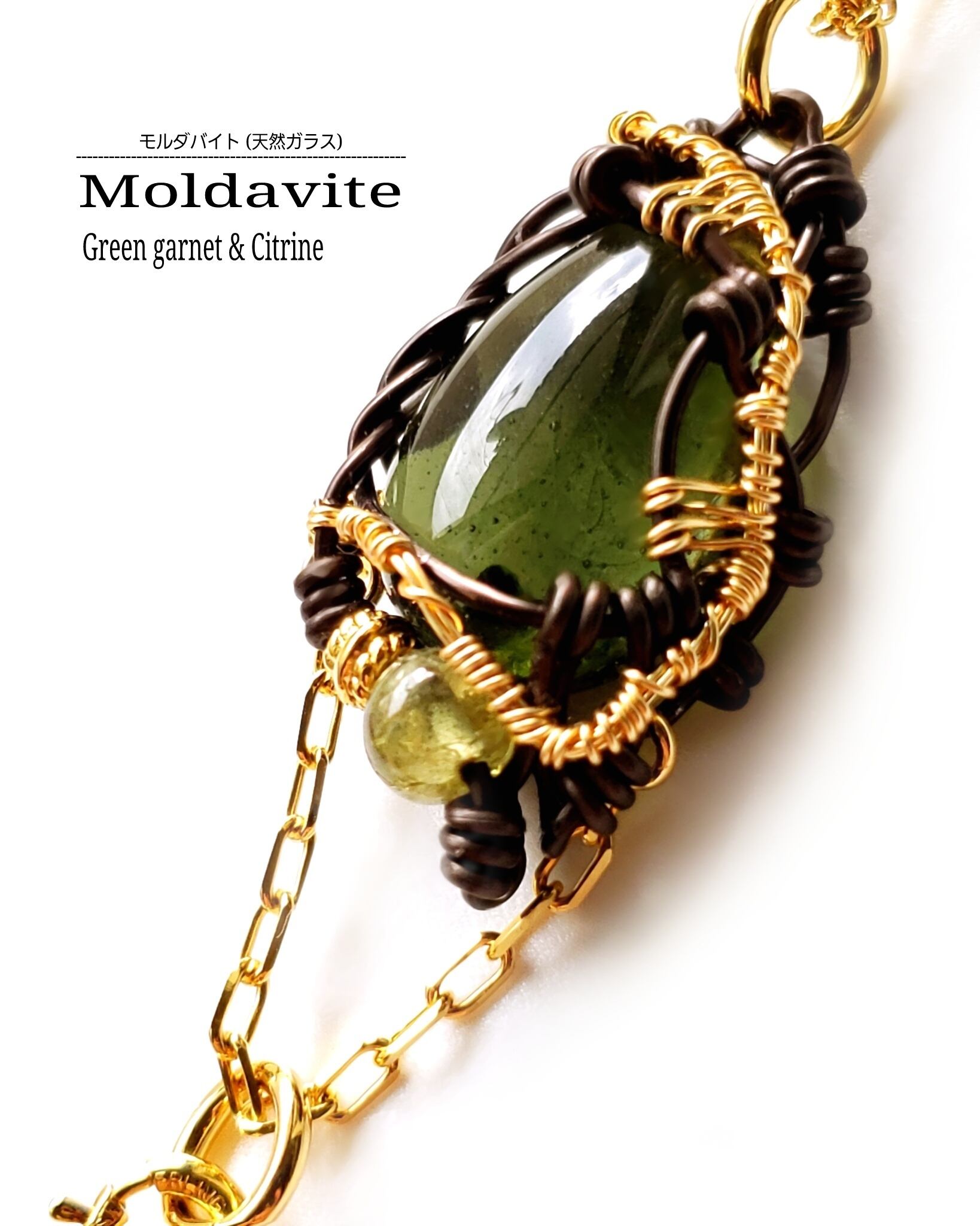 モルダバイトとグリーンガーネット、そしてシトリンのチャームを組み合わせ、ゴールドのアーティスティックワイヤーとブラックのアルマイト鍍金アルミ製ワイヤーを使用し、ペンダントトップにデザインしました。