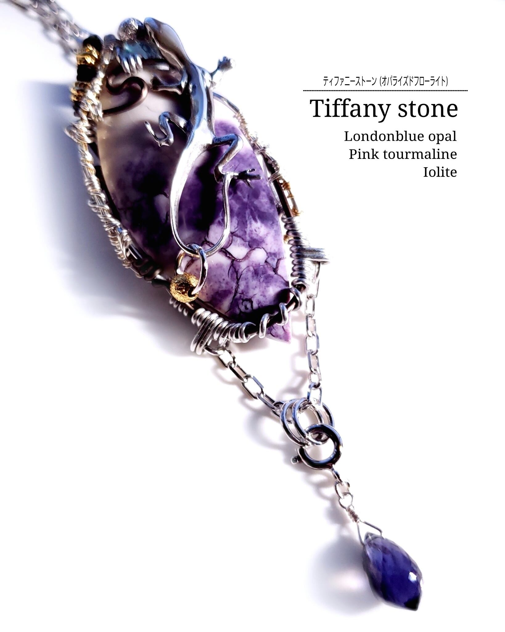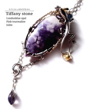 紫色のグラデーションが織り成す模様が素晴らしいティファニーストーンに、ロンドンブルートパーズとピンクトルマリン、そして、蜥蜴とアイオライトのチャームを組み合わせ、シルバーのアーティスティックワイヤーと、シルバーとブラックのアルマイト鍍金アルミ製ワイヤーを使用し、ペンダントトップにデザインしました。