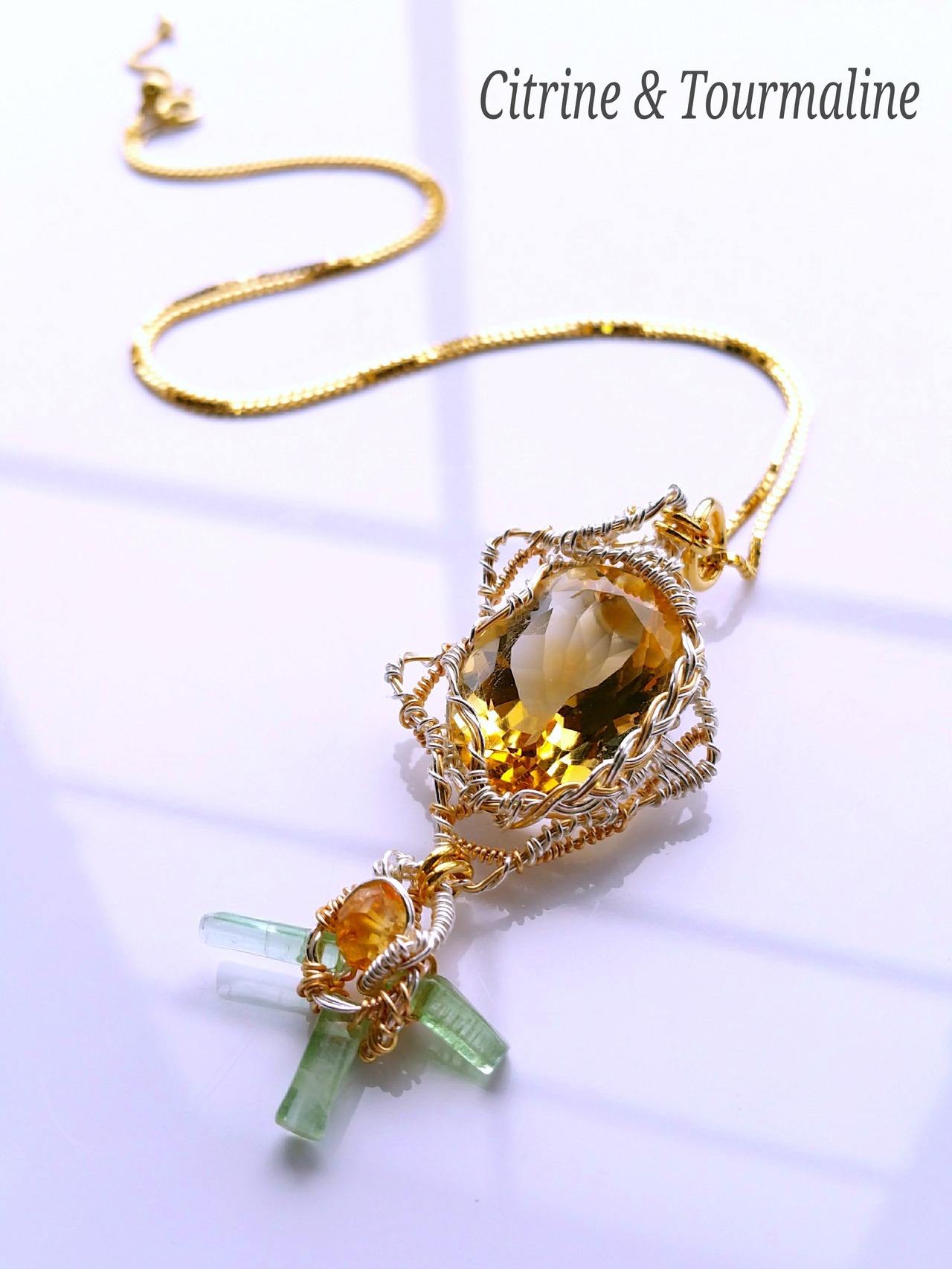宝石質のとても美しいシトリンとグリーントルマリンを組み合わせ、ゴールドとシルバーのアーティスティックワイヤーでペンダントトップにデザインしました。