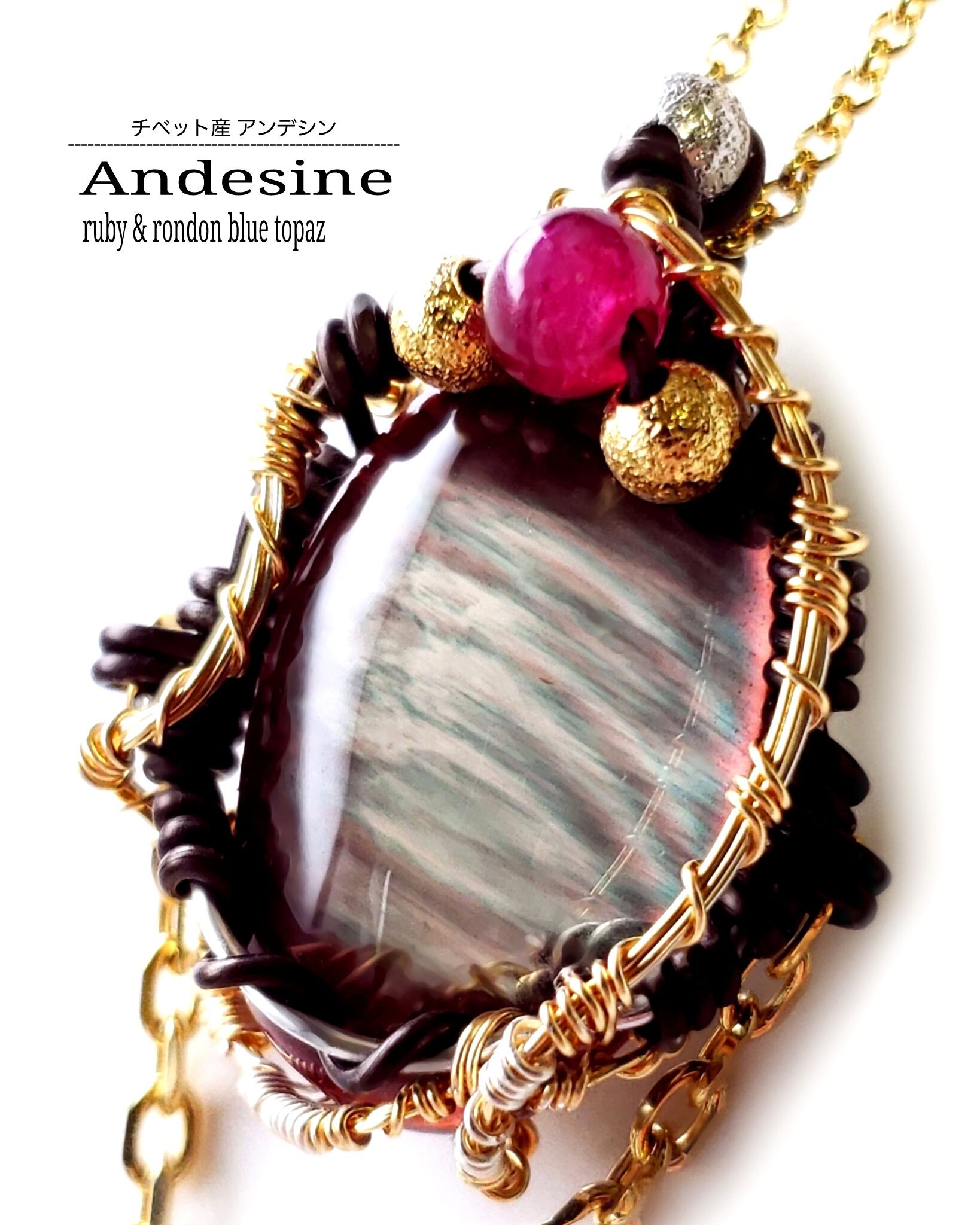 チベット産のカラーチェンジタイプのアンデシンとルビー、そしてロンドンブルートパーズのチャームを組み合わせ、ゴールドのアーティスティックワイヤーとブラックのアルマイト鍍金アルミ製ワイヤーを組み合わせ、ペンダントトップにデザインしました。