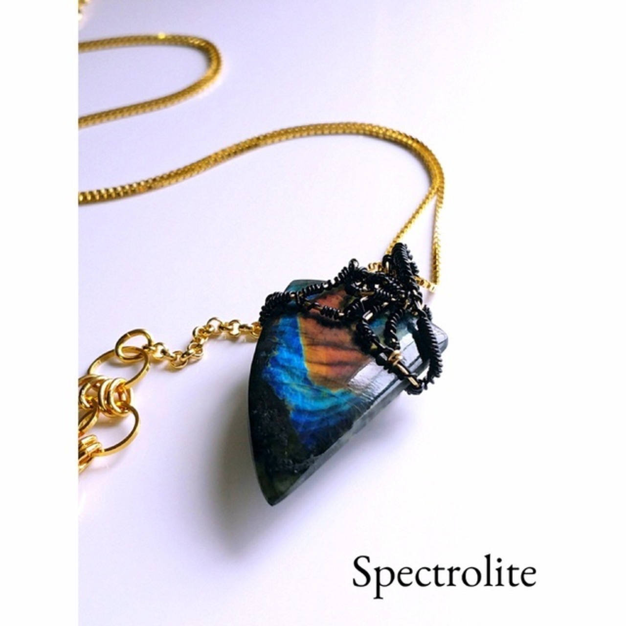 希少なフィンランド・ユレマ産スペクトロライトのカットルースを、ブラックとゴールドのアーティスティックワイヤーを使用して、ペンダントトップにデザインしました。