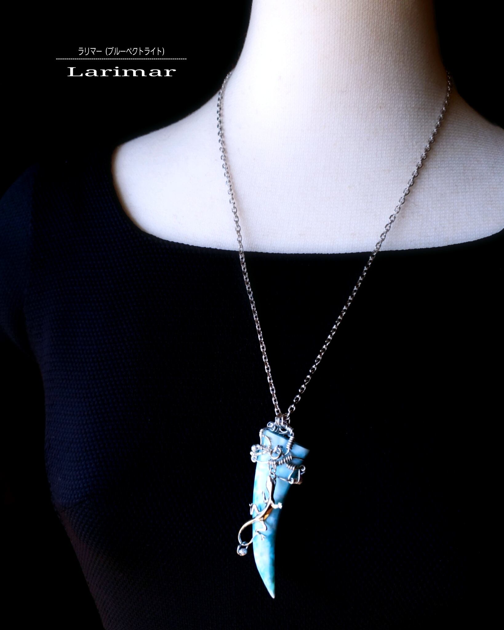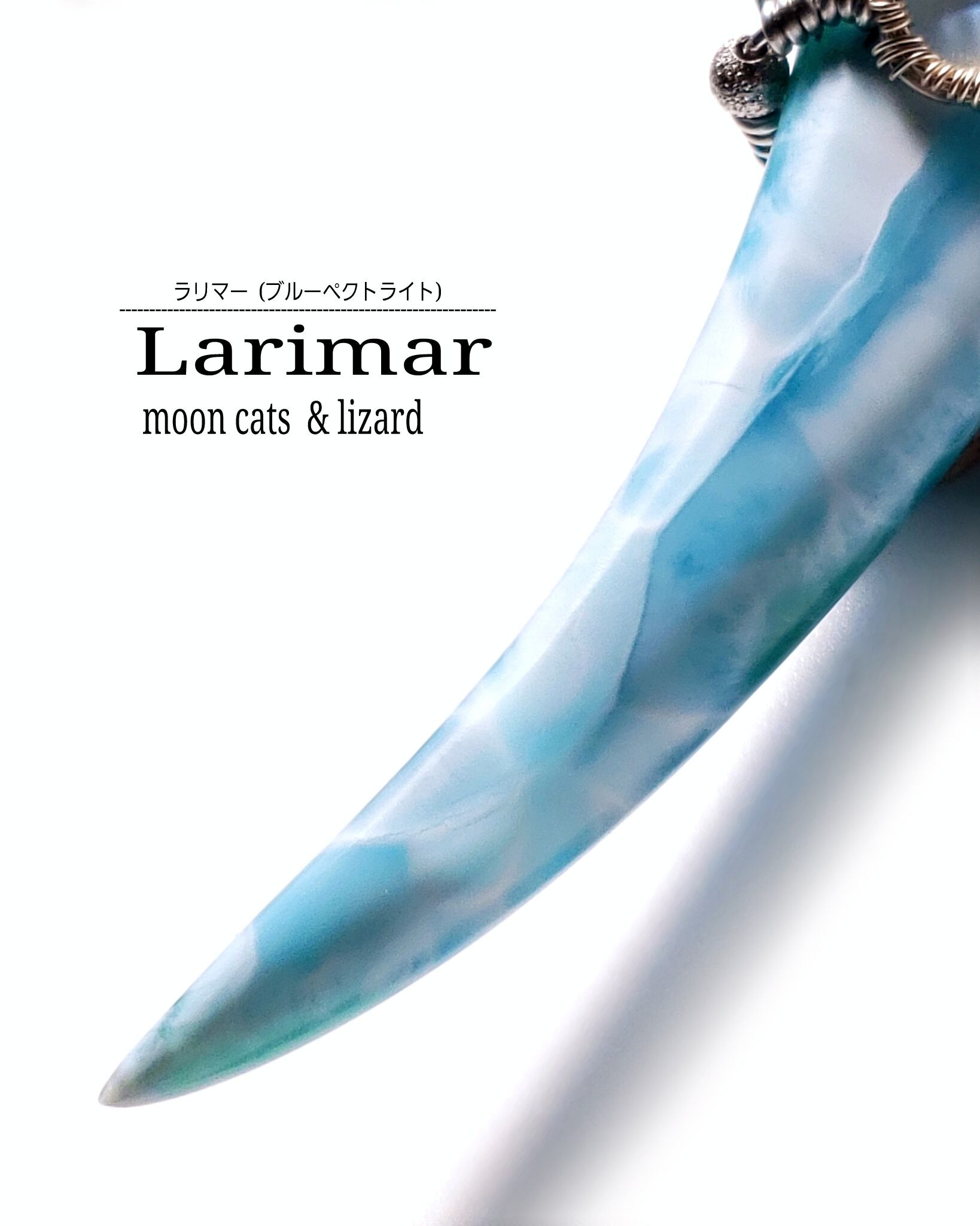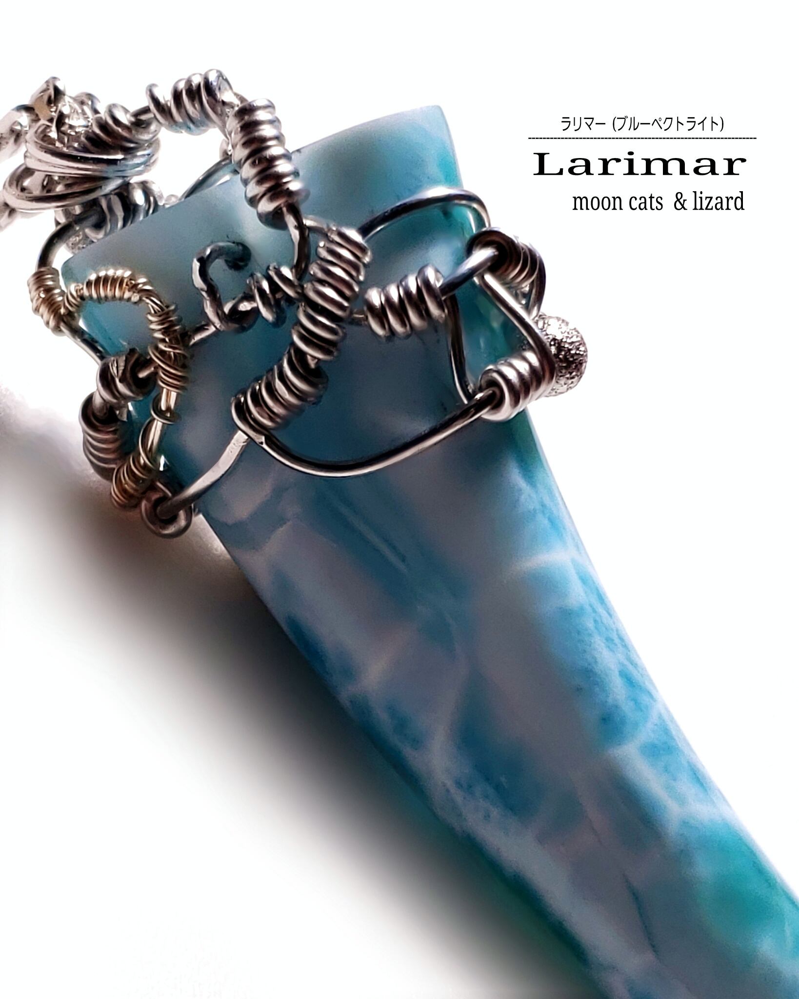 牙のようなシャープなフォルムのドミニカ産ラリマーとムーンストーンキャッツ、そして蜥蜴のチャームを組み合わせ、シルバーのアーティスティックワイヤーとブラックのアルマイト鍍金アルミ製ワイヤーを使用し、ペンダントトップにデザインしました。