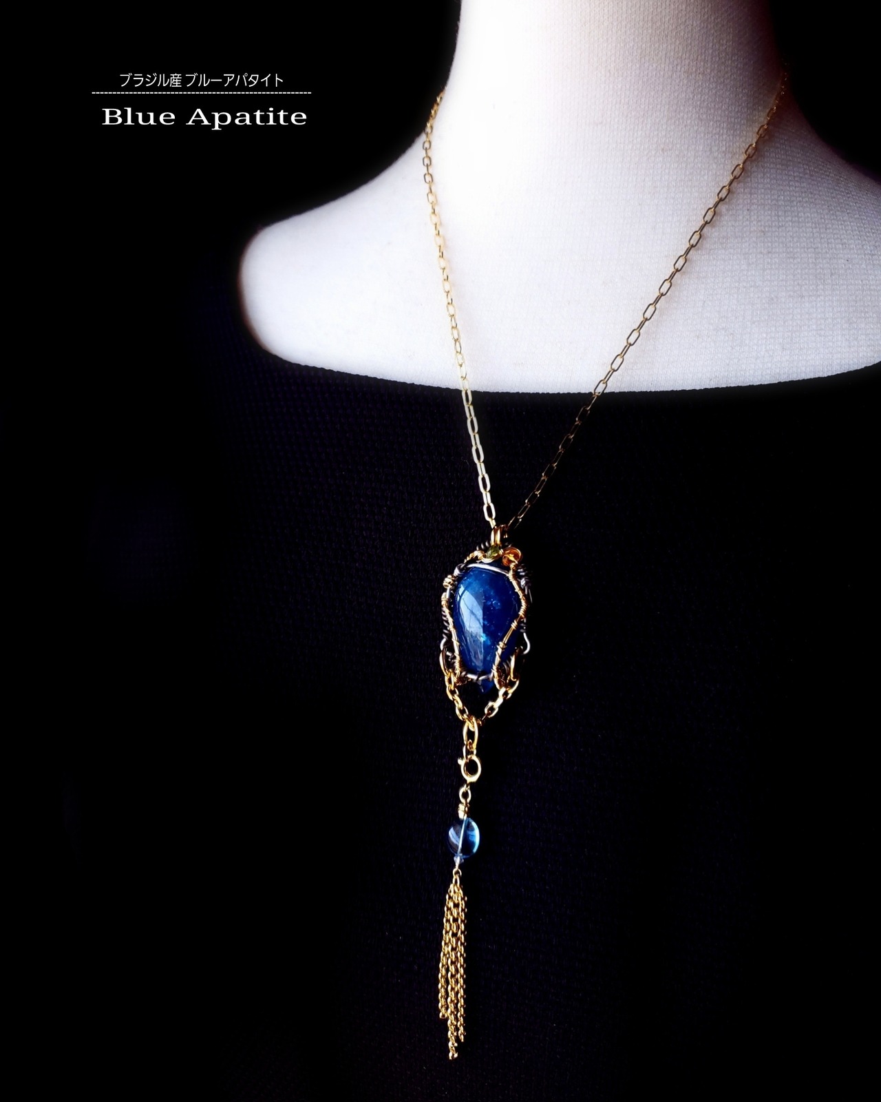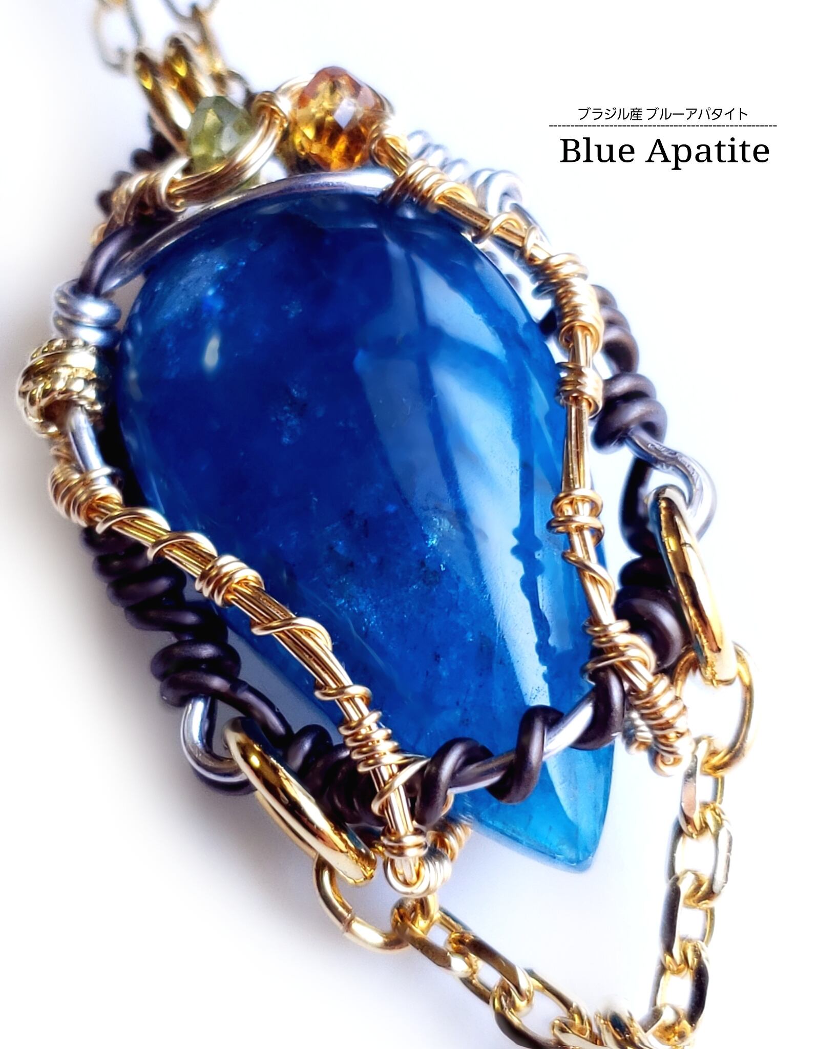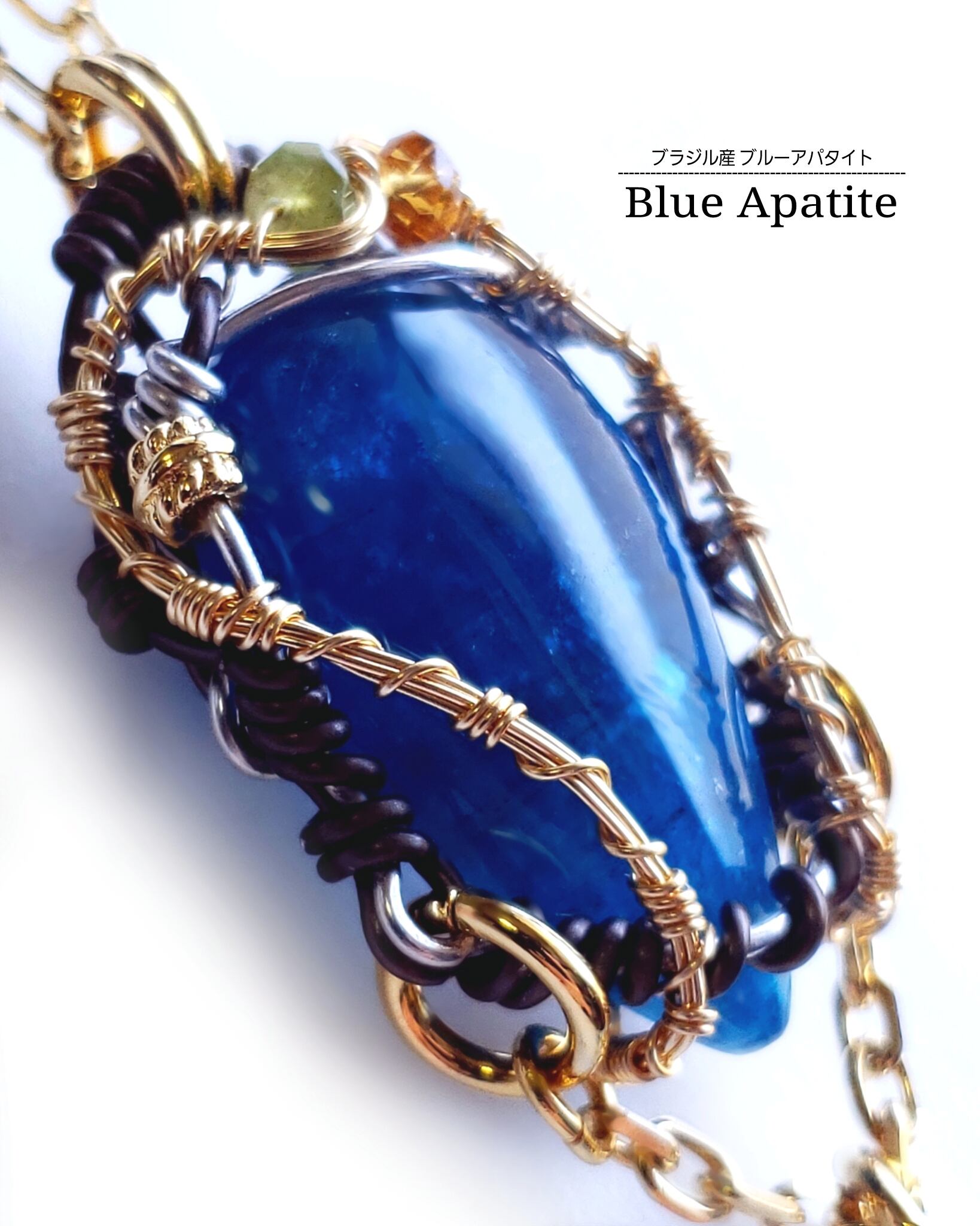 ブラジル産の透明感あるネオンブルーのアパタイトとペリドットとシトリン、そして、ブルートパーズのタッセルチェーン付きチャームを組み合わせ、ゴールドのアーティスティックワイヤーとアルマイト鍍金アルミ製ワイヤーを使用し、ペンダントトップにデザインしました。