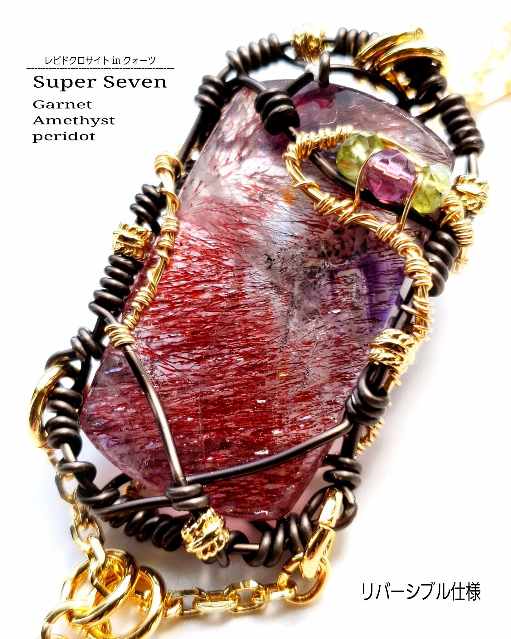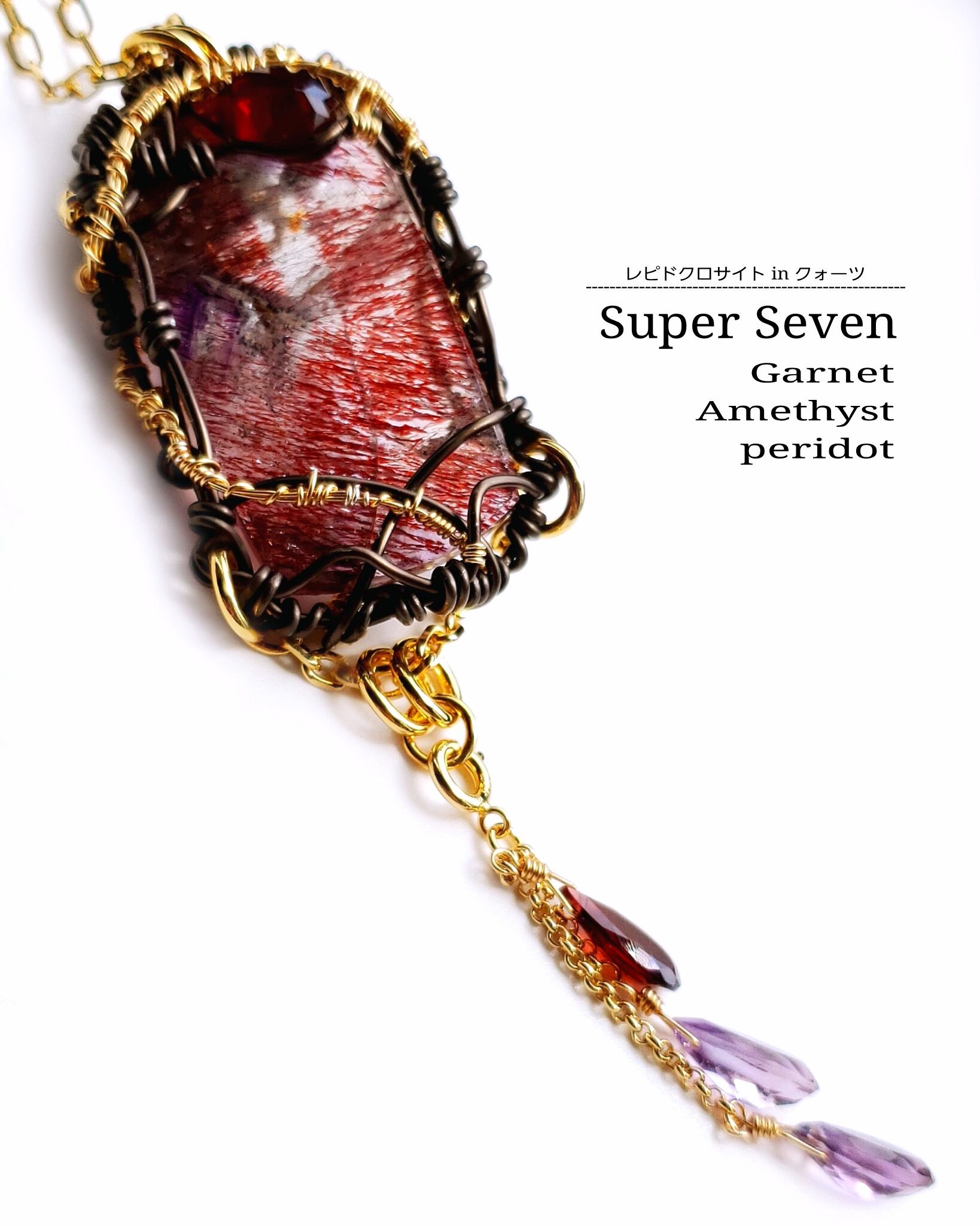 ブラジルはミナスジェライス産のスーパーセブン(レピドクロサイトinクォーツ)とガーネット、そして、ガーネットとアメジストのチャームを組み合わせ、ゴールドのアーティスティックワイヤーと、ブラックのアルマイト鍍金アルミ製ワイヤーを使用し、ペンダントトップにデザインしました。