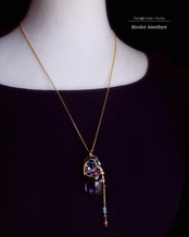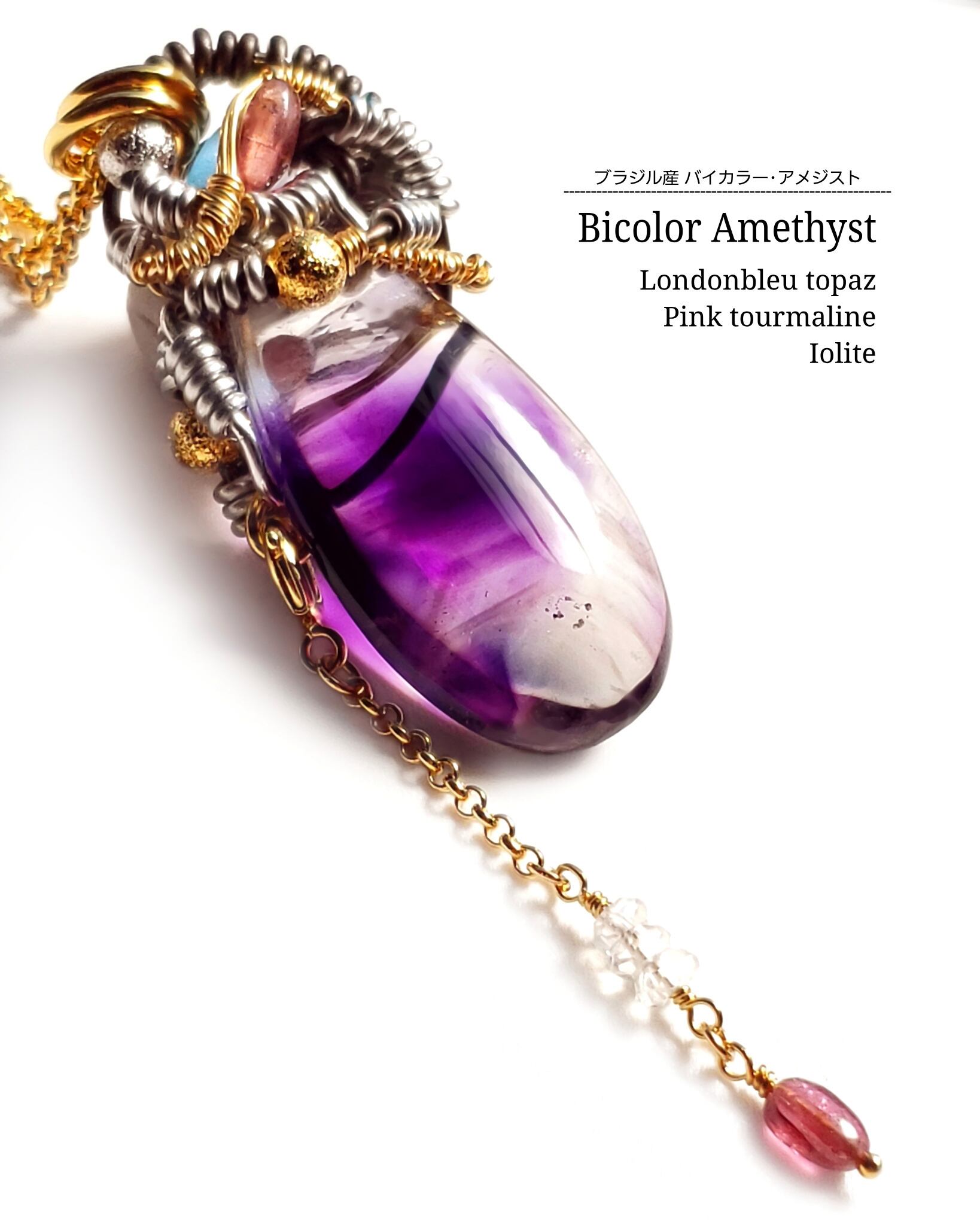 透明な部分と紫色のアメジストのバイカラーが美しい、ミナスジェライス州産アメジストとピンクトルマリンとロンドンブルートパーズとアイオライト、そして、ピンクトルマリンとホワイトラブラドライトのチャームを組み合わせ、ペンダントトップにデザインしました。