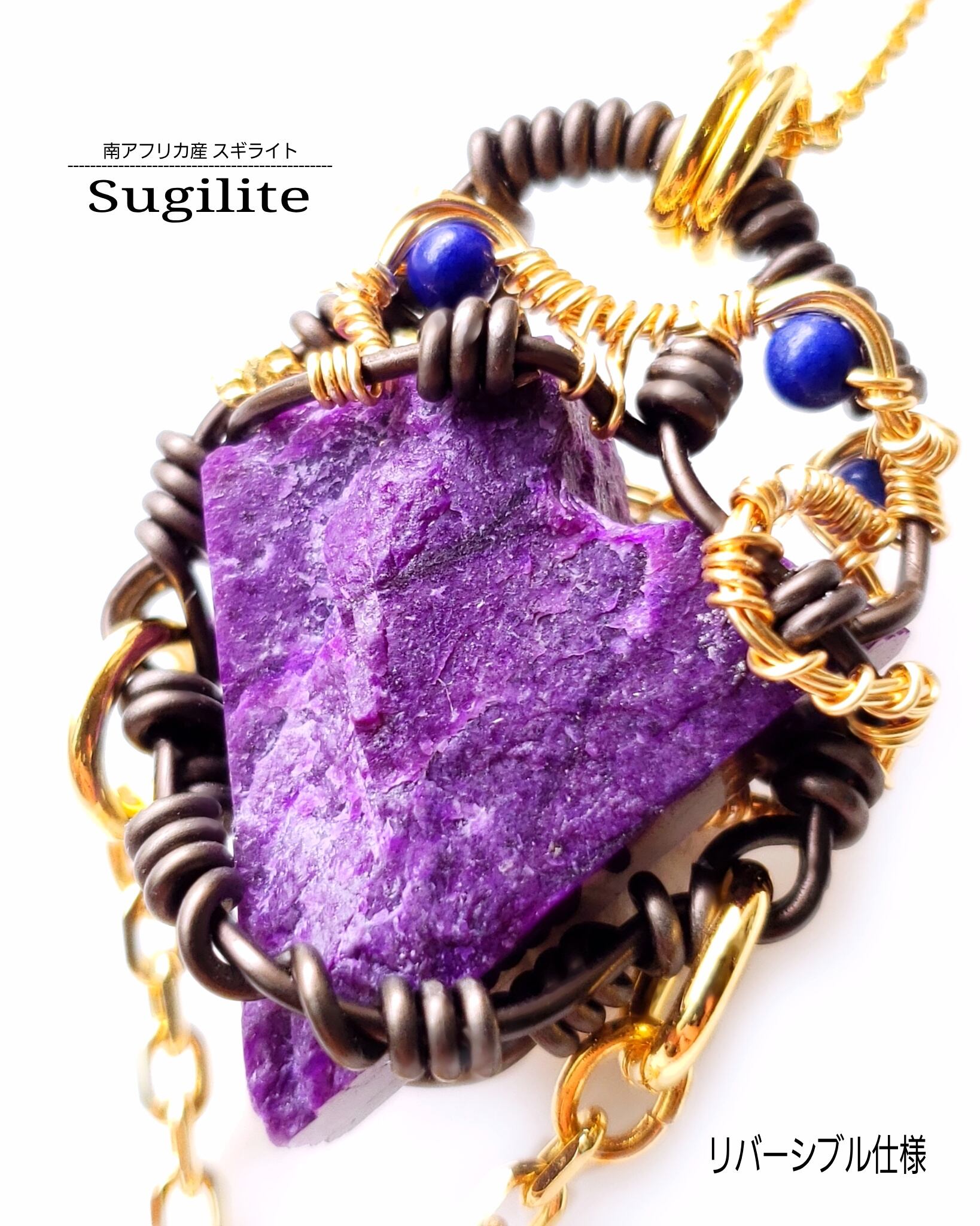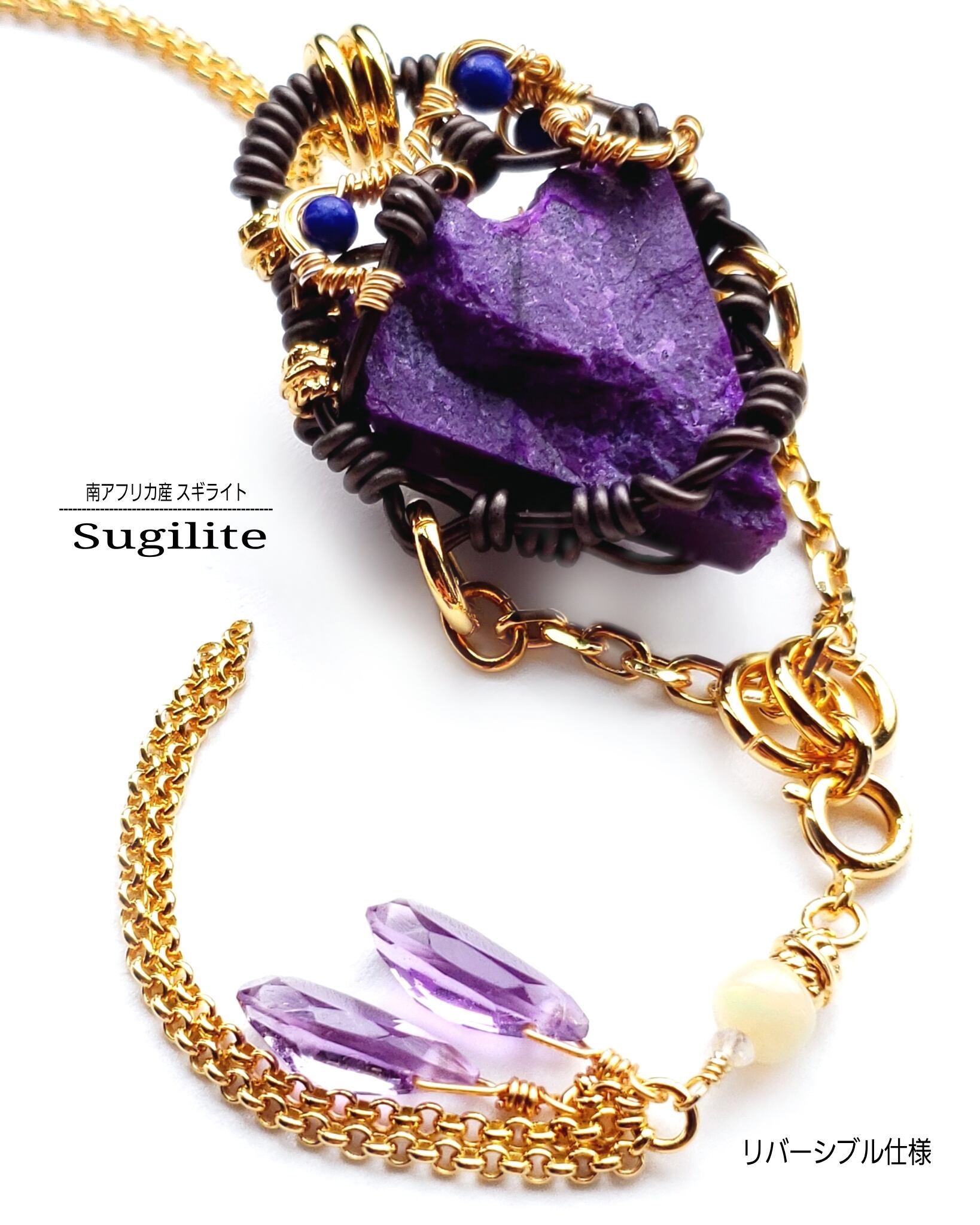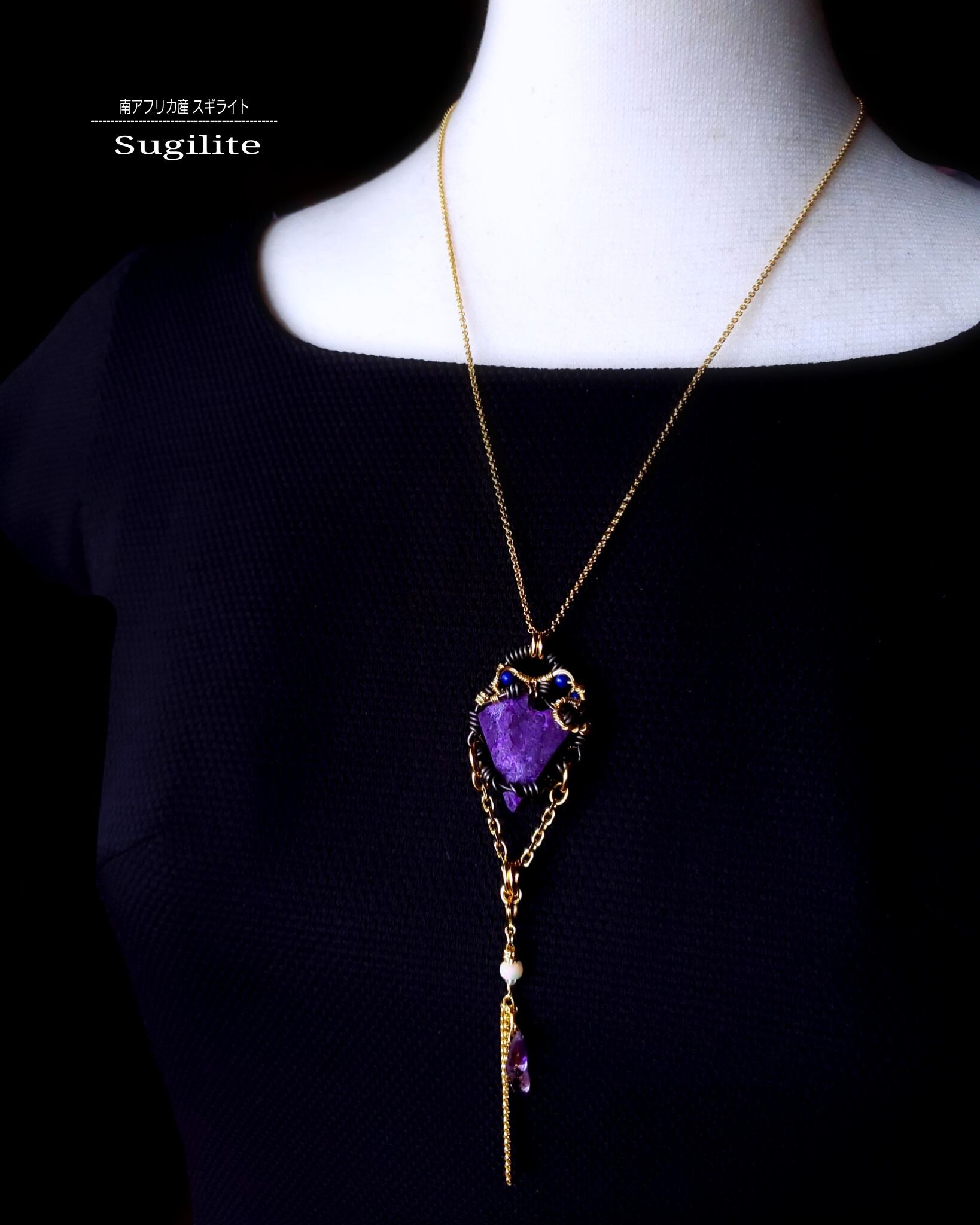 南アフリカ産のしっとりとした紫色のスギライトにメキシコ産オパールとラピスラズリ、そして、エチオピア産オパールとアメジストのチャームを組み合わせ、ゴールドのアーティスティックワイヤーとブラックのアルマイト鍍金アルミ製ワイヤーを使用して、ペンダントにデザインしました。