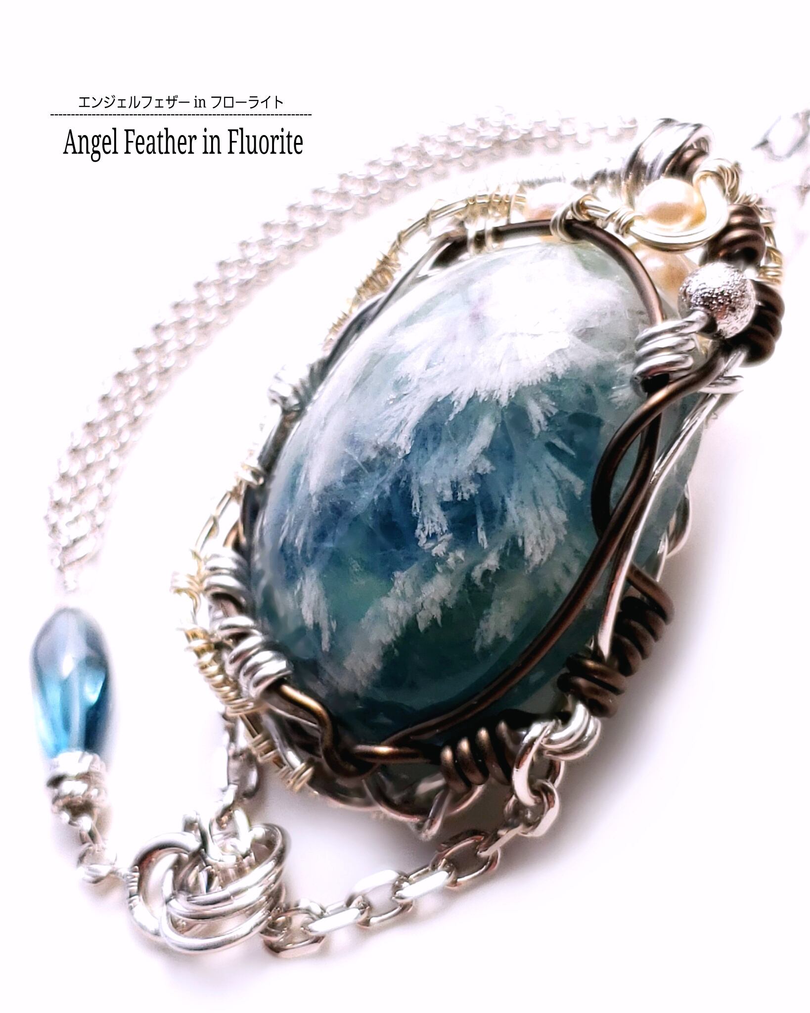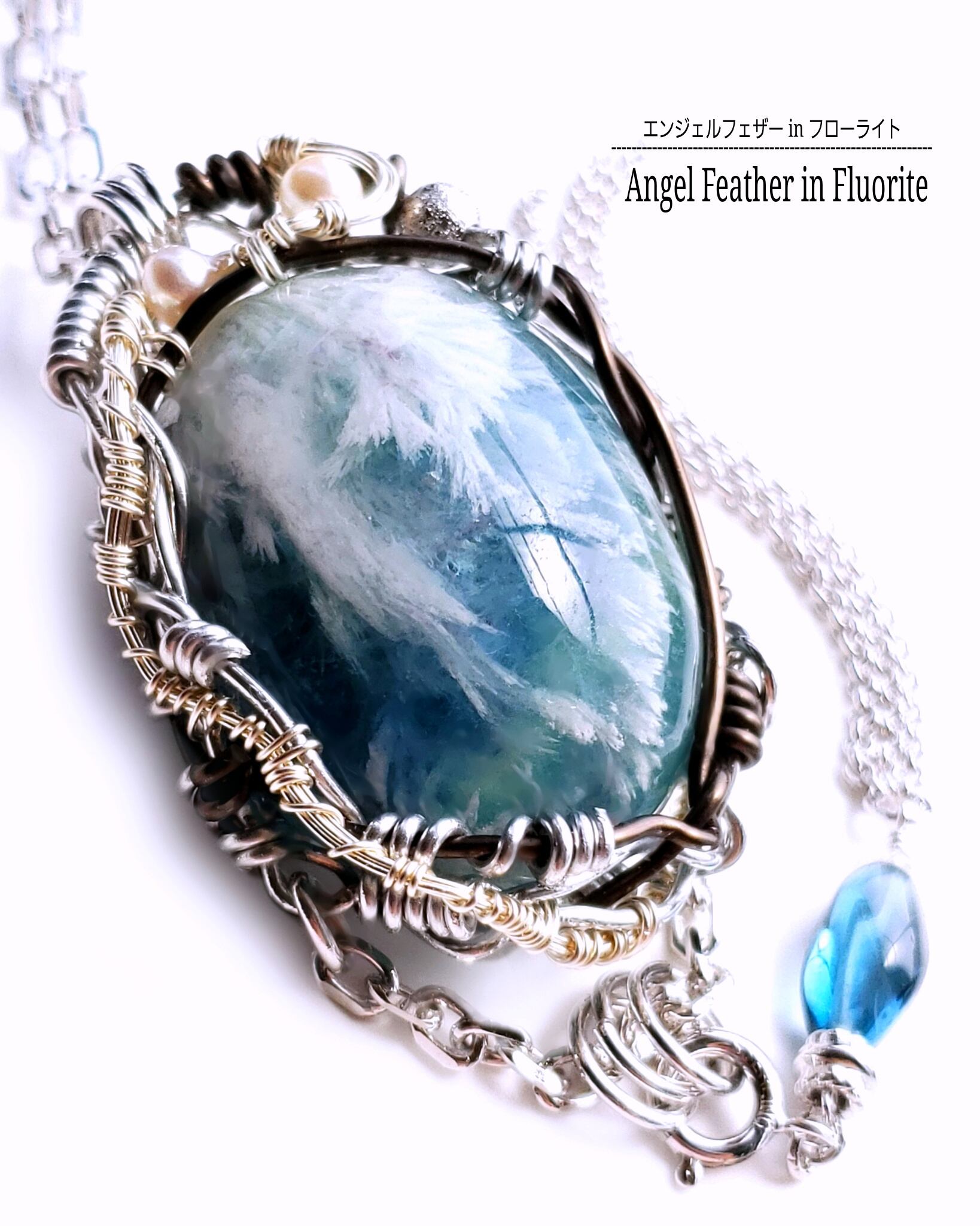 エンジェルフェザーinフローライト&ロンドンブルートパーズのワイヤーアート・ペンダント
