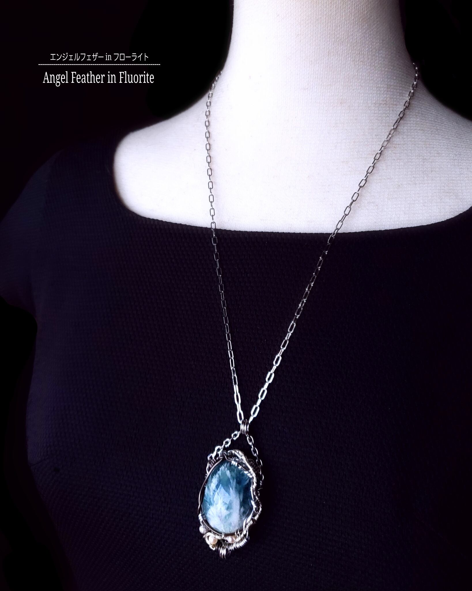 柔らかい羽を閉じ込めたようなエンジェルフェザーinフローライトと淡水パール、そして、ブルートパーズのタッセルチェーン付きチャームを組み合わせ、シルバーのアーティスティックワイヤーとブラックのアルマイト鍍金アルミ製のワイヤーを使用し、ペンダントトップにデザインしました。