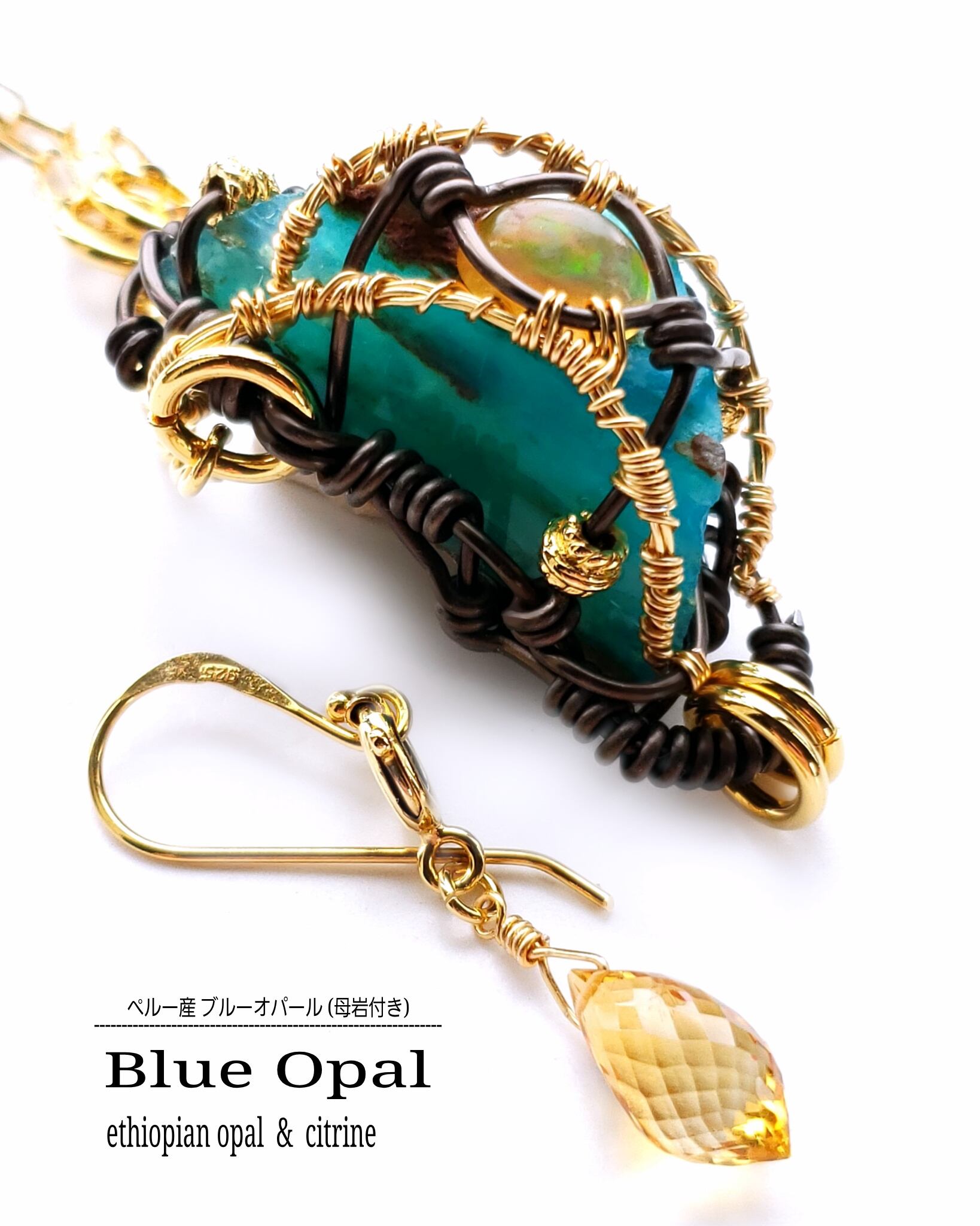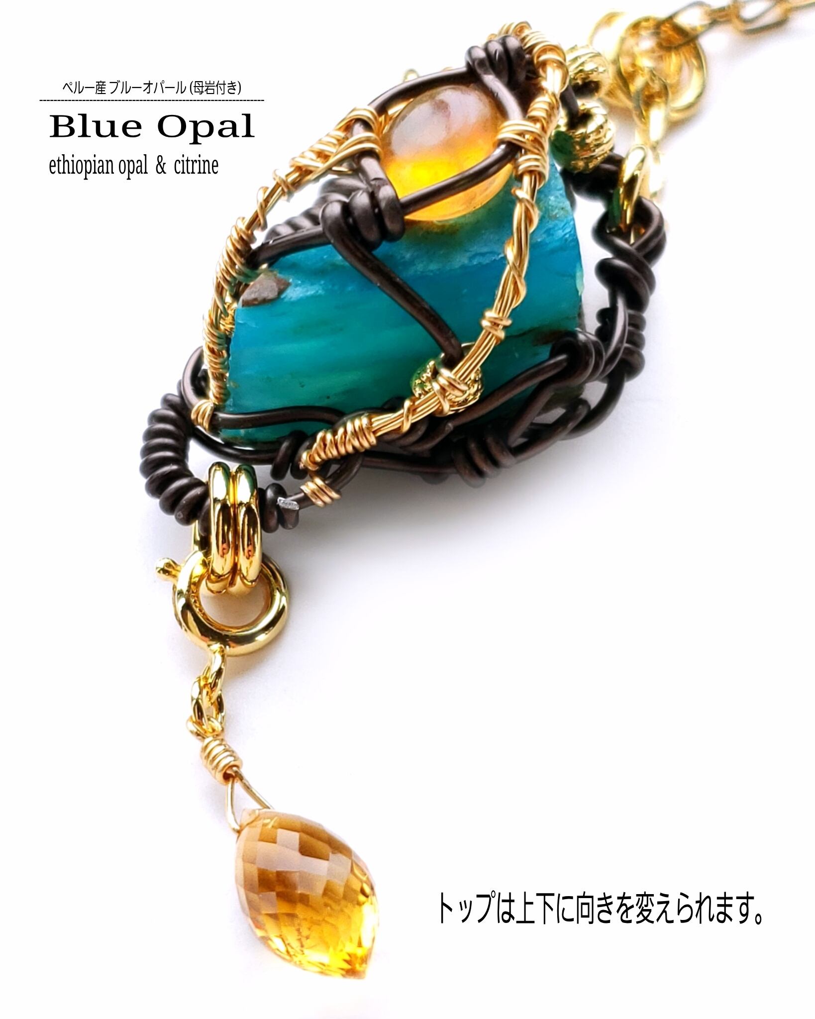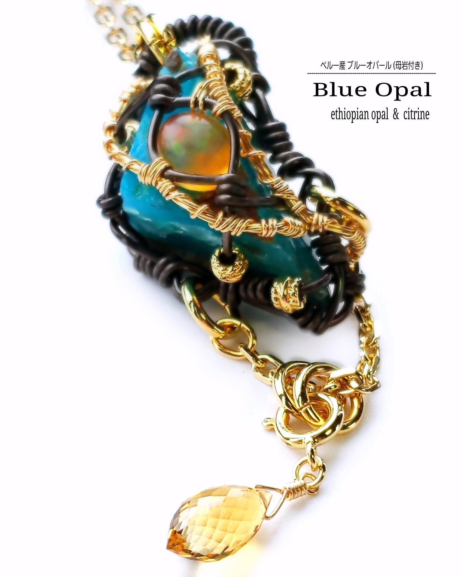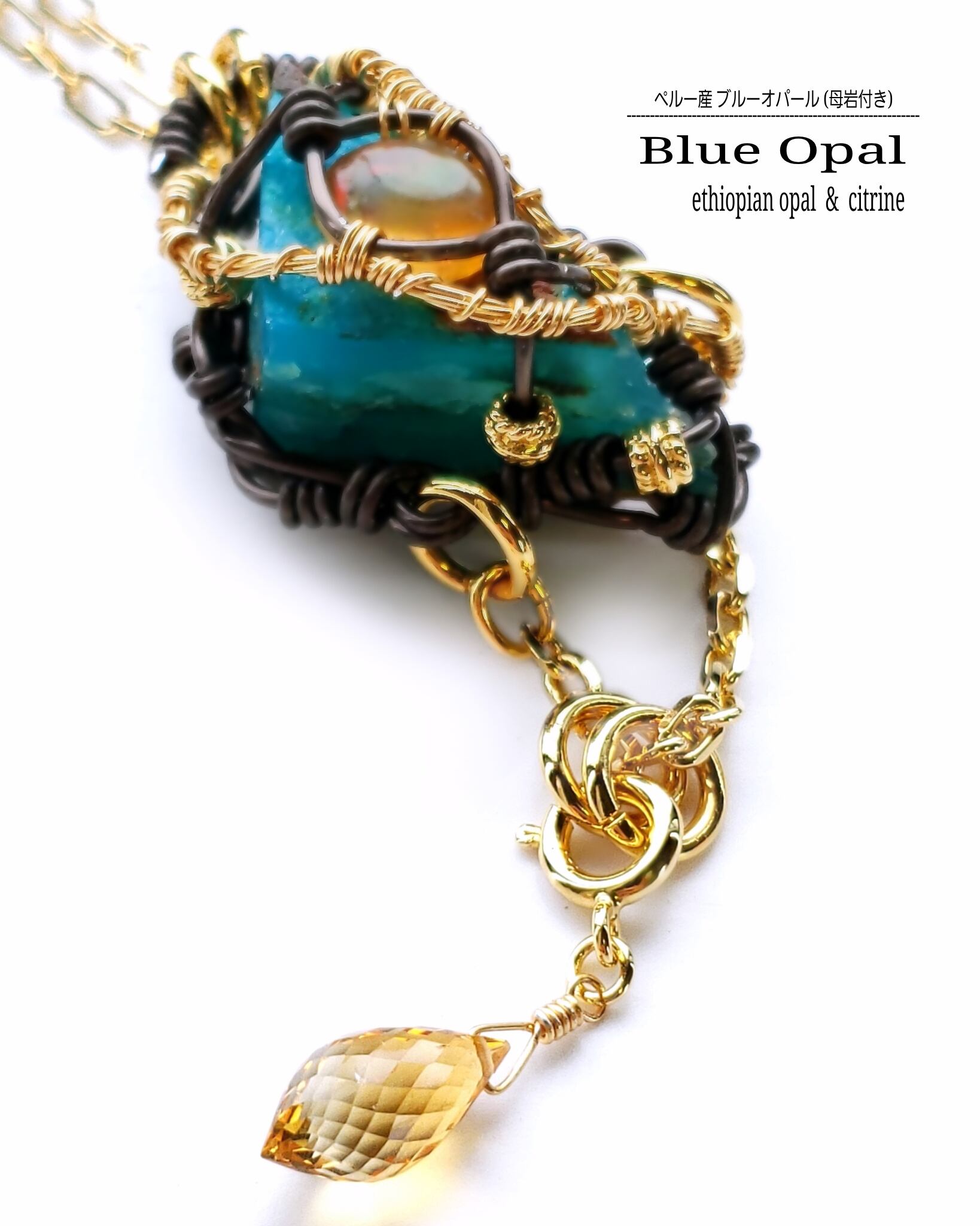 ペルー産の母岩付きブルーオパールとエチオピア産のオパール、そして、シリトリンのチャームを組み合わせ、シルバーのアーティスティックワイヤーとアルマイト鍍金アルミ製ワイヤーを使用し、ペンダントトップにデザインしました。