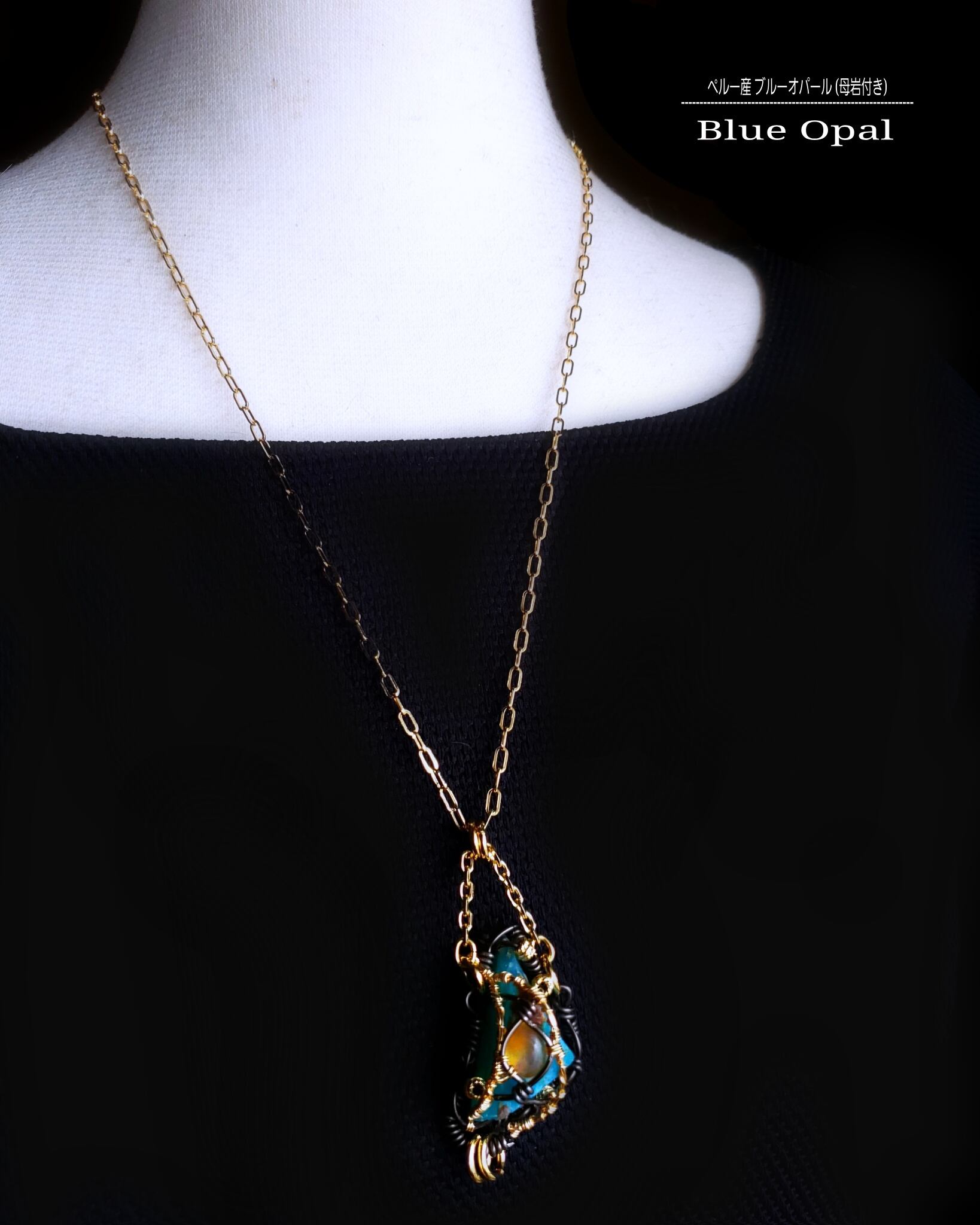 ペルー産ブルーオパール(母岩付き)のワイヤーアート・ペンダント