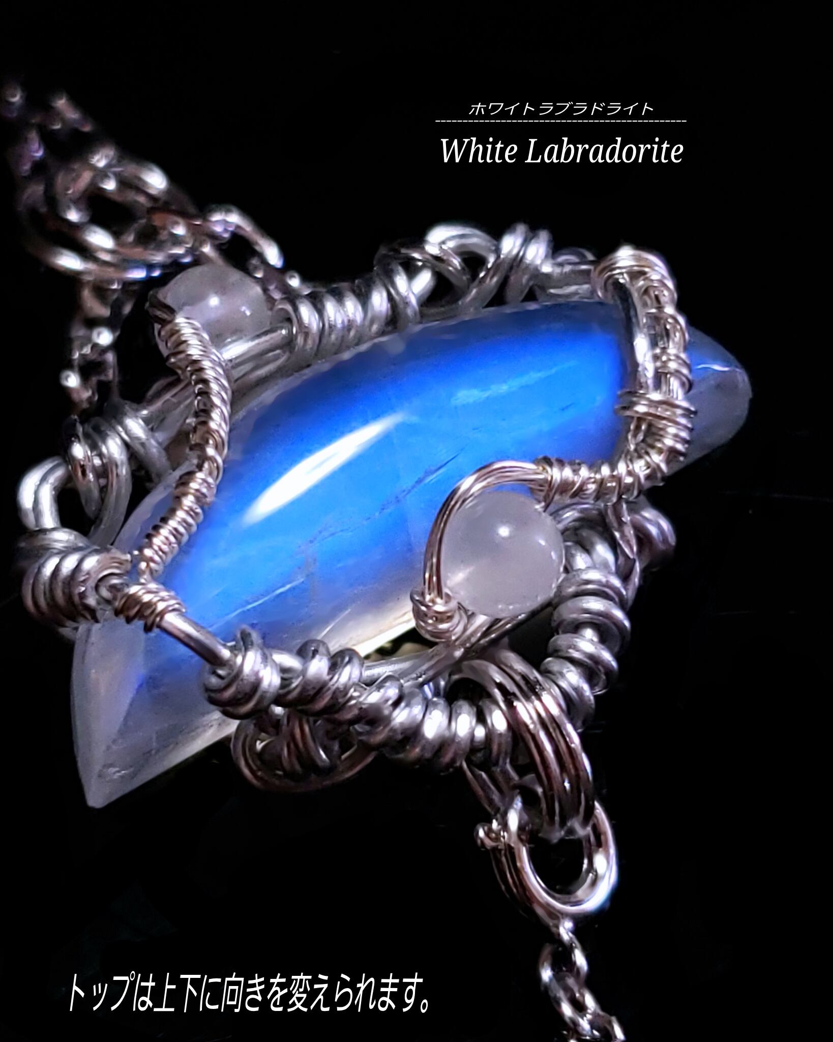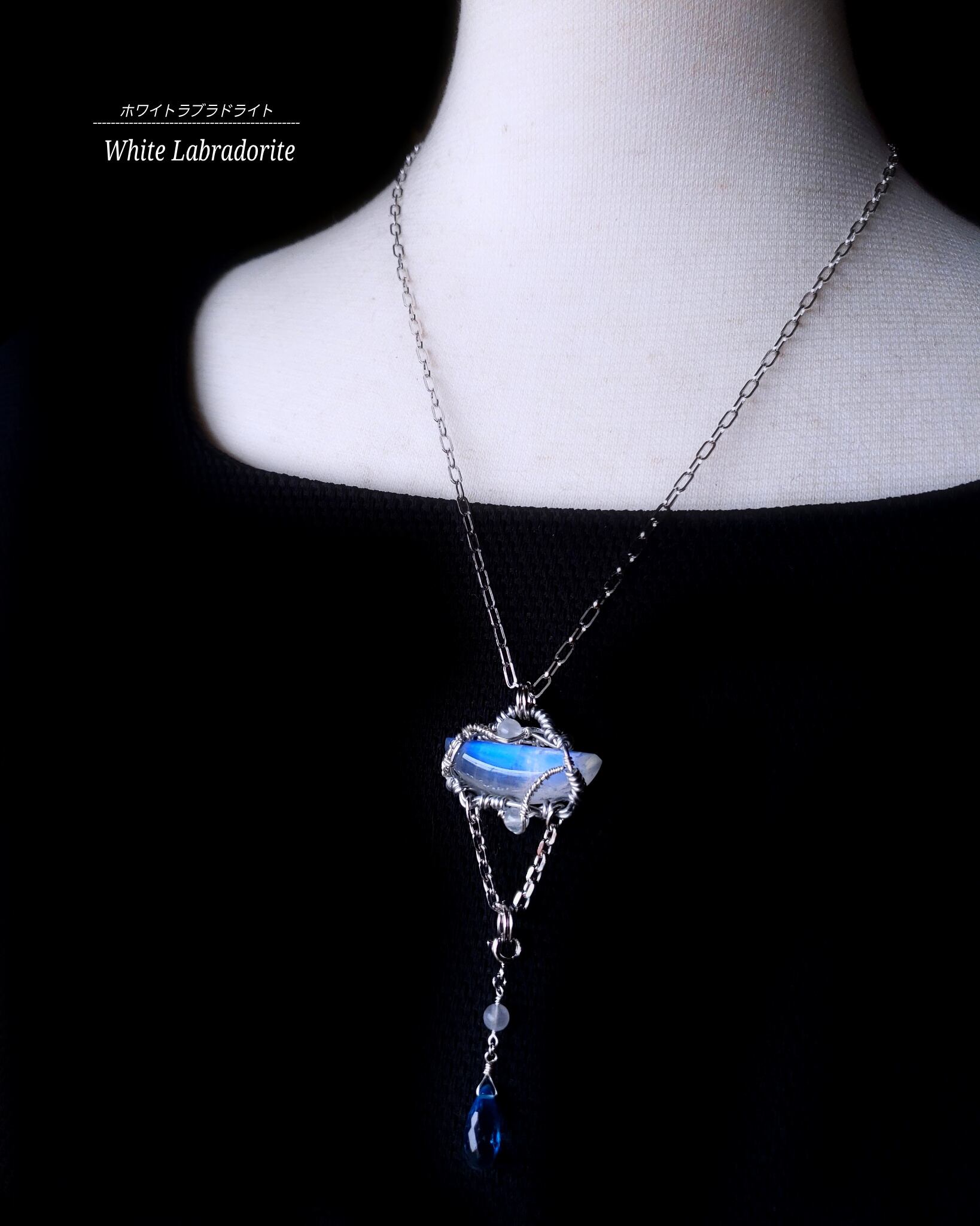 月のように青色の輝きが美しいホワイトラブラドライト、そして、ブルートパーズとホワイトラブラドライトのチャームを組み合わせ、シルバーのアーティスティックワイヤーとアルマイト鍍金アルミ製ワイヤーを使用し、ペンダントトップにデザインしました。