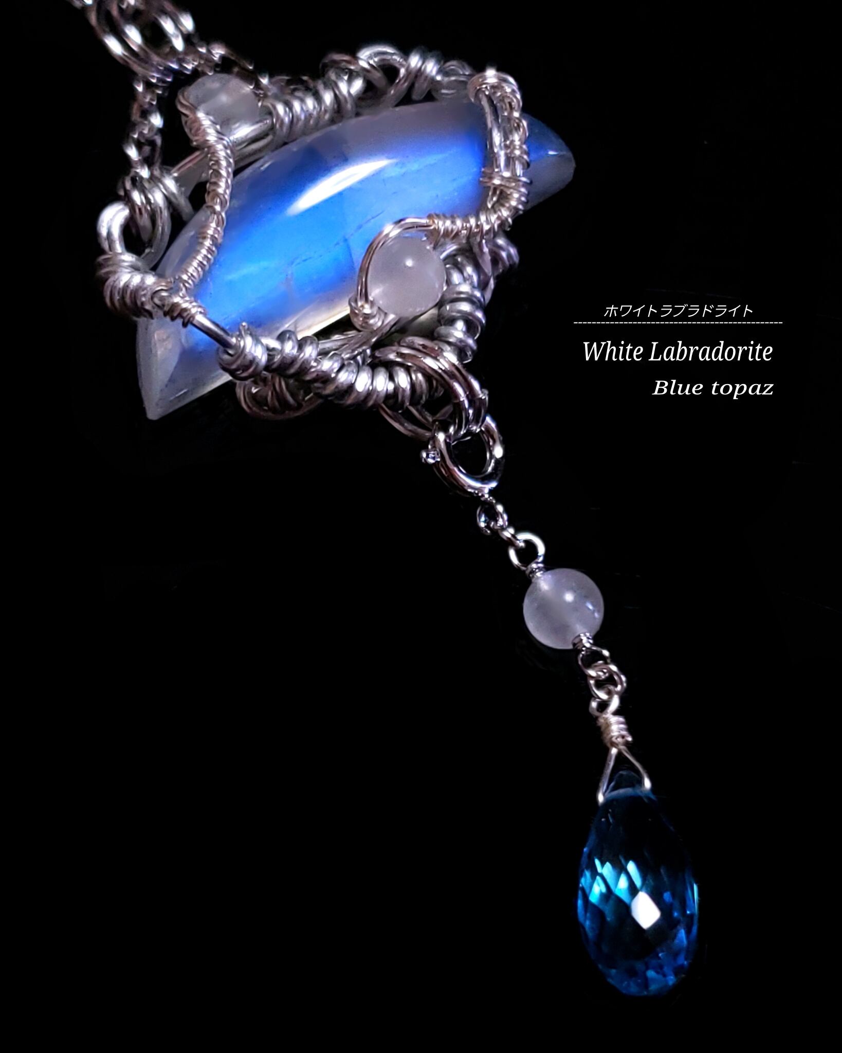ホワイトラブラドライト&ブルートパーズのワイヤーアート・ペンダント