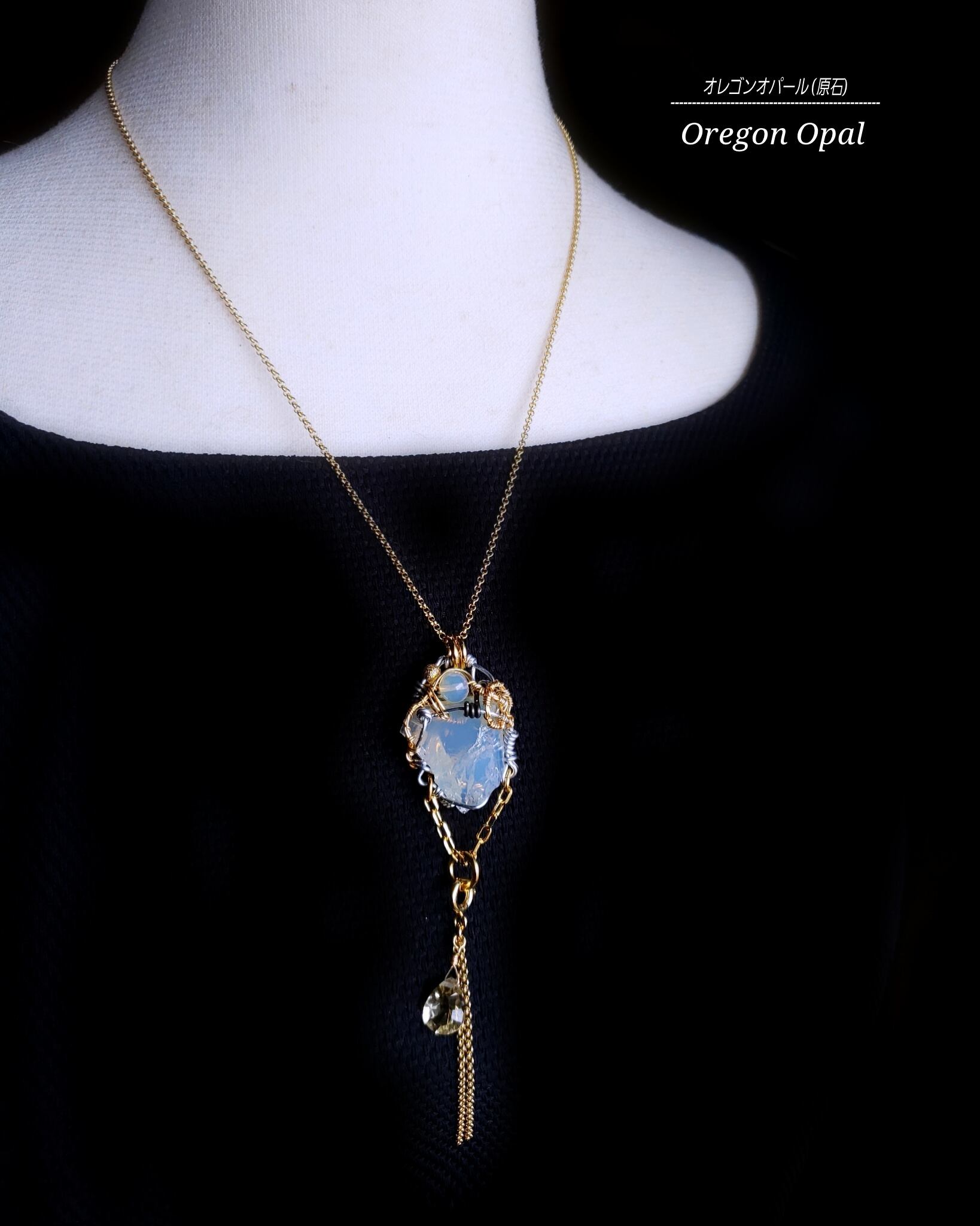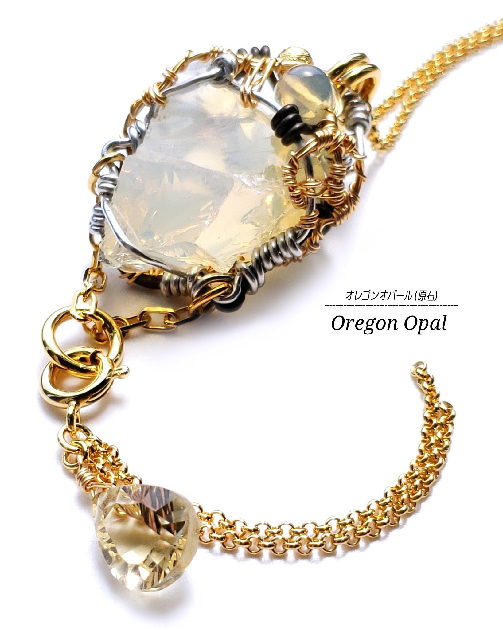 アメリカはオレゴン州産の半透明のオパールの原石とエチオピア産オパール、そして、シトリンのタッセルチェーン付きチャームを組み合わせ、ゴールドのアーティスティックワイヤーとアルマイト鍍金アルミ製ワイヤーを使用し、ペンダントトップにデザインしました。