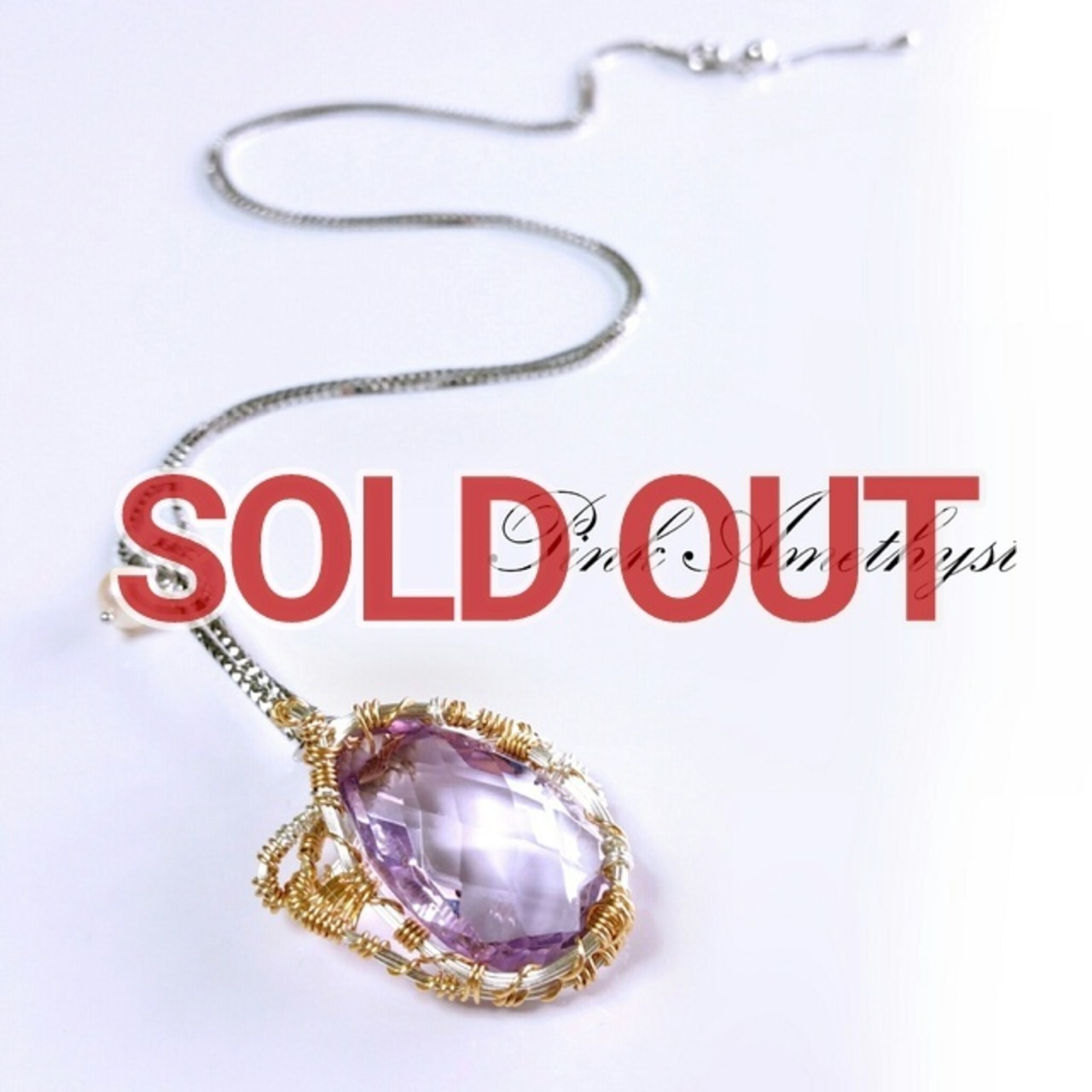 宝石質のピンクアメジストを、ゴールドとシルバーのアーティスティックワイヤーを使用し、ペンダントトップにデザインしました。