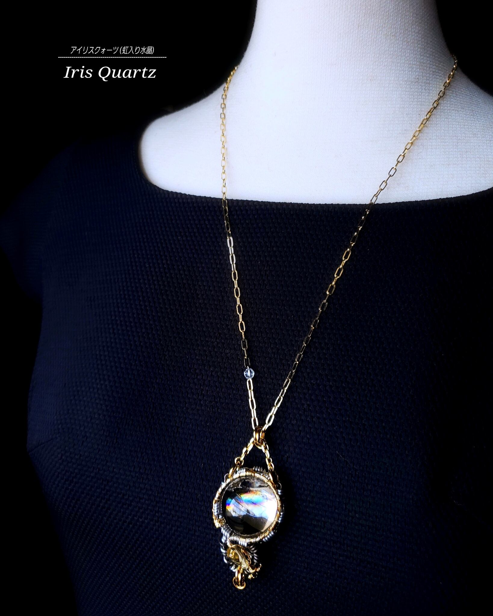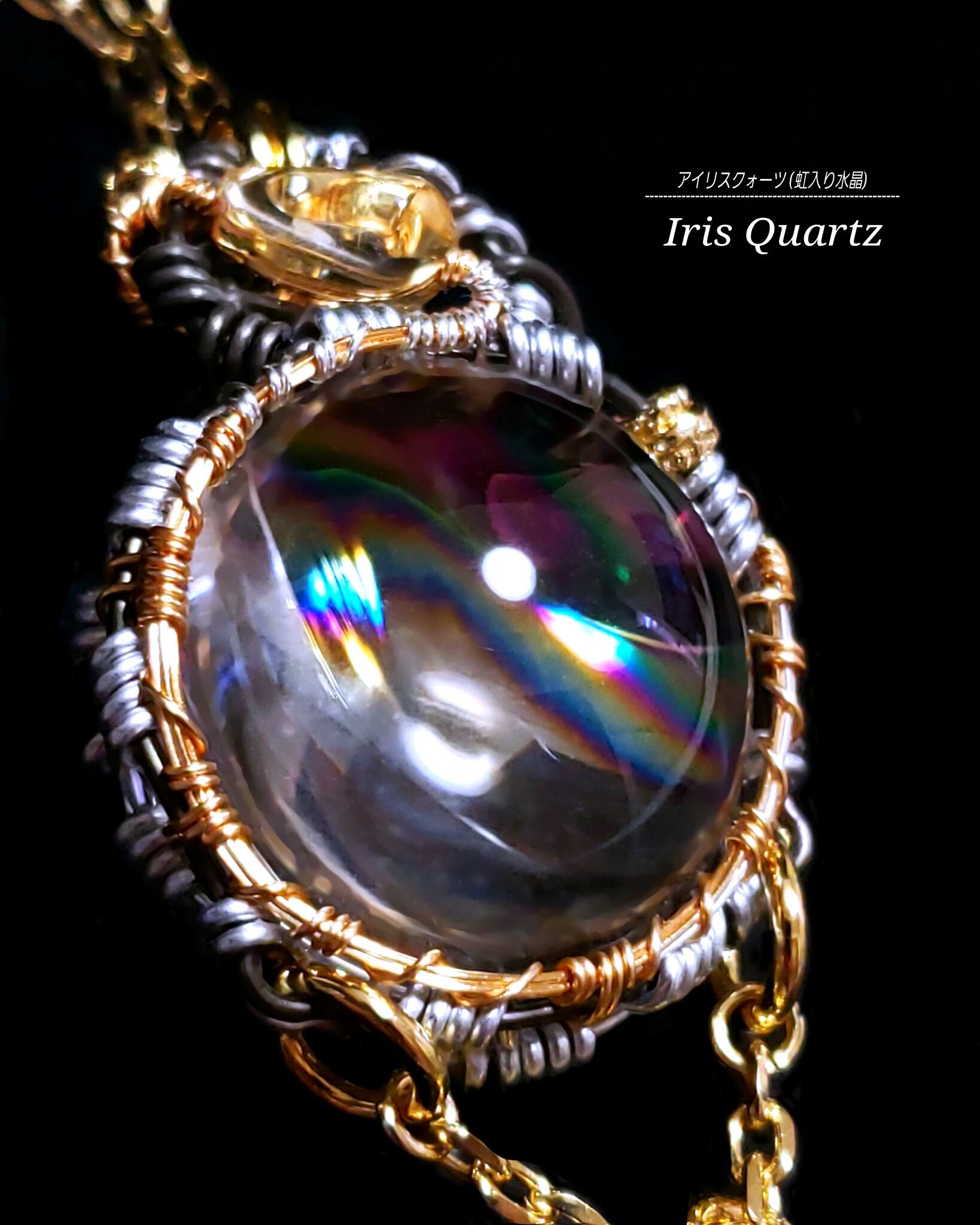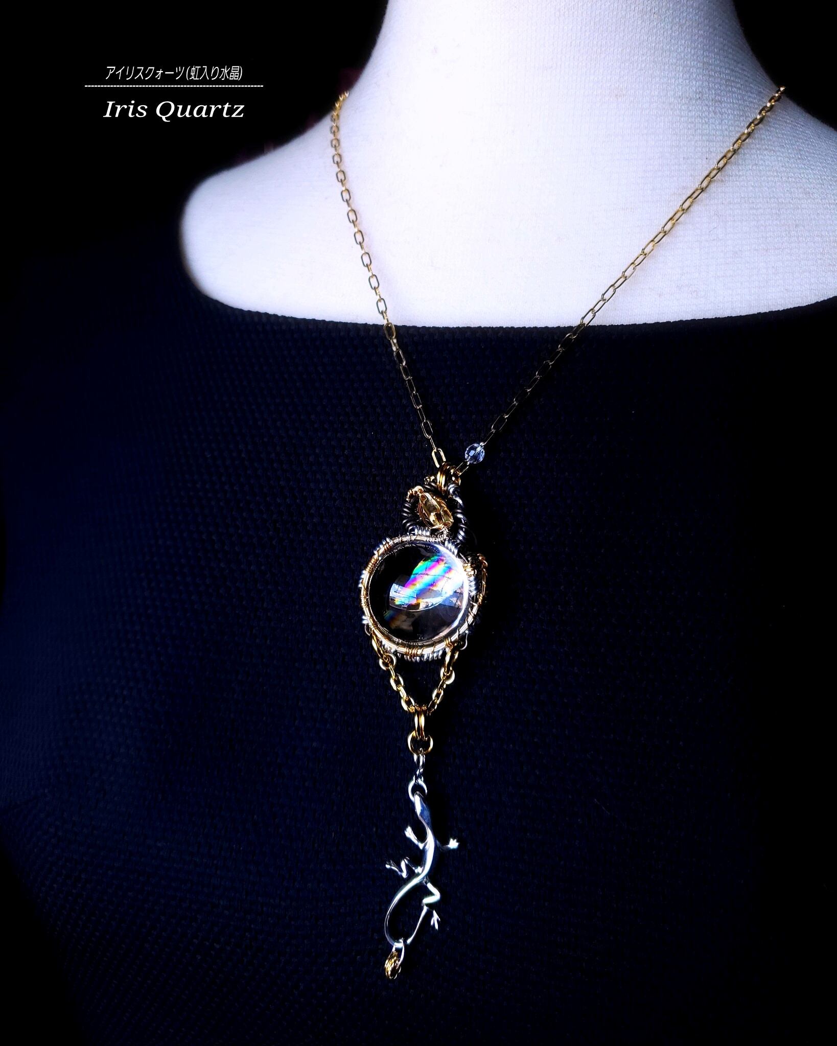 虹色の輝きが美しいアイリスクォーツにシトリン、そして、蜥蜴のチャームを組み合わせ、ゴールドのアーティスティックワイヤーとシルバーとブラックのアルマイト鍍金アルミ製のワイヤーを使用し、ペンダントトップにデザインしました。