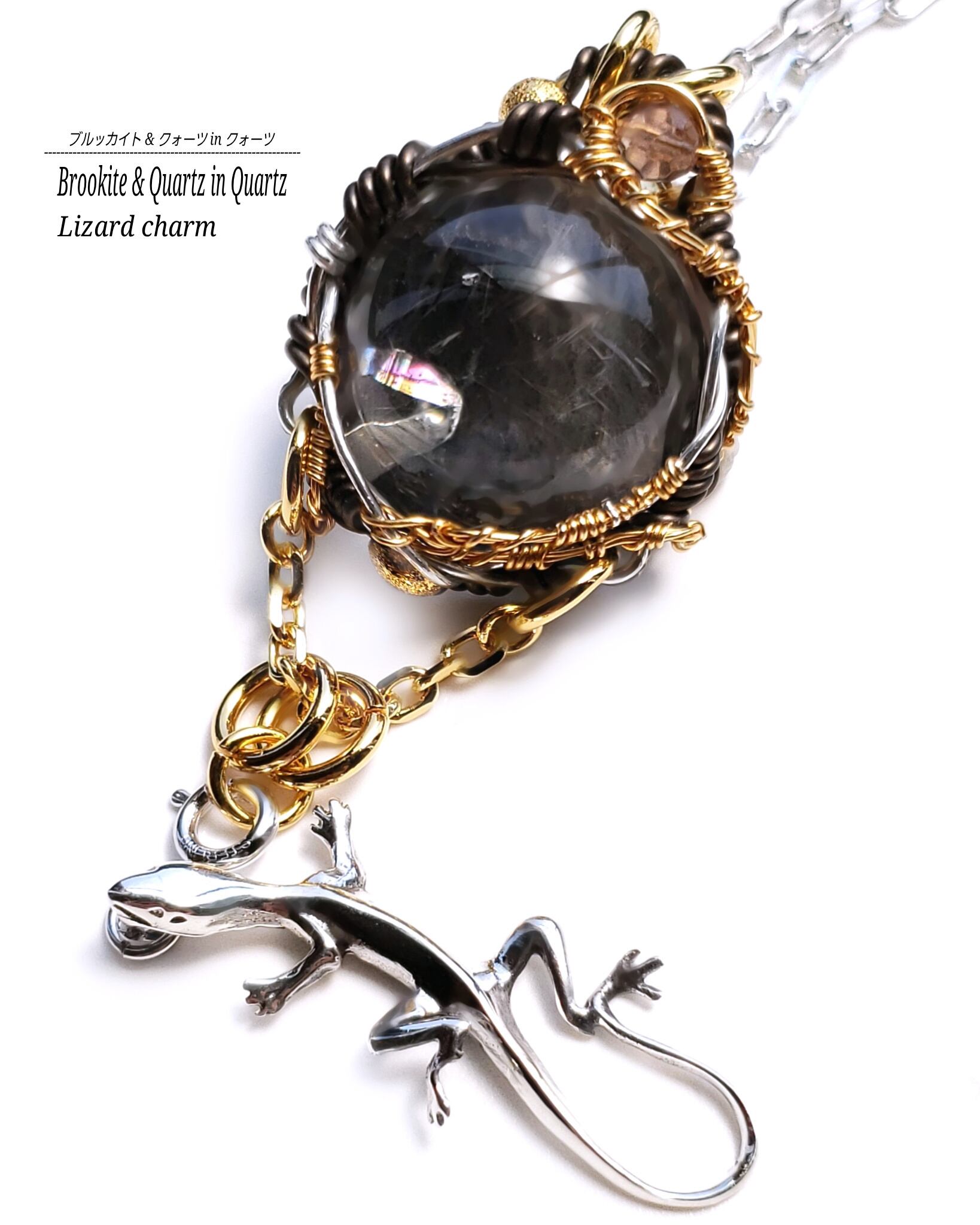 ブルッカイトから流れる結晶の中に、小さなクォーツの先端が虹色に輝く珍しいブルッカイト&クォーツinクォーツに、蜥蜴のチャームを組み合わせ、ゴールドのアーティスティックワイヤーと、ブラックのアルマイト鍍金アルミ製ワイヤーを使用し、ペンダントトップにデザインしました。