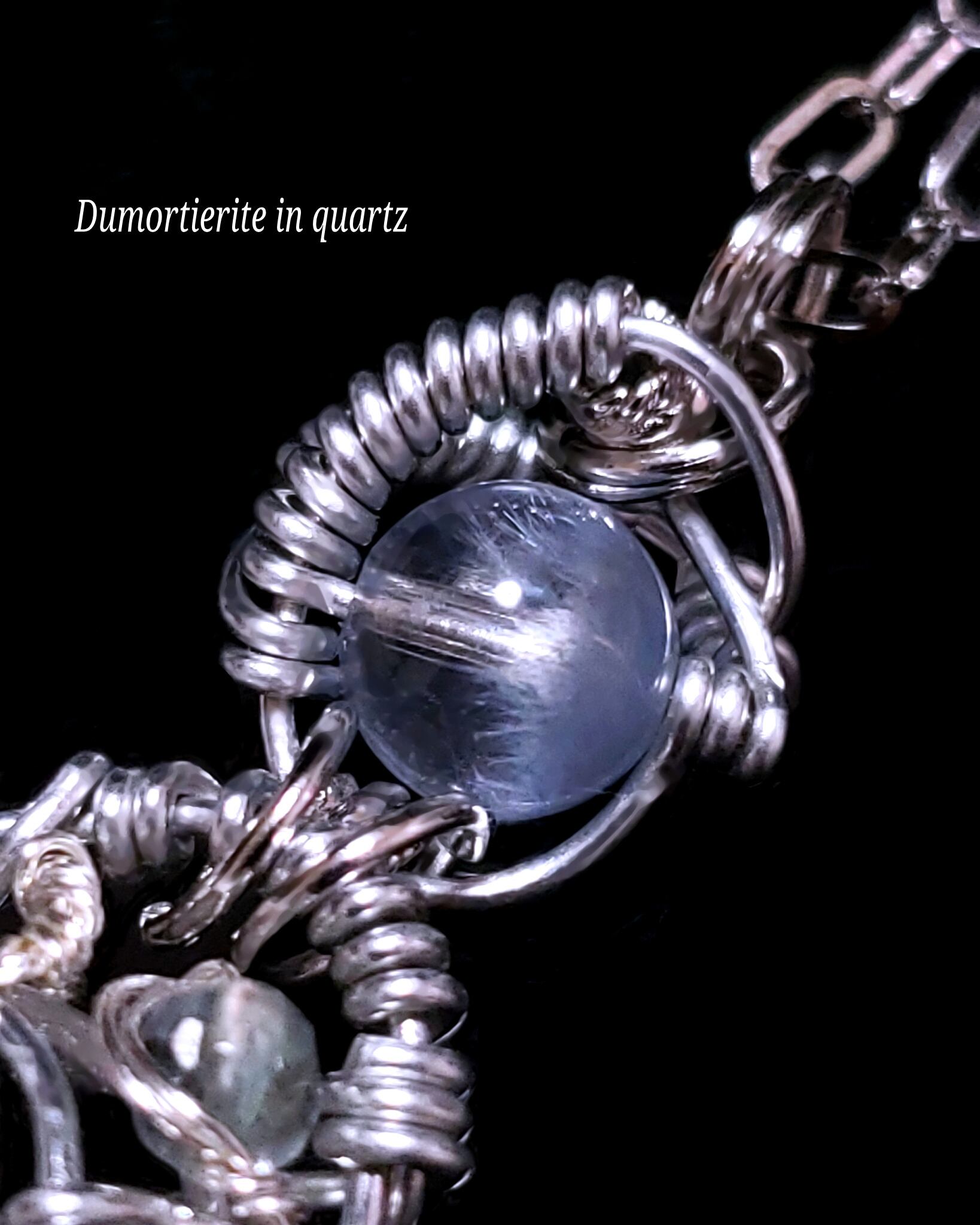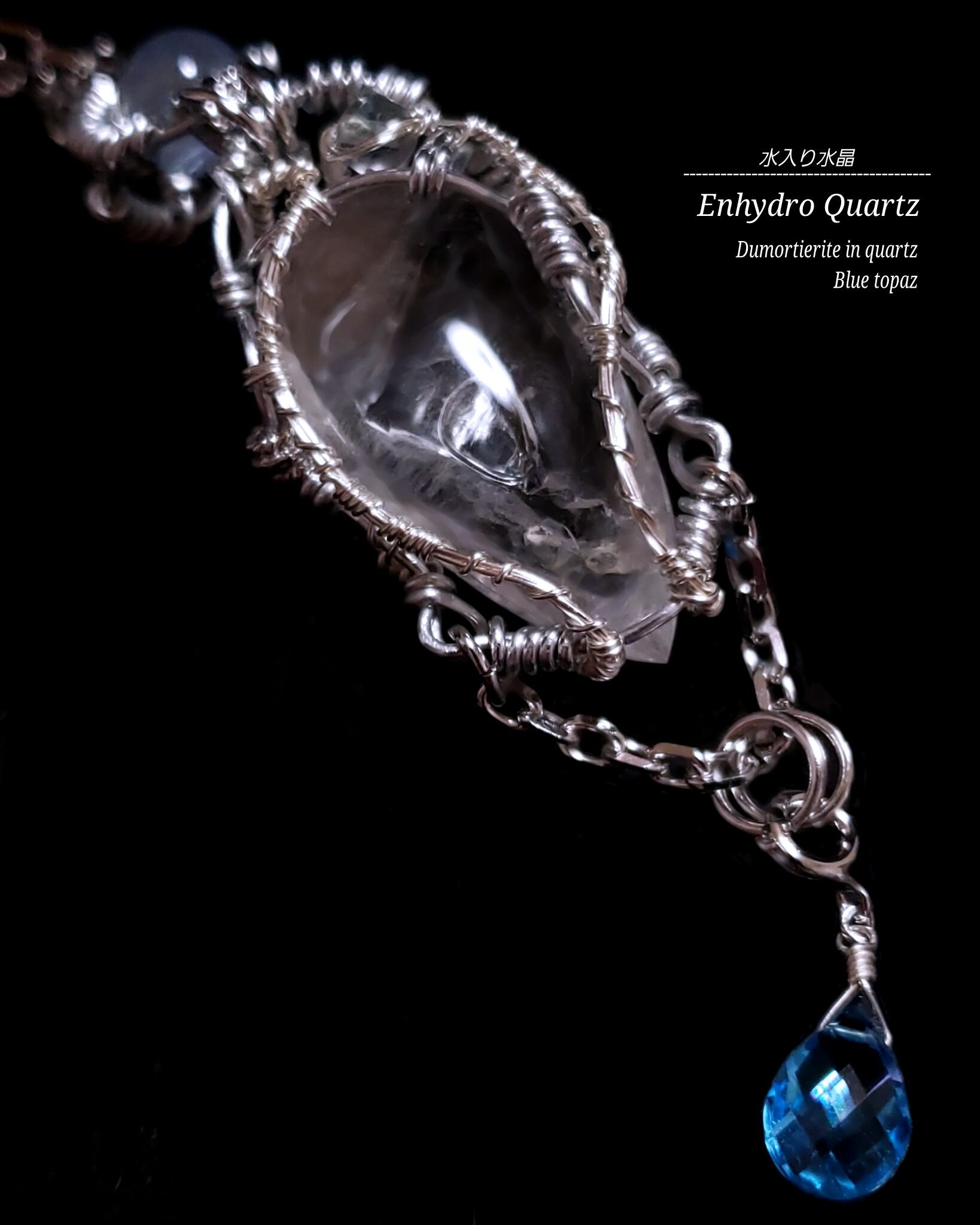 水入り水晶とデュモルチェライトinクォーツ、そして、ブルートパーズのチャームを組み合わせ、シルバーのアーティスティックワイヤーとアルマイト鍍金アルミ製ワイヤーを使用し、ペンダントトップにデザインしました。