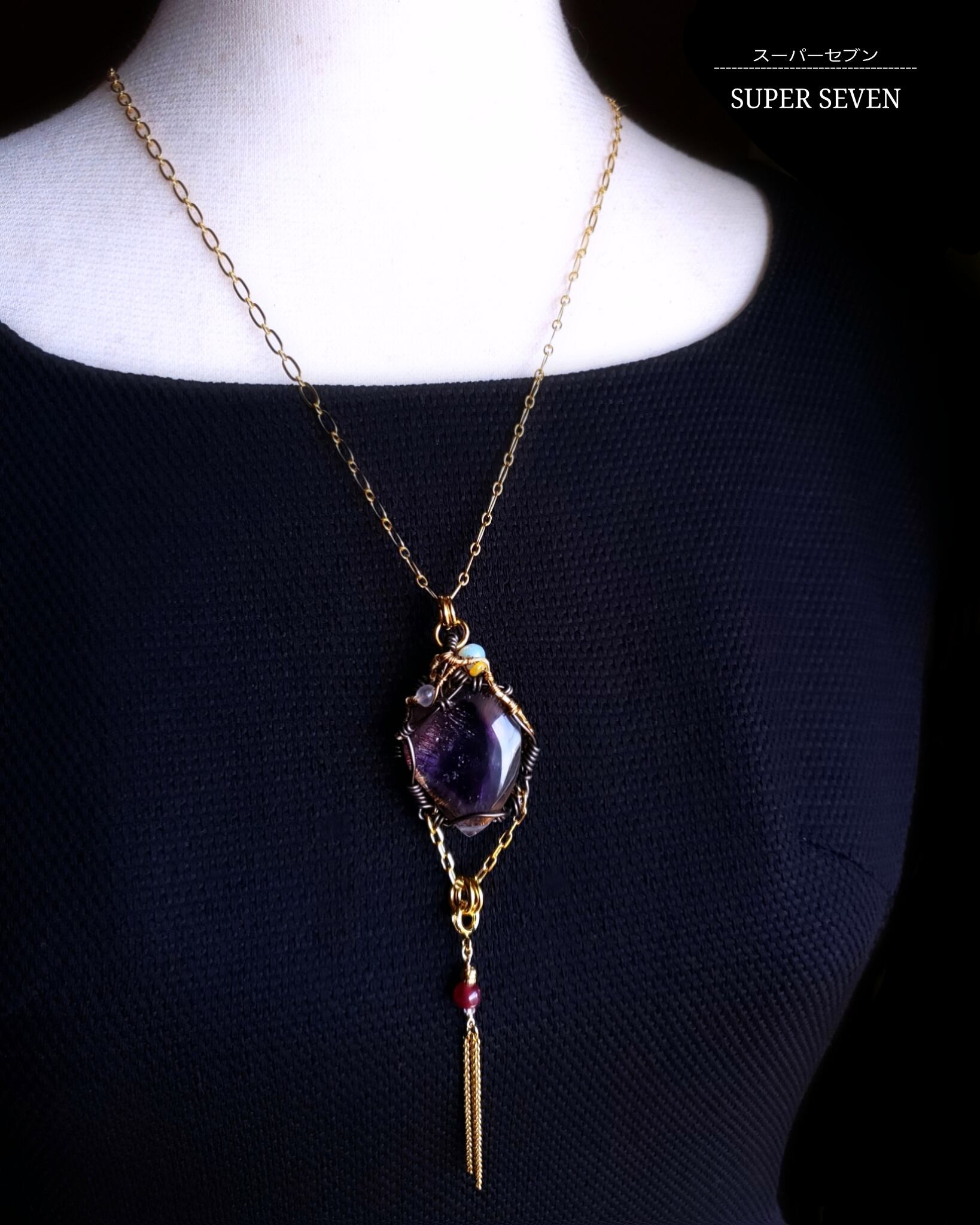 アメジストのファントムが浮かぶスーパーセブン(セイクリッドセブン)とエチオピア産オパールとムーンストーン、そして、ルビーのタッセルチェーン付きチャームを組み合わせ、ゴールドのアーティスティックワイヤーと、ブラックのアルマイト鍍金アルミ製ワイヤーを使用し、ペンダントトップにデザインしました。