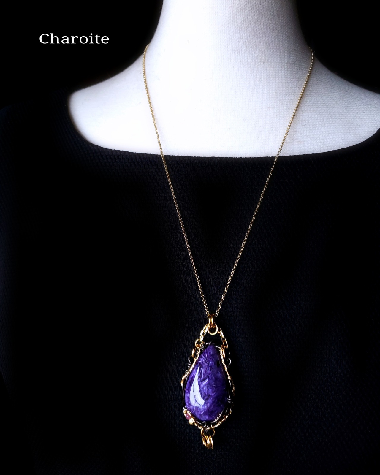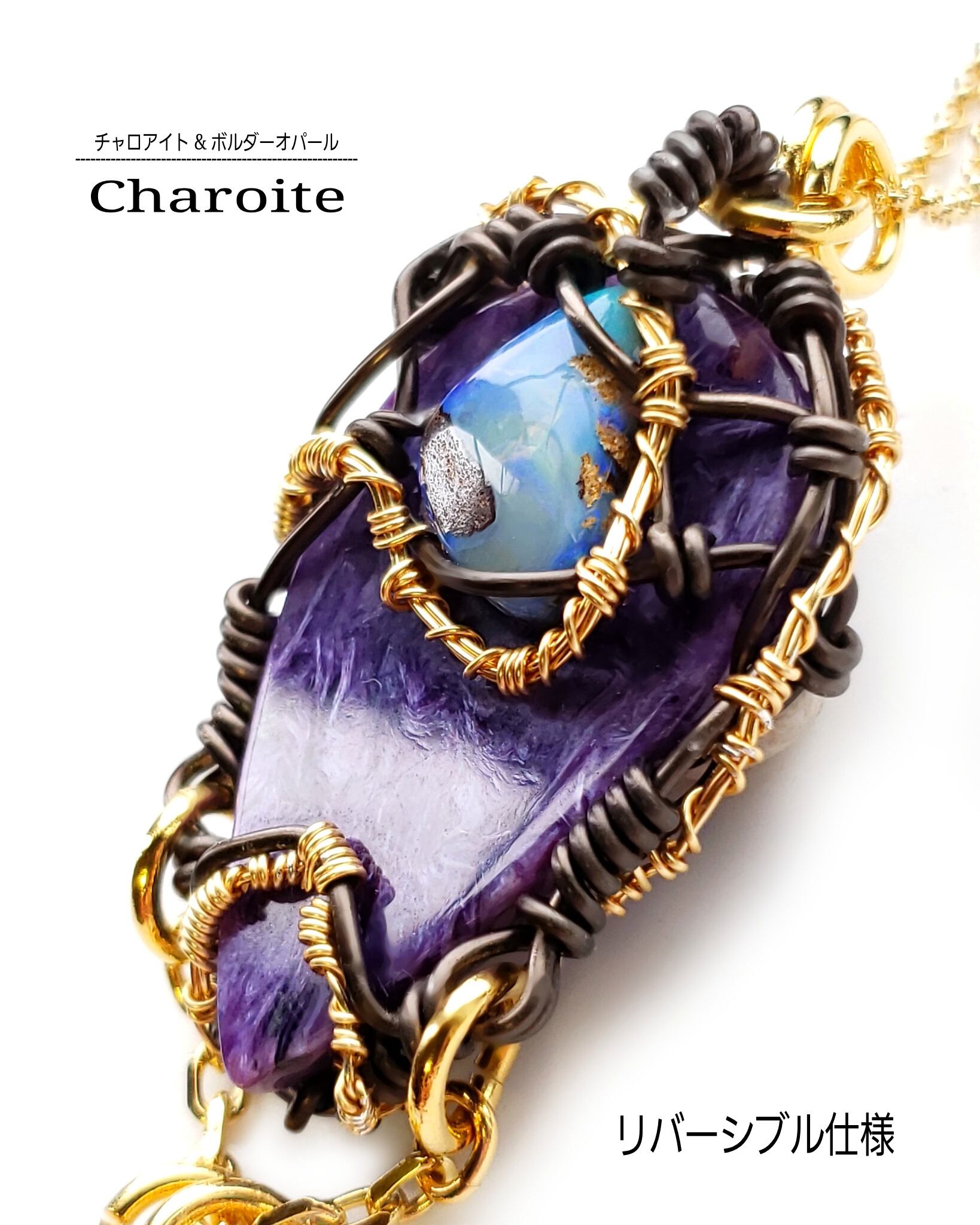濃い紫色からラベンダー色が混ざり合った艶やかなチャロアイトとオーストラリア産ボルダーオパールとピンクトルマリン、そして、ルビーのチャームをを組み合わせ、ゴールドのアーティスティックワイヤーとブラックのアルマイト鍍金アルミ製ワイヤーを使用し、ペンダントトップにデザインしました。