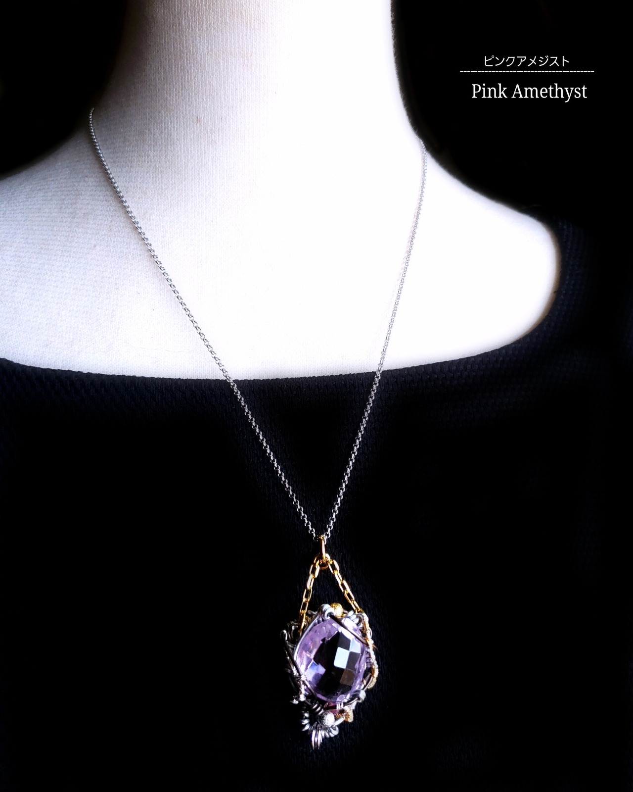 透明感あふれるピンクアメジストと裏面にピンクトルマリンとフローライト、そして、ロードクロサイトのチェーンタッセル付きチャームを組み合わせ、シルバーのアーティスティックワイヤーとアルマイト鍍金アルミ製ワイヤーを使用し、ペンダントトップにデザインしました。