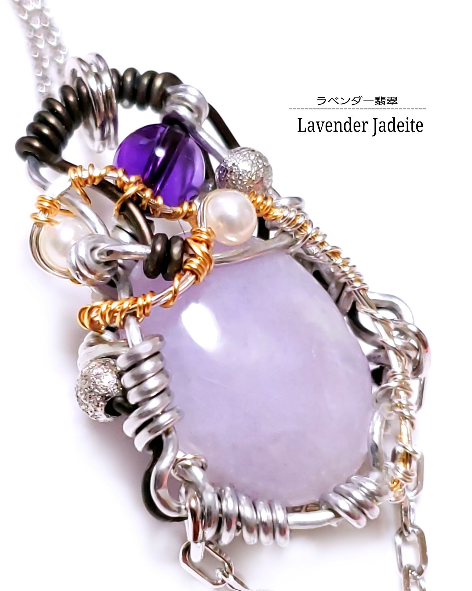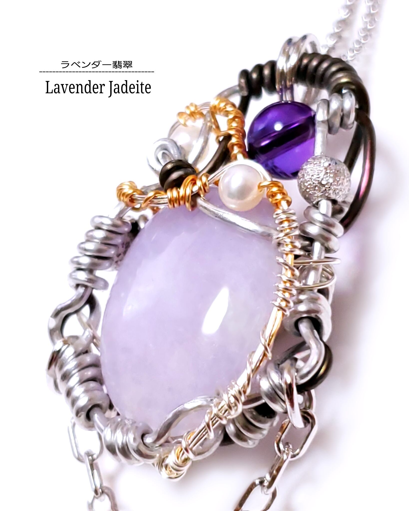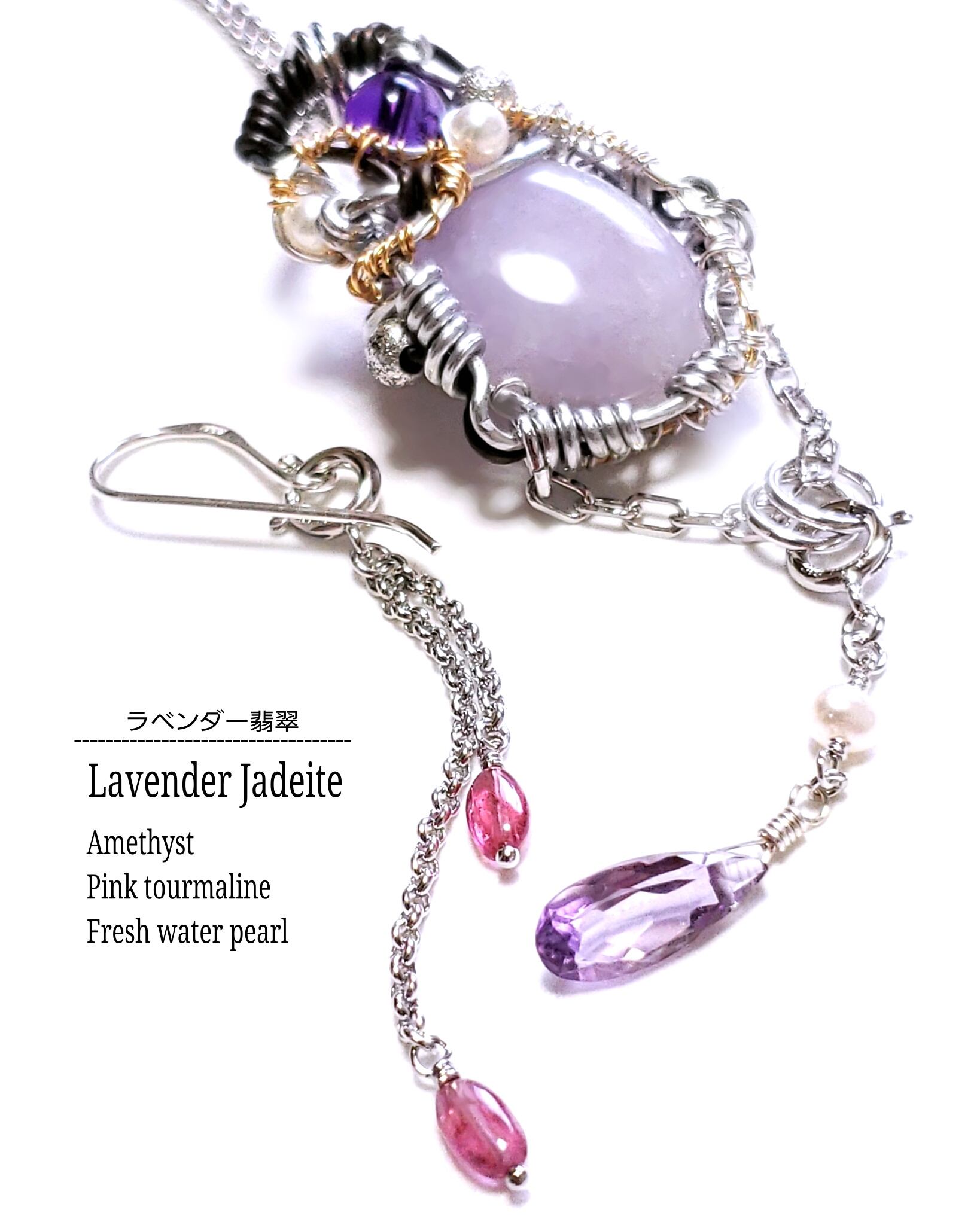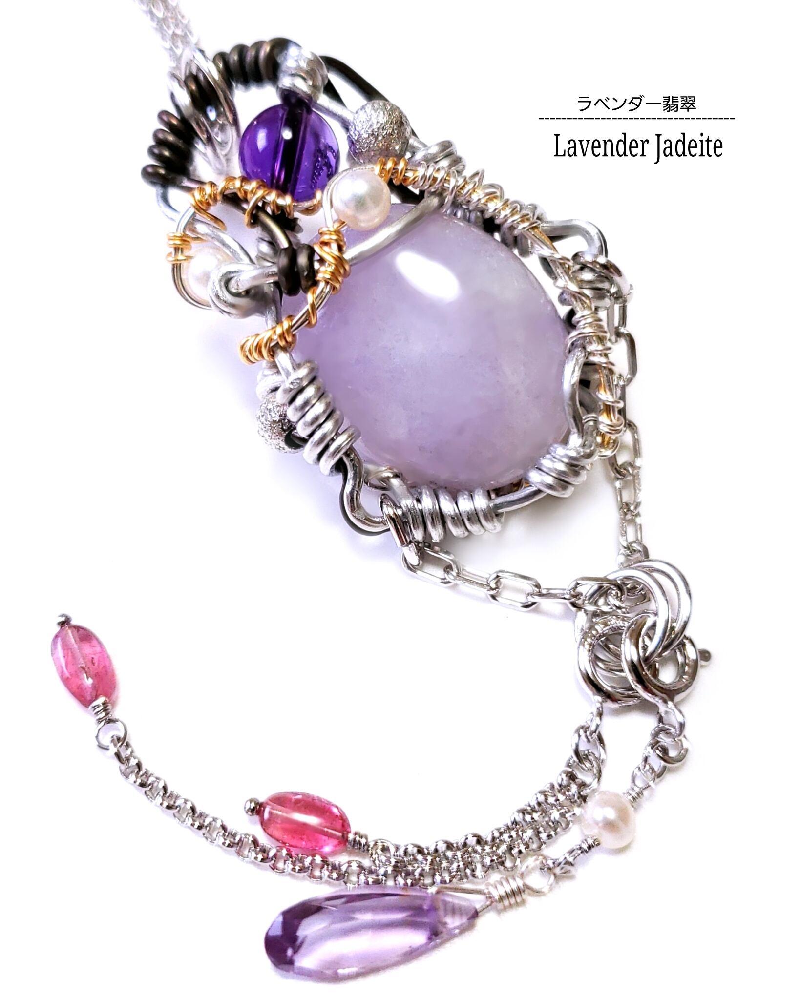 淡いラベンダー色の翡翠にアメジストと淡水パール、そして、アメジストとピンクトルマリンのチャームを組み合わせて、シルバーのアーティスティックワイヤーとアルマイト鍍金アルミ製ワイヤーを使用し、ペンダントトップにデザインしました。