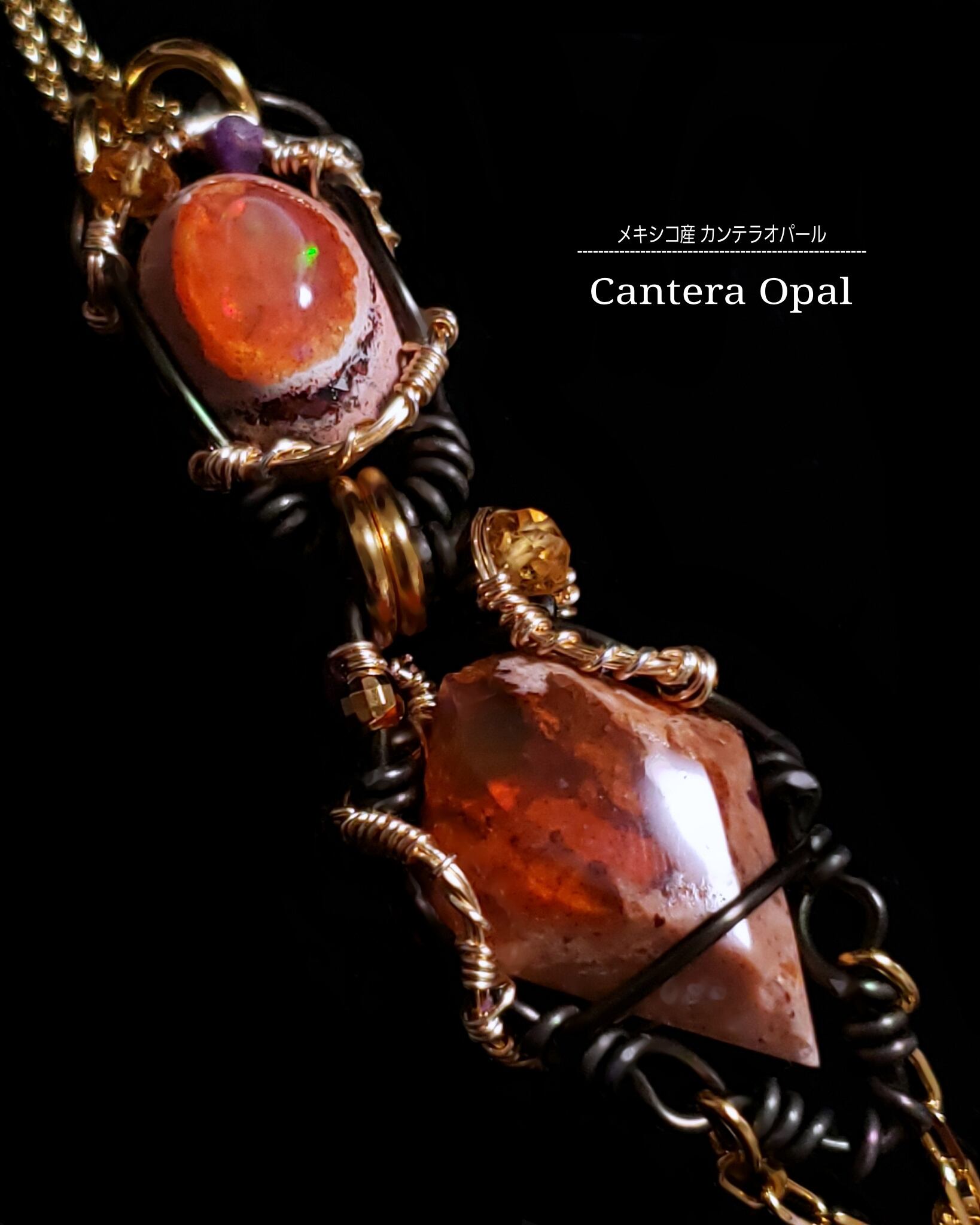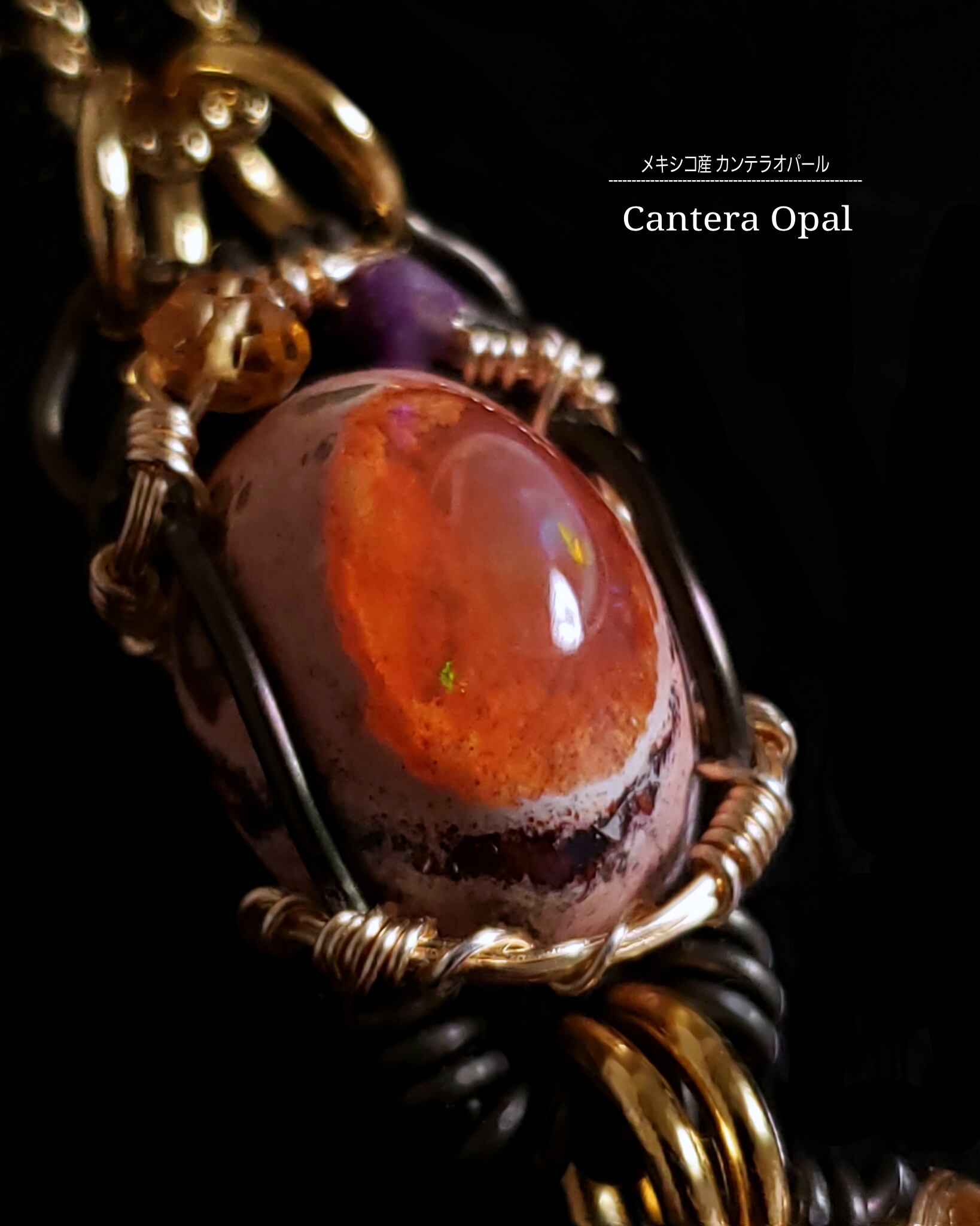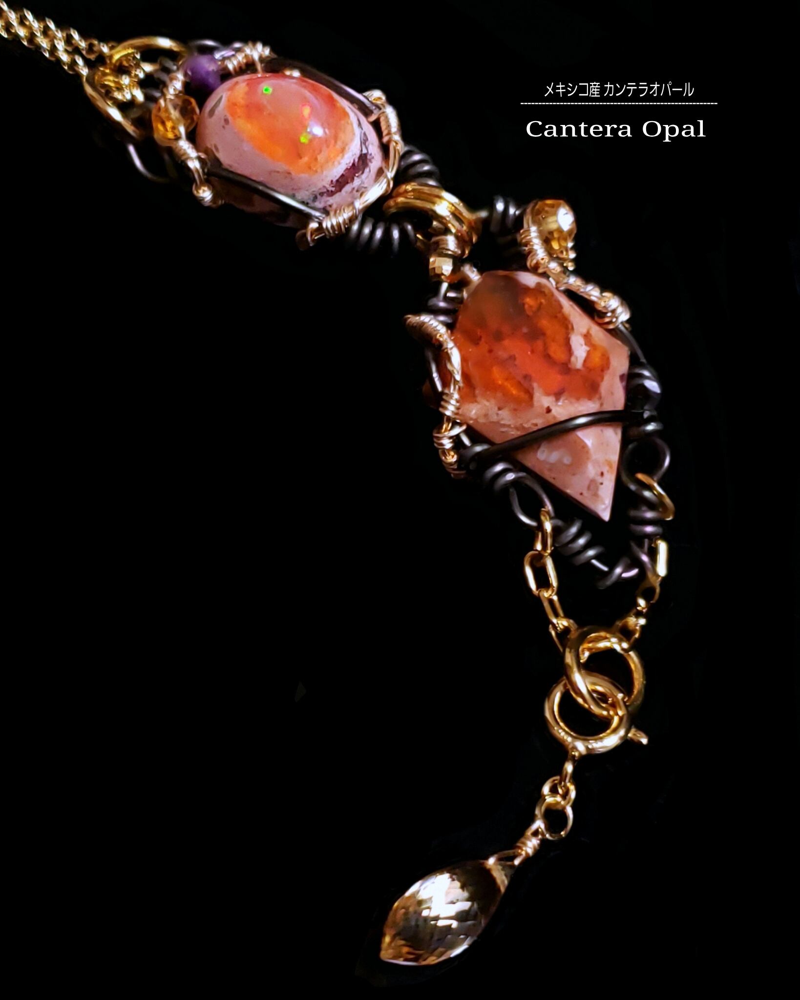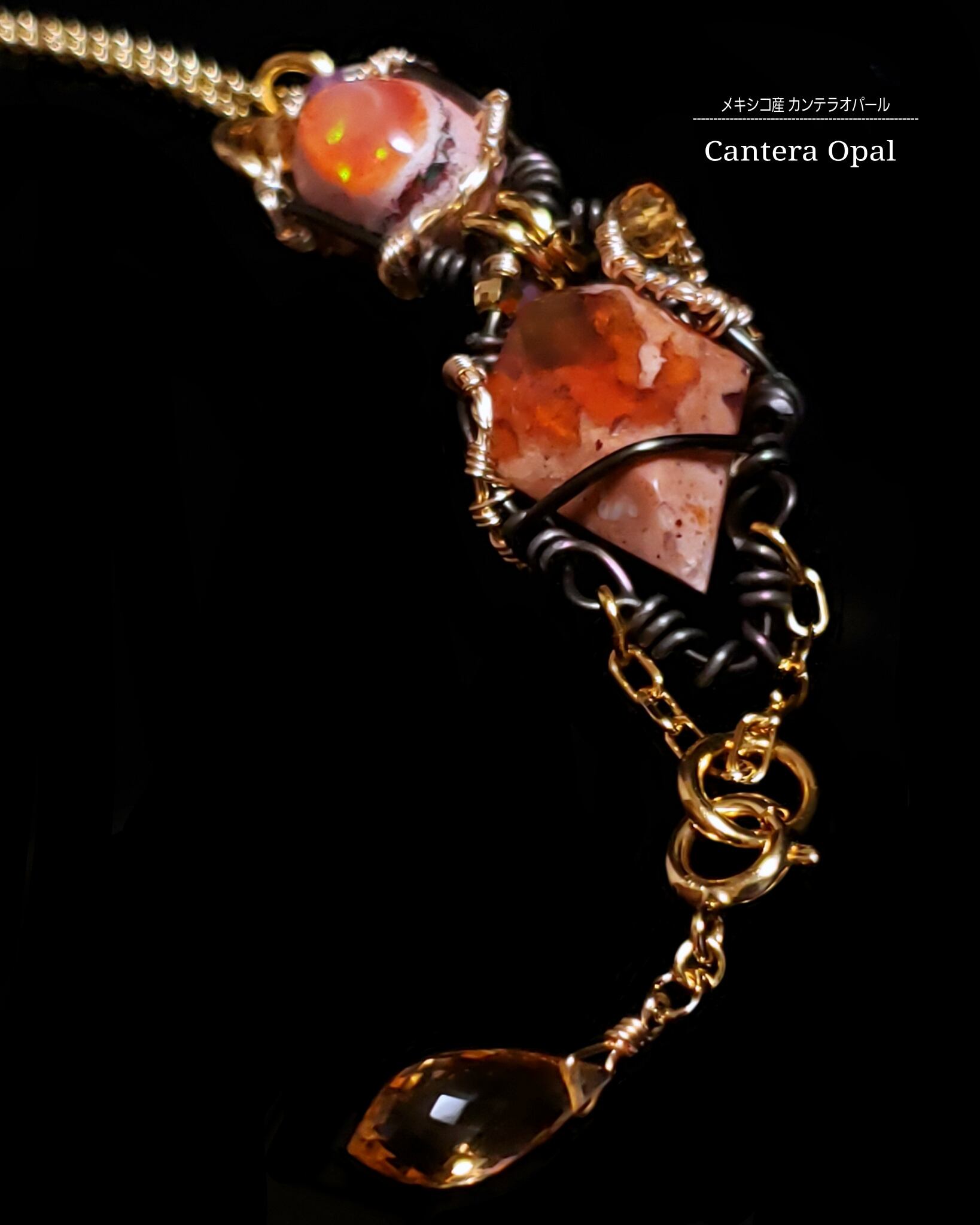 メキシコ産のカンテラオパールとシトリンとフローライト、そして、シトリンのチャームを組み合わせ、ゴールドのアーティスティックワイヤーとブラックのアルマイト鍍金アルミ製ワイヤーを組み合わせ、ペンダントトップにデザインしました。