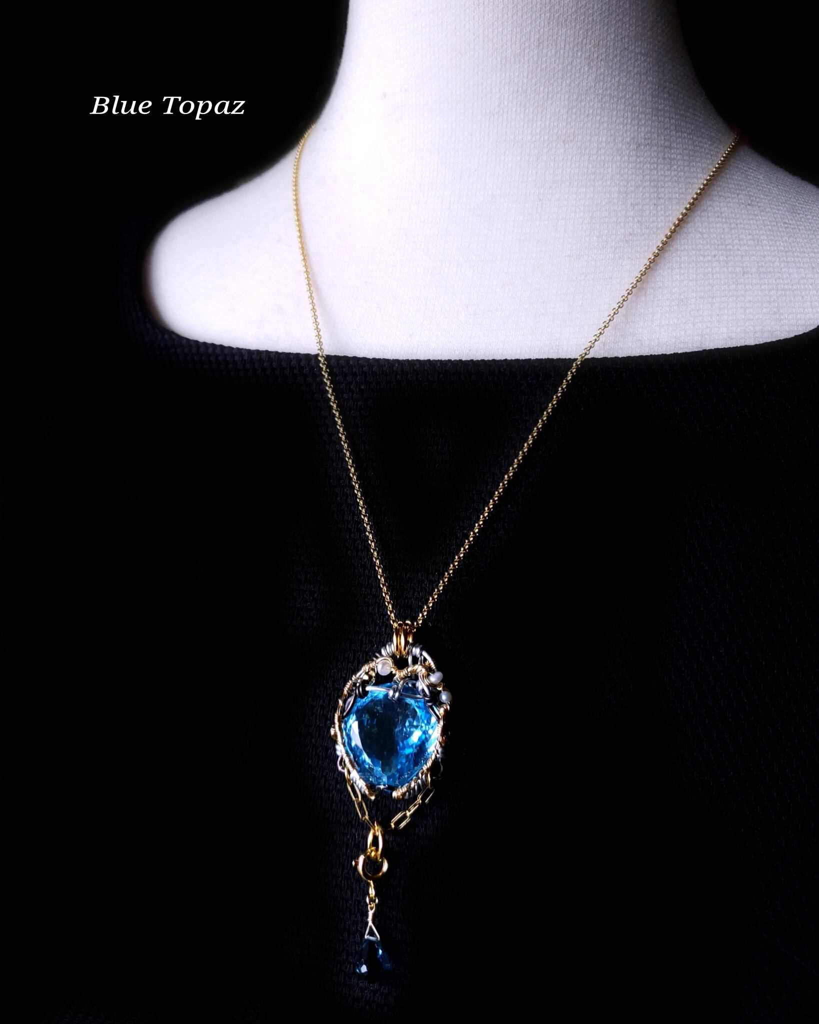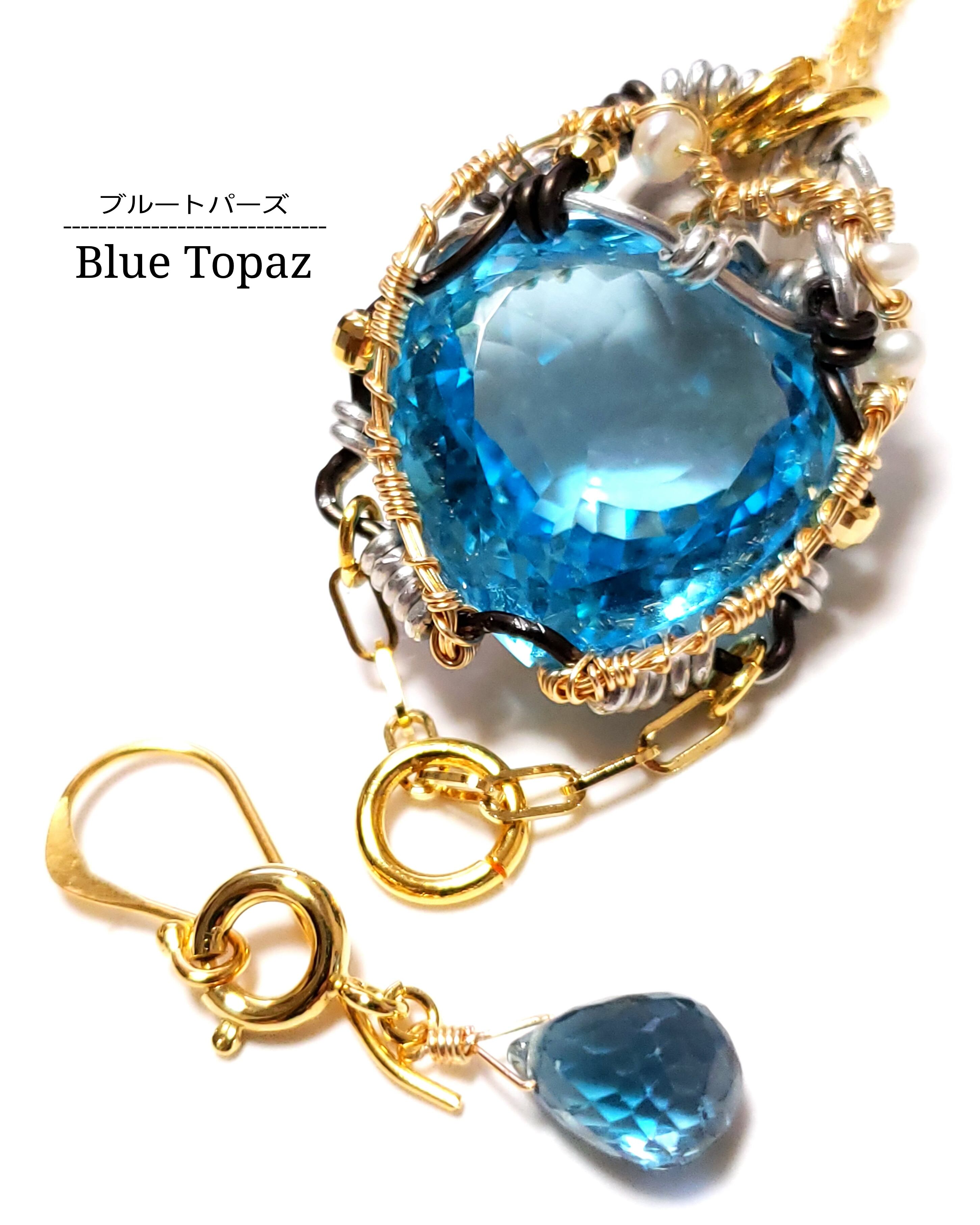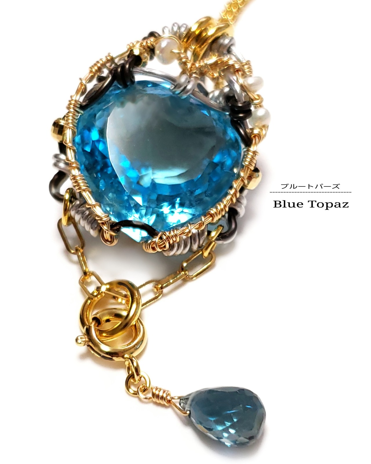 透明感あふれる大変に大ぶりのブルートパーズと淡水パール、そして、ブルートパーズのチャームを組み合わせ、ゴールドのアーティスティックワイヤーとアルミワイヤーを使用して、ペンダントトップにデザインしました。