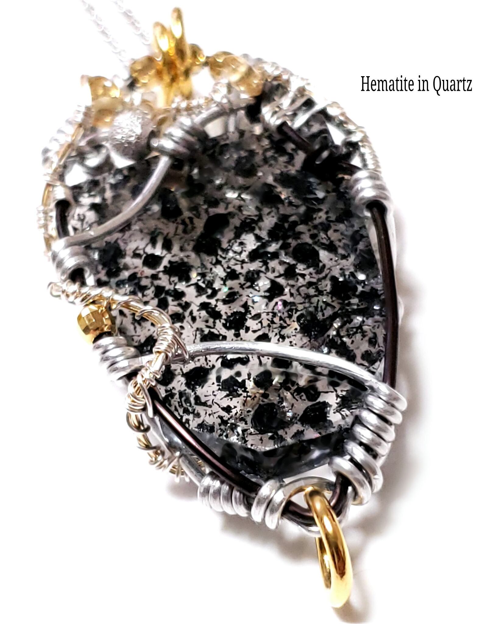 水晶の内部に黒色や銀灰色したヘマタイト(赤鉄鉱)の結晶を内包し、それが光に照らされるとキラキラと輝く大変に珍しいヘマタイトinクォーツにシトリン、そして、ブラックスピネルとシトリンのチャームを組み合わせ、シルバーとゴールドのアーティスティックワイヤーとアルミ製ワイヤーを使用し、ペンダントトップにデザインしました。
