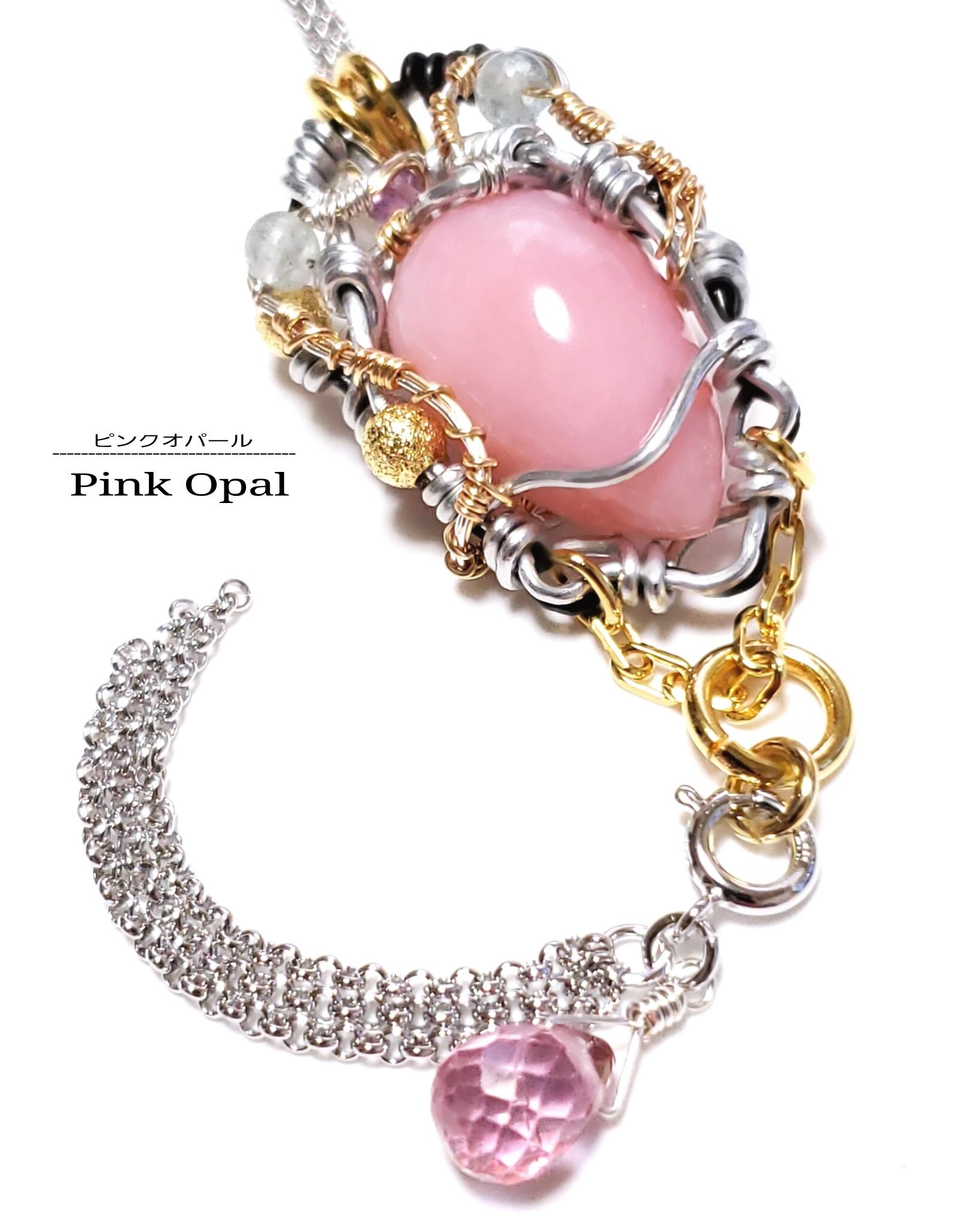 女性をより美しく品良く装わせてくれるいうピンクオパールに、アクアマリンとフローライト、そして、タッセルチェーン付きピンクトパーズのチャームを組み合わせ、シルバーとゴールドのアーティスティックワイヤーとアルマイト鍍金アルミ製ワイヤーを使用し、ペンダントトップにデザインしました。
