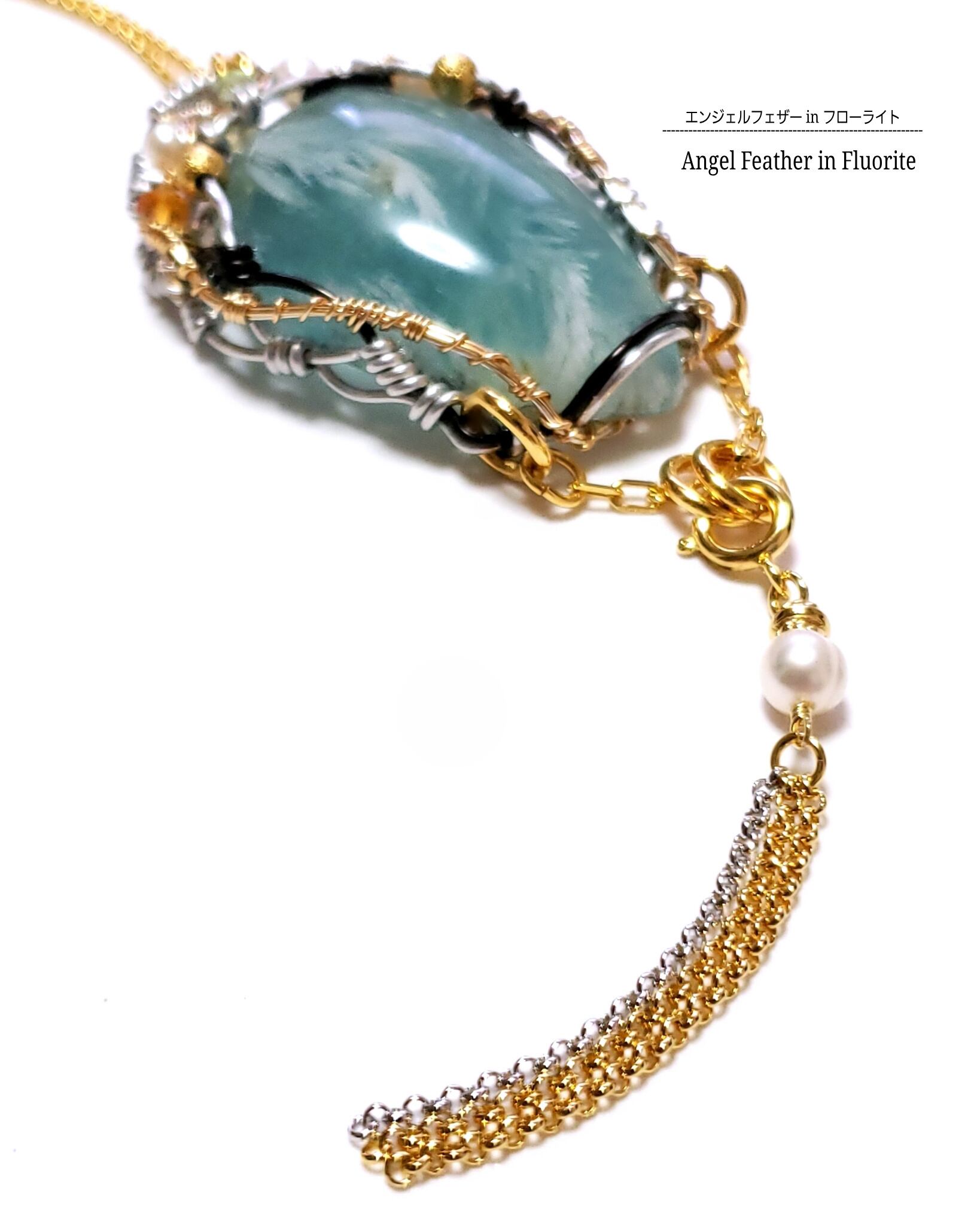 淡いグリーンのエンジェルフェザーinフローライトに淡水パールとホワイトラブラドライトとシトリン、そして、タッセルチェーン付き淡水パールのチャームを組み合わせ、シルバーとゴールドのアーティスティックワイヤーとアルミ製のワイヤーを使用し、ペンダントトップにデザインしました。