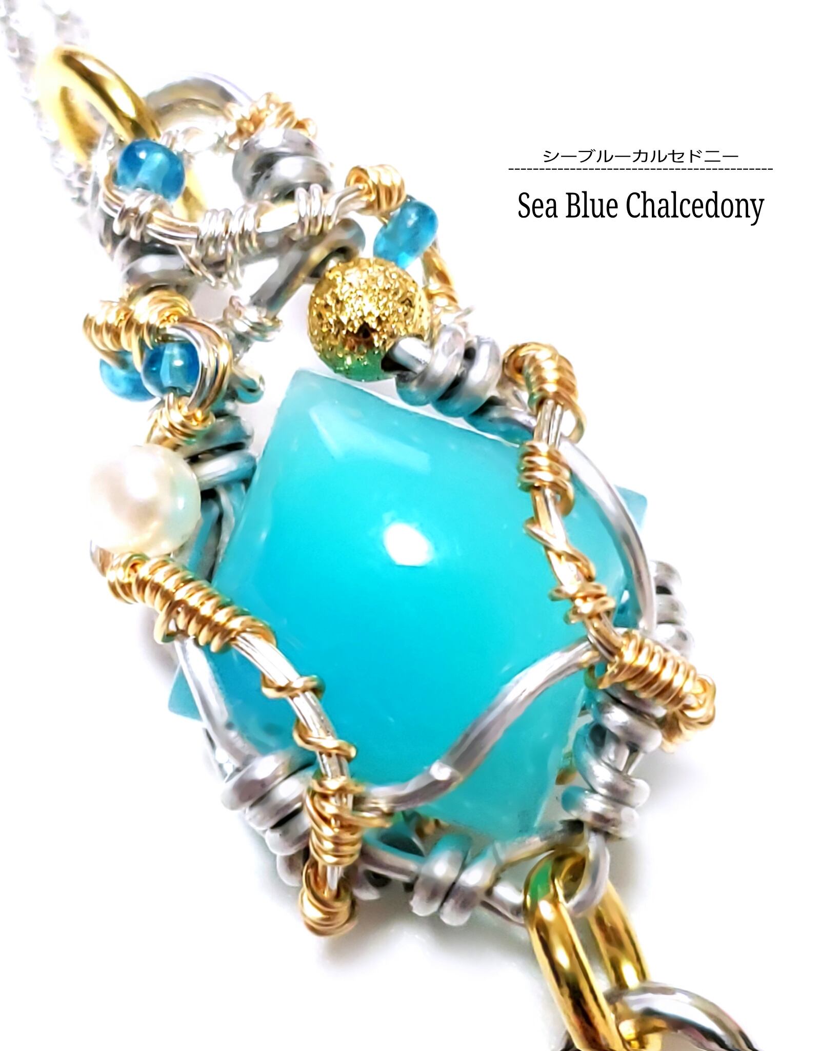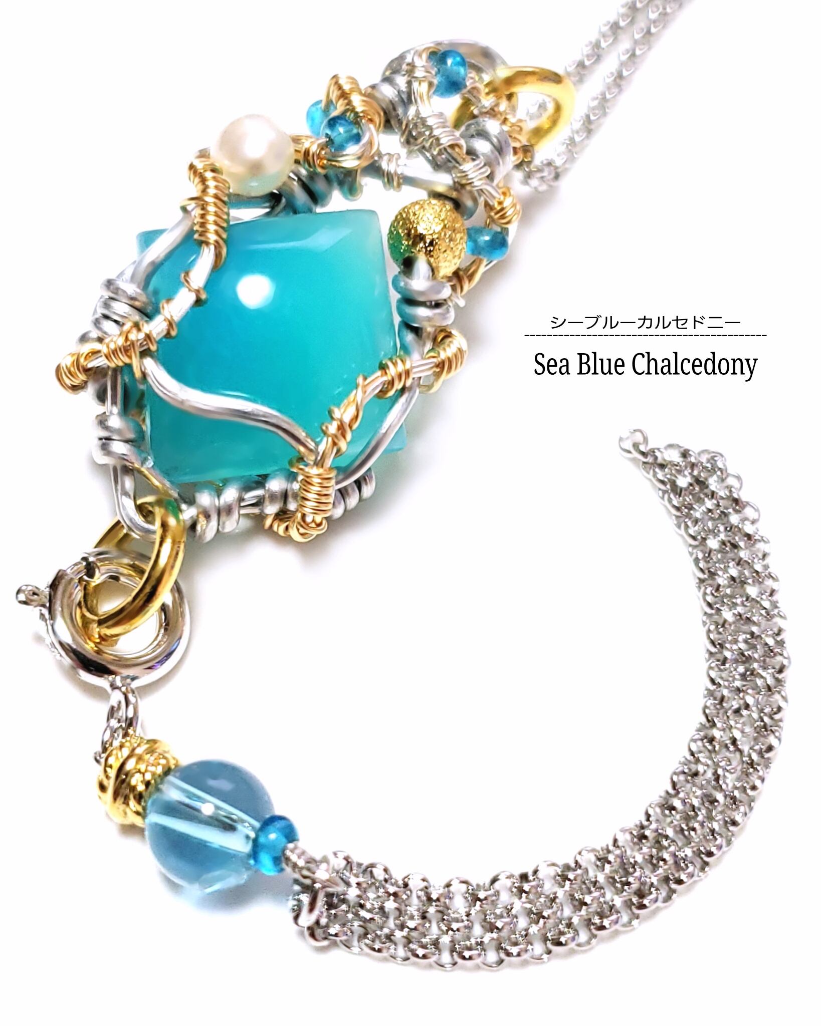 鮮やかなシーブルーカルセドニーに、淡水パールとブルーアパタイト、そして、タッセルチェーン付きブルートパーズと蜥蜴の2つのチャームを組み合わせ、シルバーとゴールドのアーティスティックワイヤーとアルミ製ワイヤーを使用し、ペンダントトップにデザインしました。