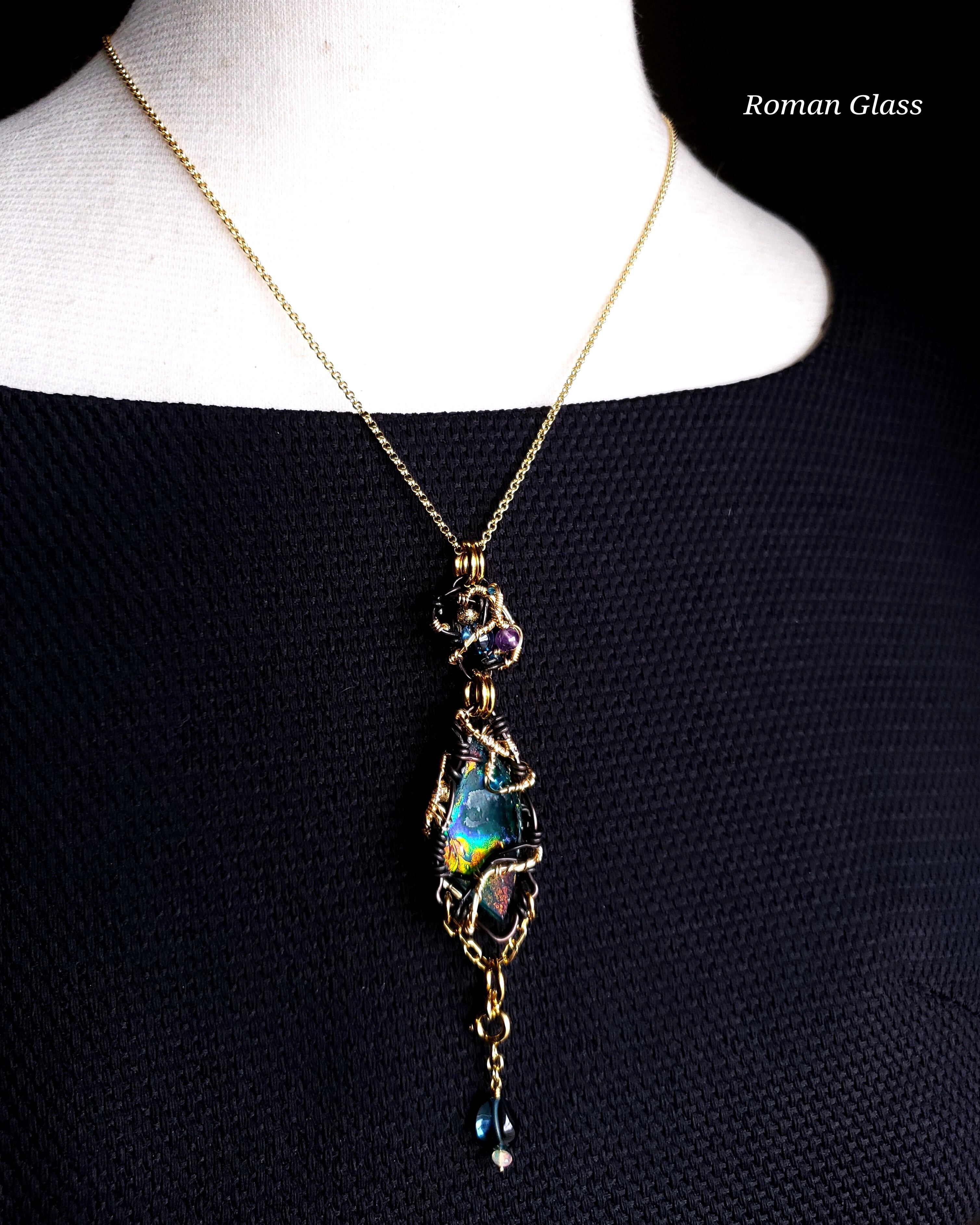 アフガニスタン産のローマングラスに、ブルーアパタイトとブルートパーズとアメジスト、そして、ロンドンブルートパーズのチャームを組み合わせ、ゴールドのアーティスティックワイヤーとアルマイト鍍金アルミ製ワイヤーを使用し、ペンダントトップにデザインしました。