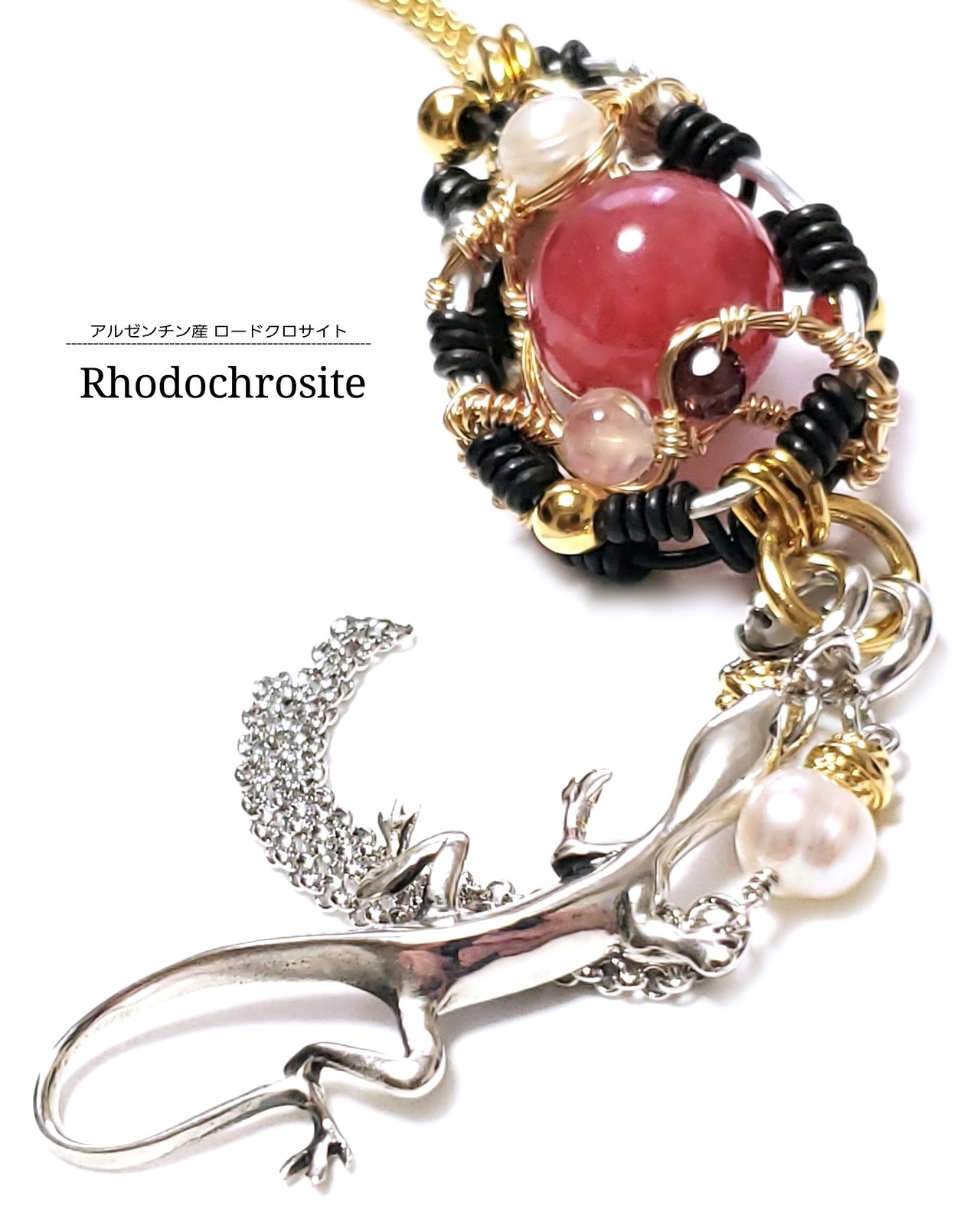アルゼンチン産の艶やかなインカローズの丸玉に、淡水パールとホワイトラブラドライトとガーネット、そして、タッセルチェーン付き淡水パールのチャームと蜥蜴チャームを組み合わせ、ゴールドのアーティスティックワイヤーとブラックとシルバーのアルマイト鍍金アルミ製ワイヤーを使用し、ペンダントトップにデザインしました。