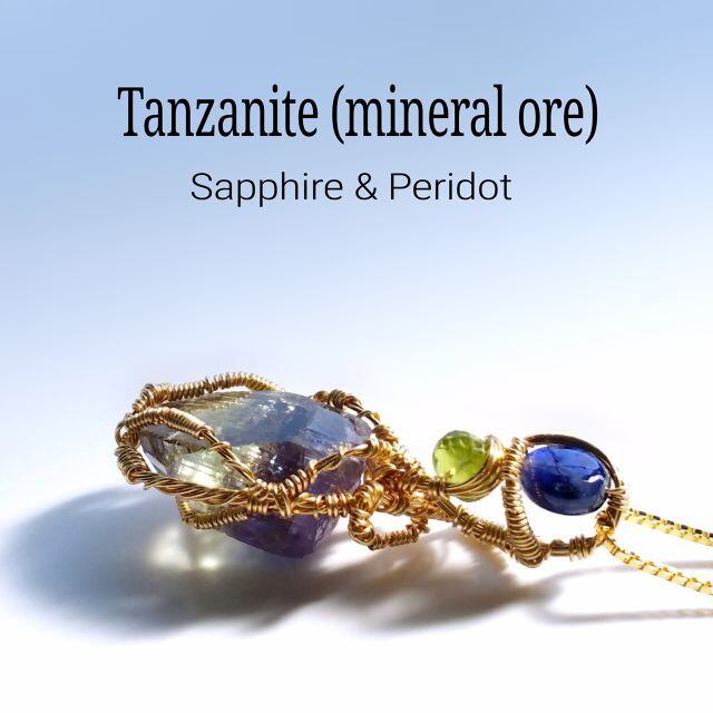 宝石質の非加熱のタンザナイトと、タンザナイトの色に合わせ、宝石質のサファイアとペリドットを組み合わせ、ゴールドのアーティスティックワイヤーを使用し、ペンダントトップにデザインしました。