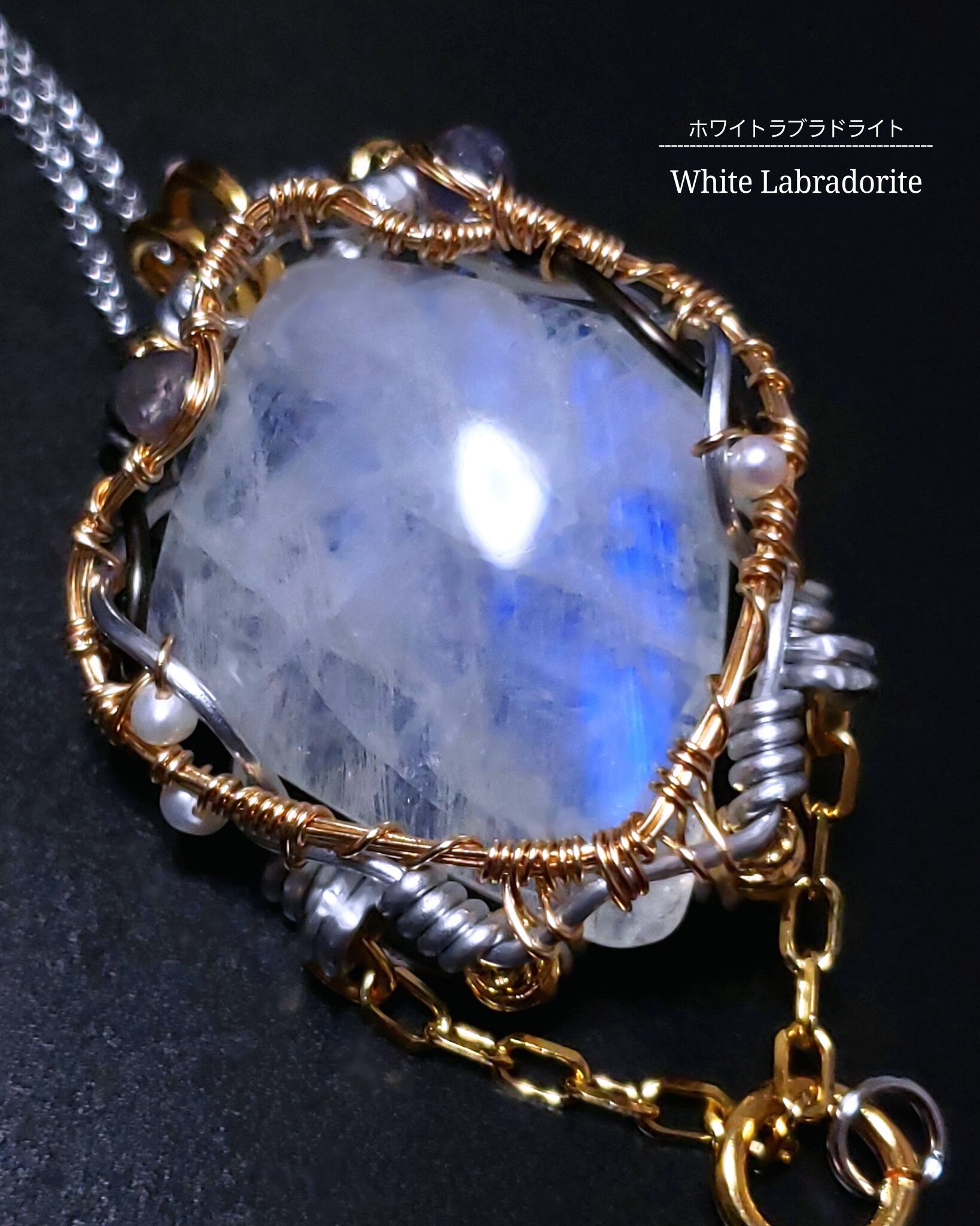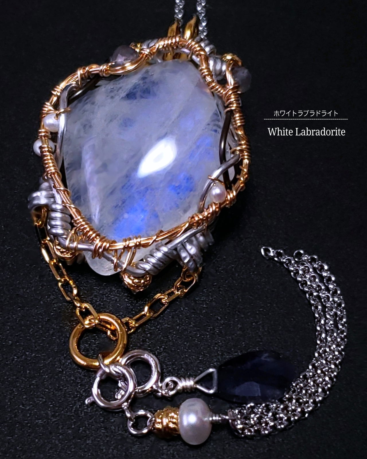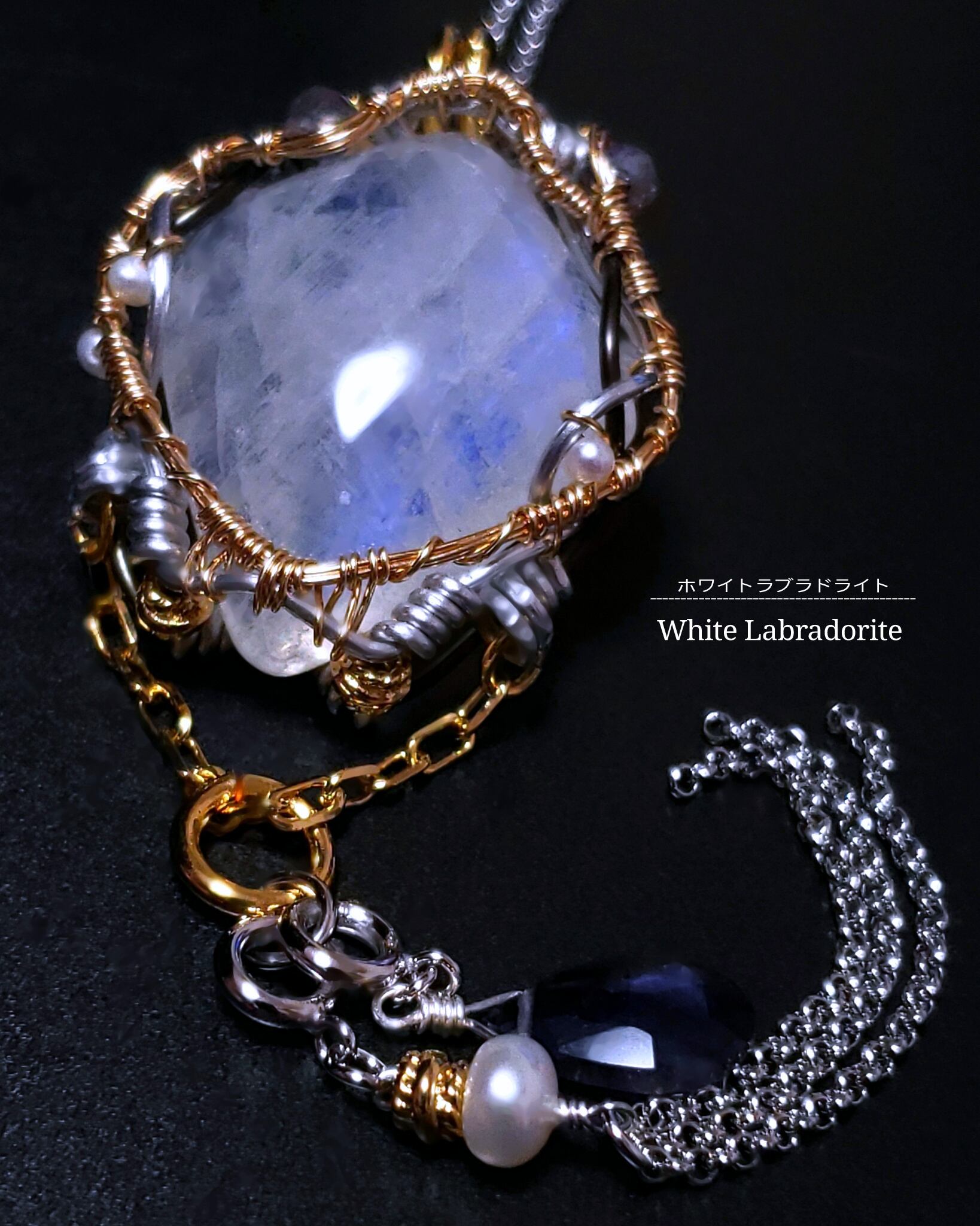 月のように青色の輝きが美しいホワイトラブラドライトにアイオライトと淡水パール、そして、アイオライトのチャームとタッセルチェーン付き淡水パールのチャームを組み合わせ、ゴールドのアーティスティックワイヤーとアルマイト鍍金アルミ製ワイヤーを使用し、ペンダントトップにデザインしました。
