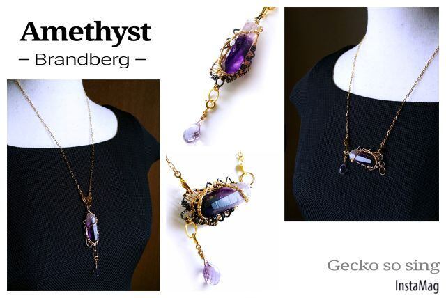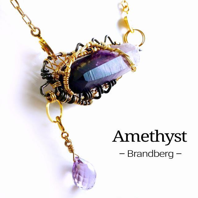 ナミビアのブランドバーグ産のナチュラルポイント・アメジストを、ゴールドのアーティスティックワイヤーと、アルマイト鍍金アルミニウム製ワイヤーを使用し、ペンダントトップにデザインしました。