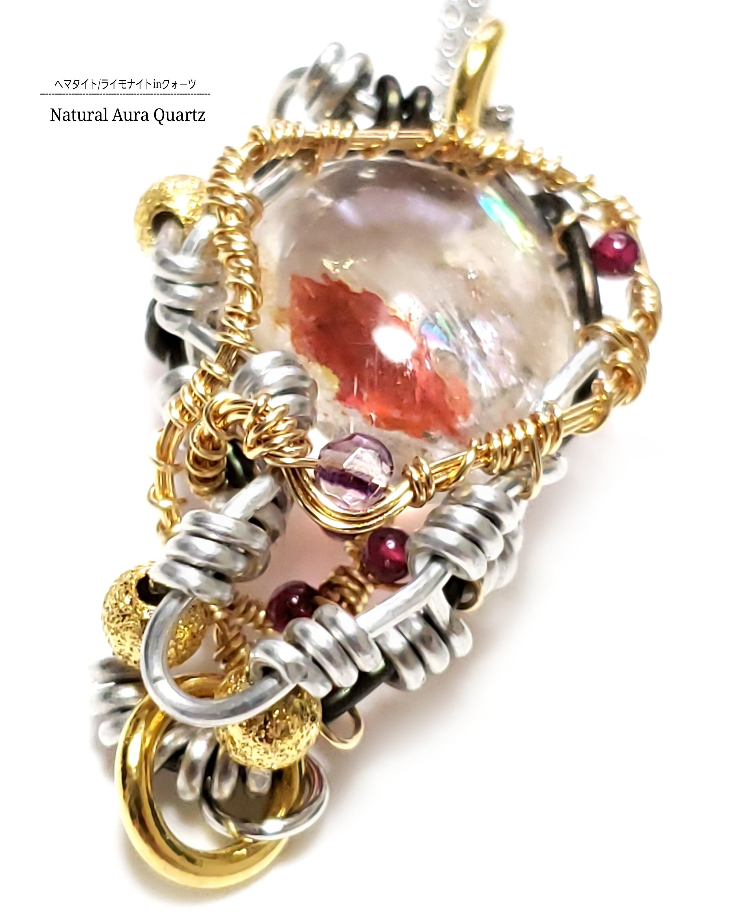 水晶の内部に赤色のヘマタイト(赤鉄鉱)を内包した大変に珍しい水晶に、ガーネットとフローライト、そして、ガーネットのチャームを組み合わせ、ゴールドのアーティスティックワイヤーとブラックのアルマイト鍍金アルミ製ワイヤーを使用し、ペンダントトップにデザインしました。