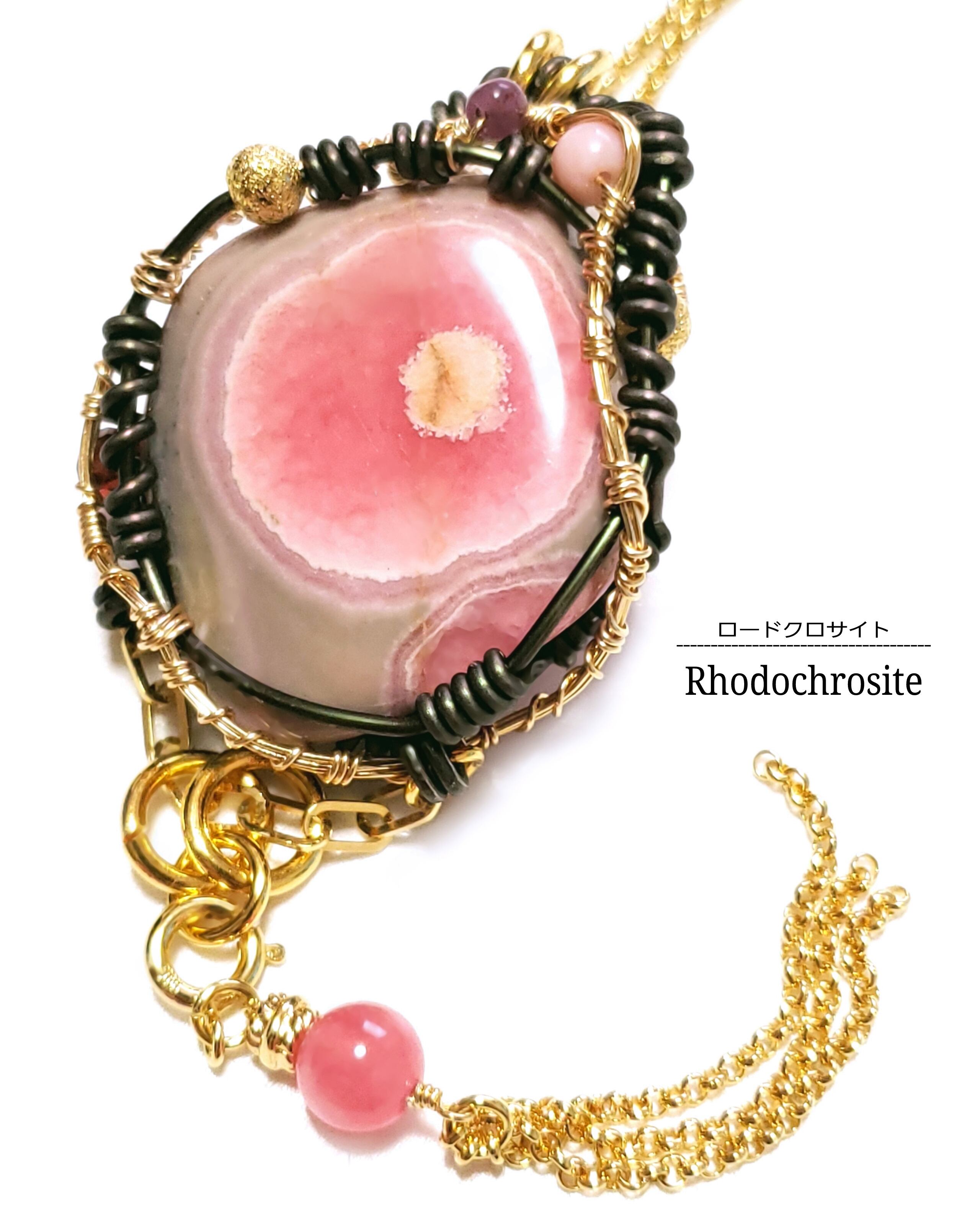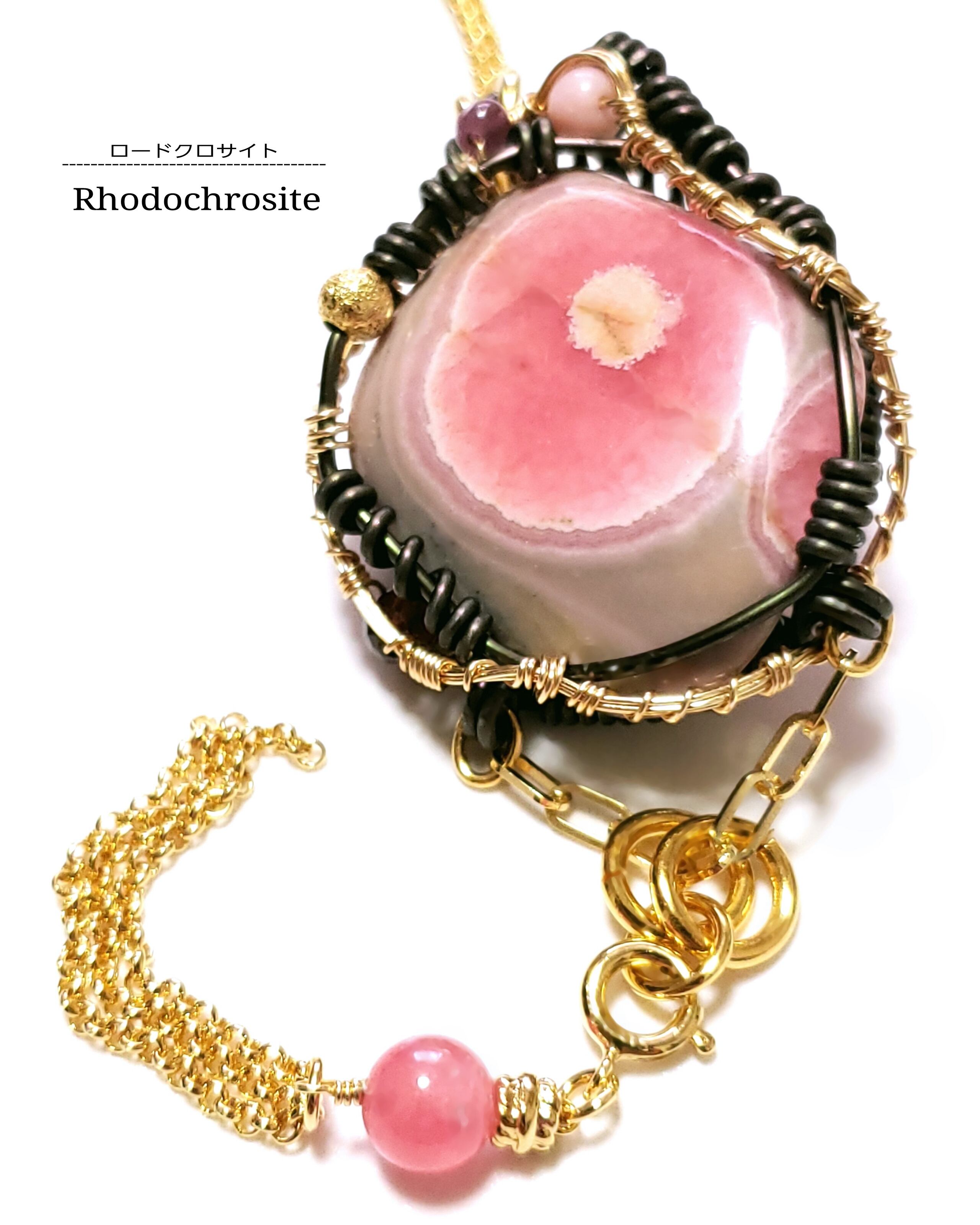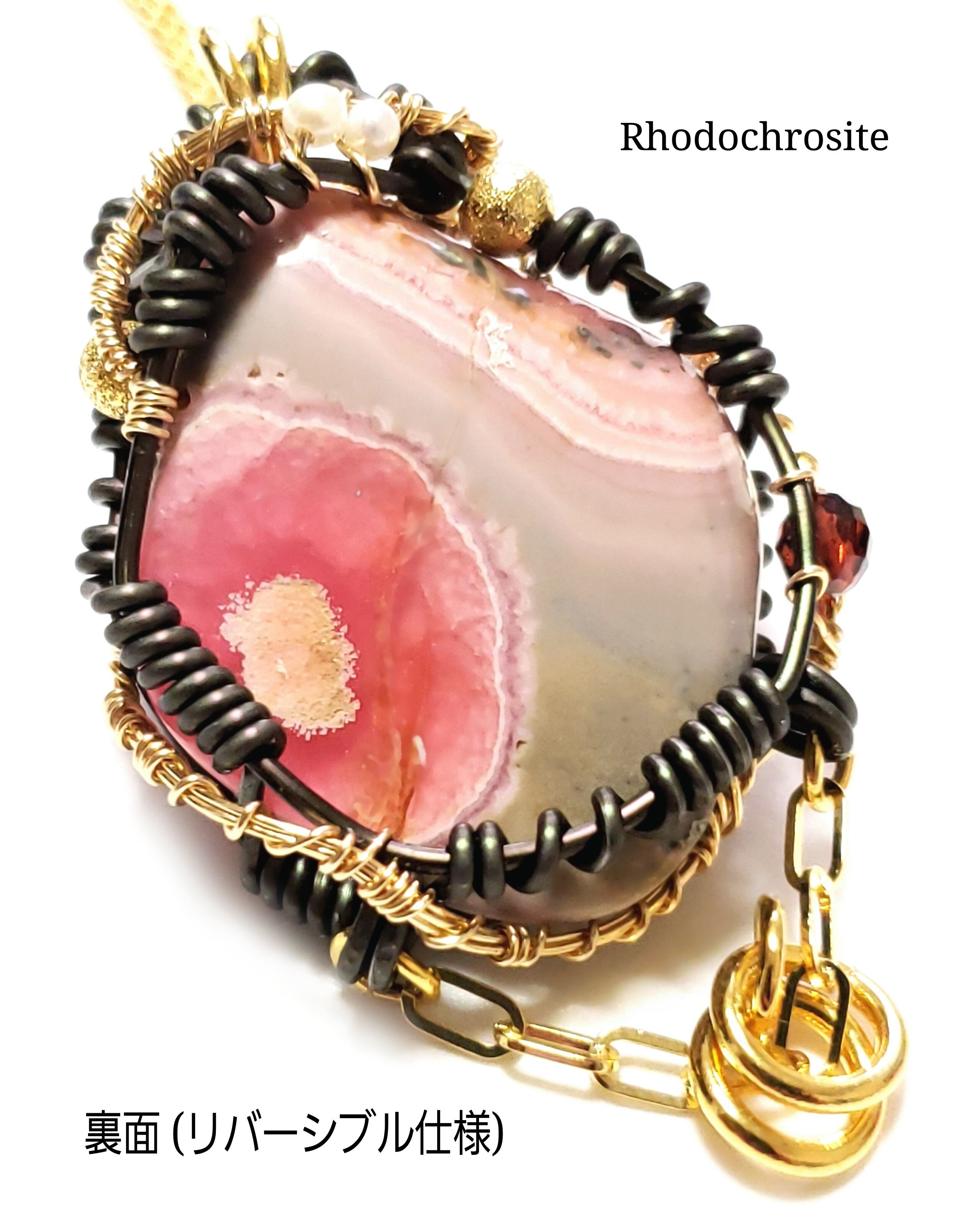 ロードクロサイトのタンブルに、ピンクオパールとガーネットとルビーと淡水パール、そして、タッセルチェーン付きロードクロサイトのチャームを組み合わせ、ゴールドのアーティスティックワイヤーとアルマイト鍍金のアルミ製ワイヤーを使用し、ペンダントトップにデザインしました。