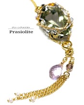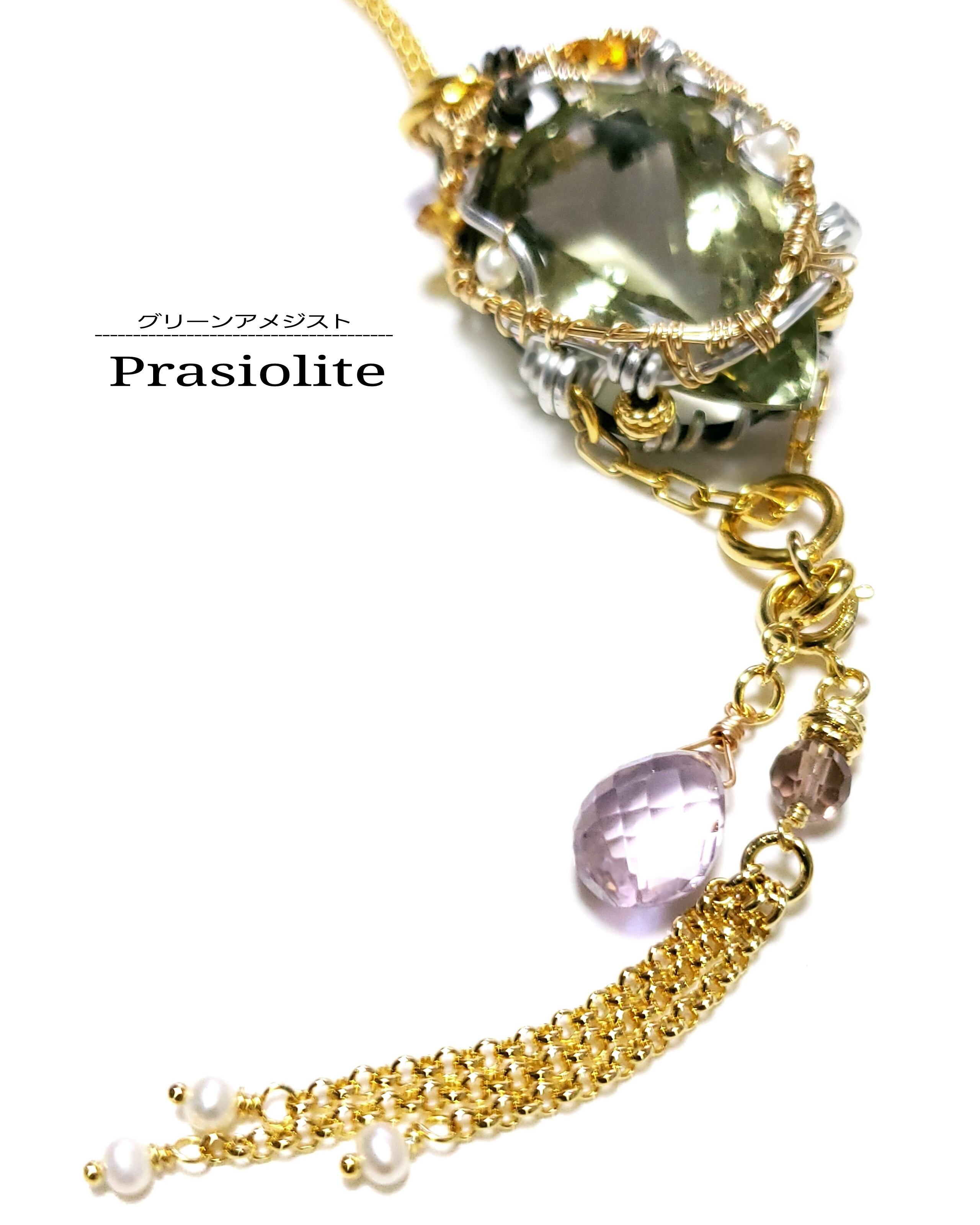 透明感たっぷりのグリーンの輝きが美しい、高品質のグリーンアメジスト(プラジオライト)に、淡水パールとシトリン、そして、ピンクアメジストのチャームとタッセルチェーン付きアメトリンと淡水パールのチャーム を組み合わせ、ゴールドカラーのアーティスティックワイヤーとアルミ製ワイヤーを使用してペンダントトップにデザインしました。