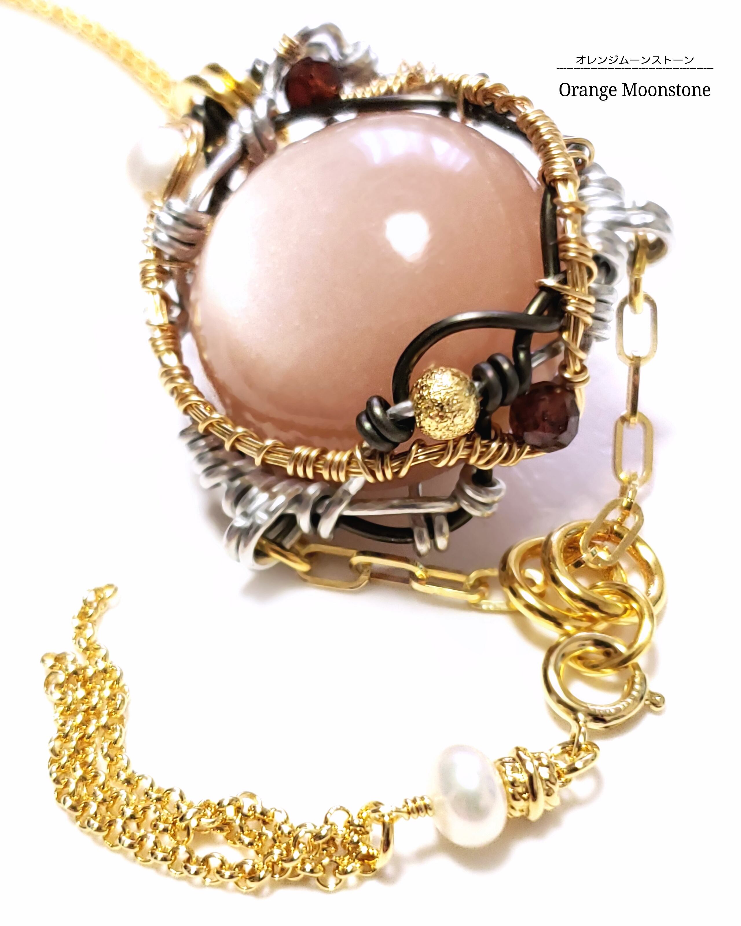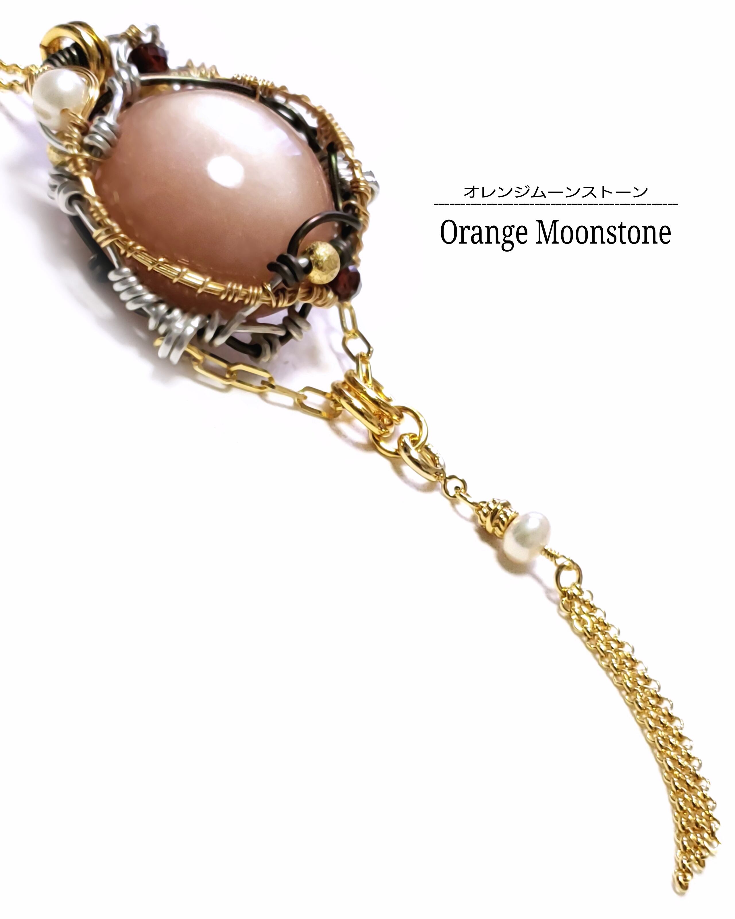 薄らアベンチュレッセンスとシラーが一緒に浮かぶオレンジムーンストーンに、淡水パールとガーネット、そして、タッセルチェーン付き淡水パールのチャームを組み合わせ、ゴールドのアーティスティックワイヤーとブラックのアルマイト鍍金アルミ製ワイヤーを使用し、ペンダントトップにデザインしました。