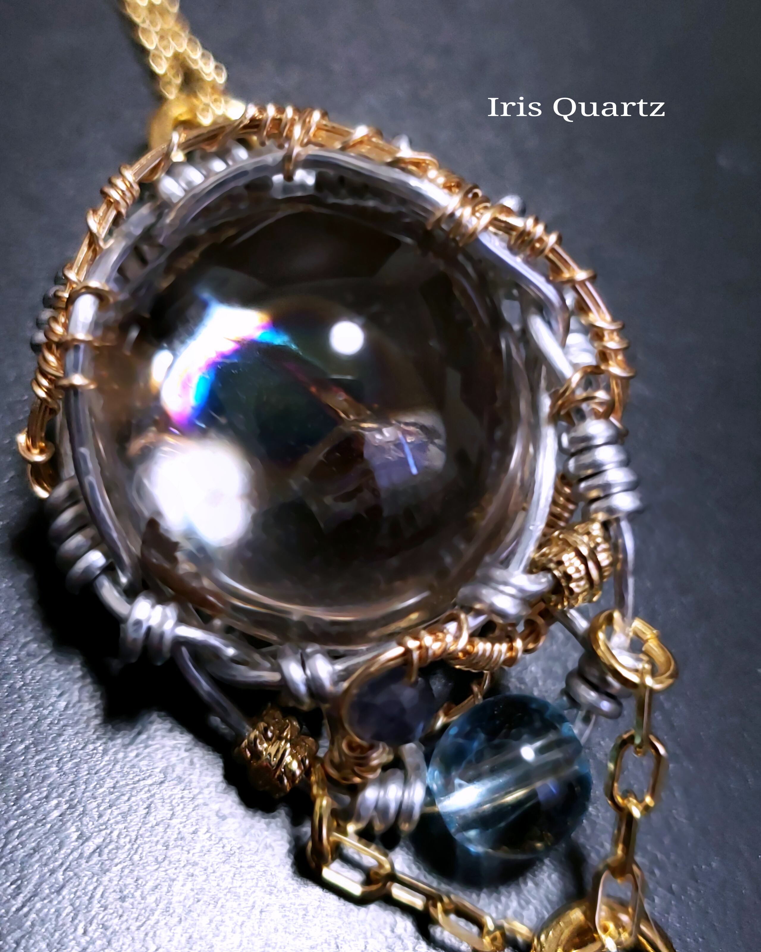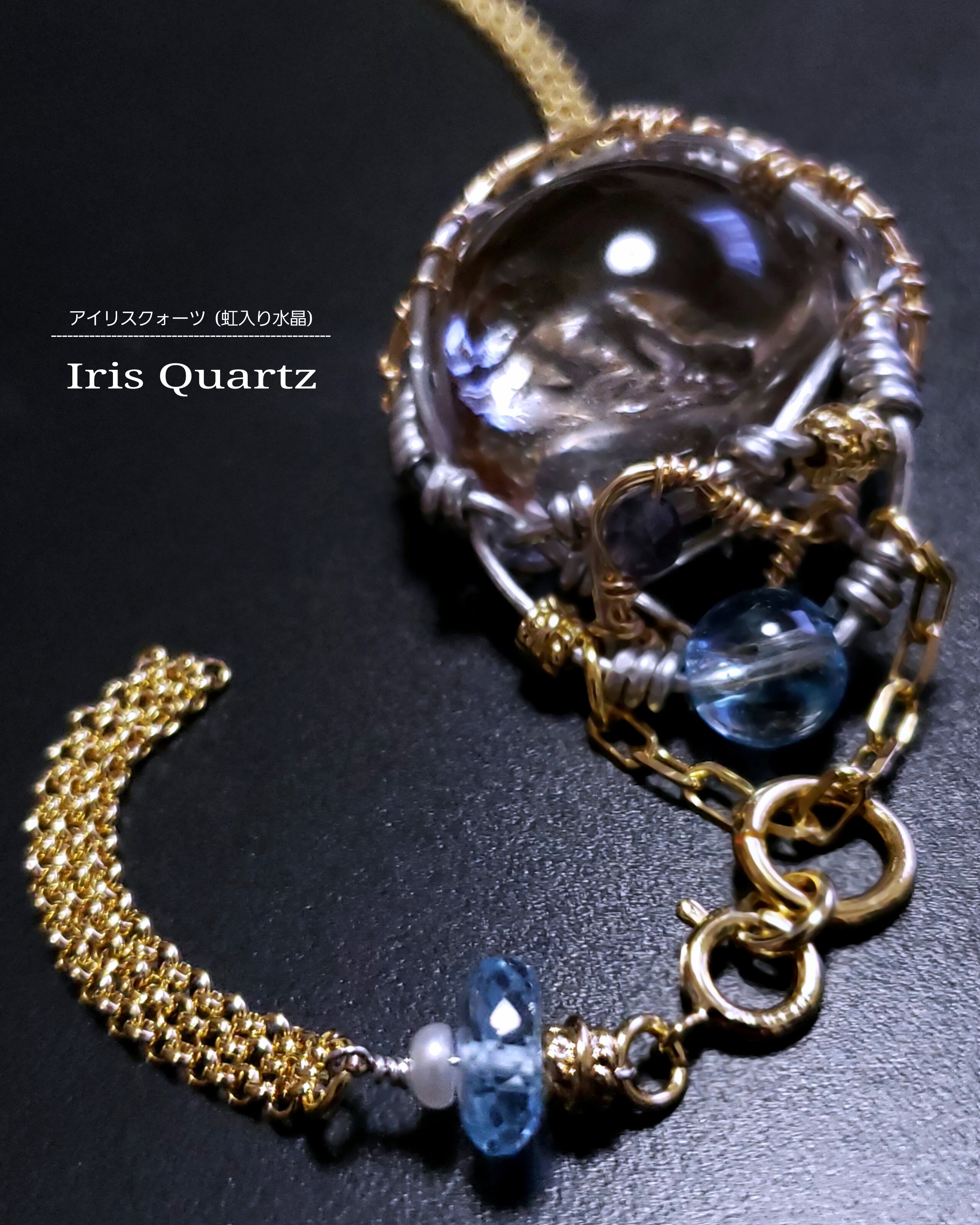 虹色の輝きが美しいアイリスクォーツに、ブルートパーズとアイオライト、そして、タッセルチェーン付きブルートパーズのチャームを組み合わせ、ゴールドのアーティスティックワイヤーとアルミ製のワイヤーを使用し、ペンダントトップにデザインしました。