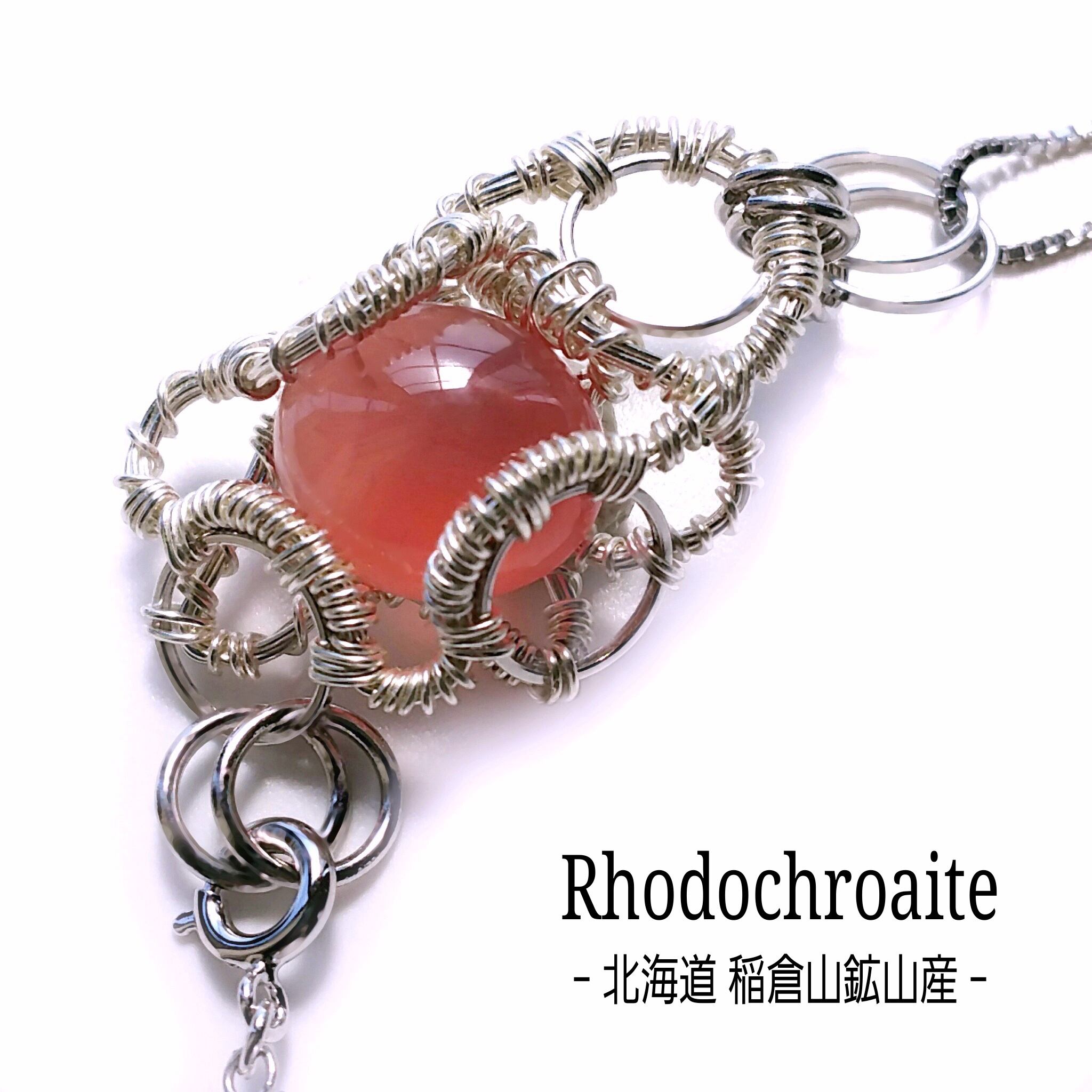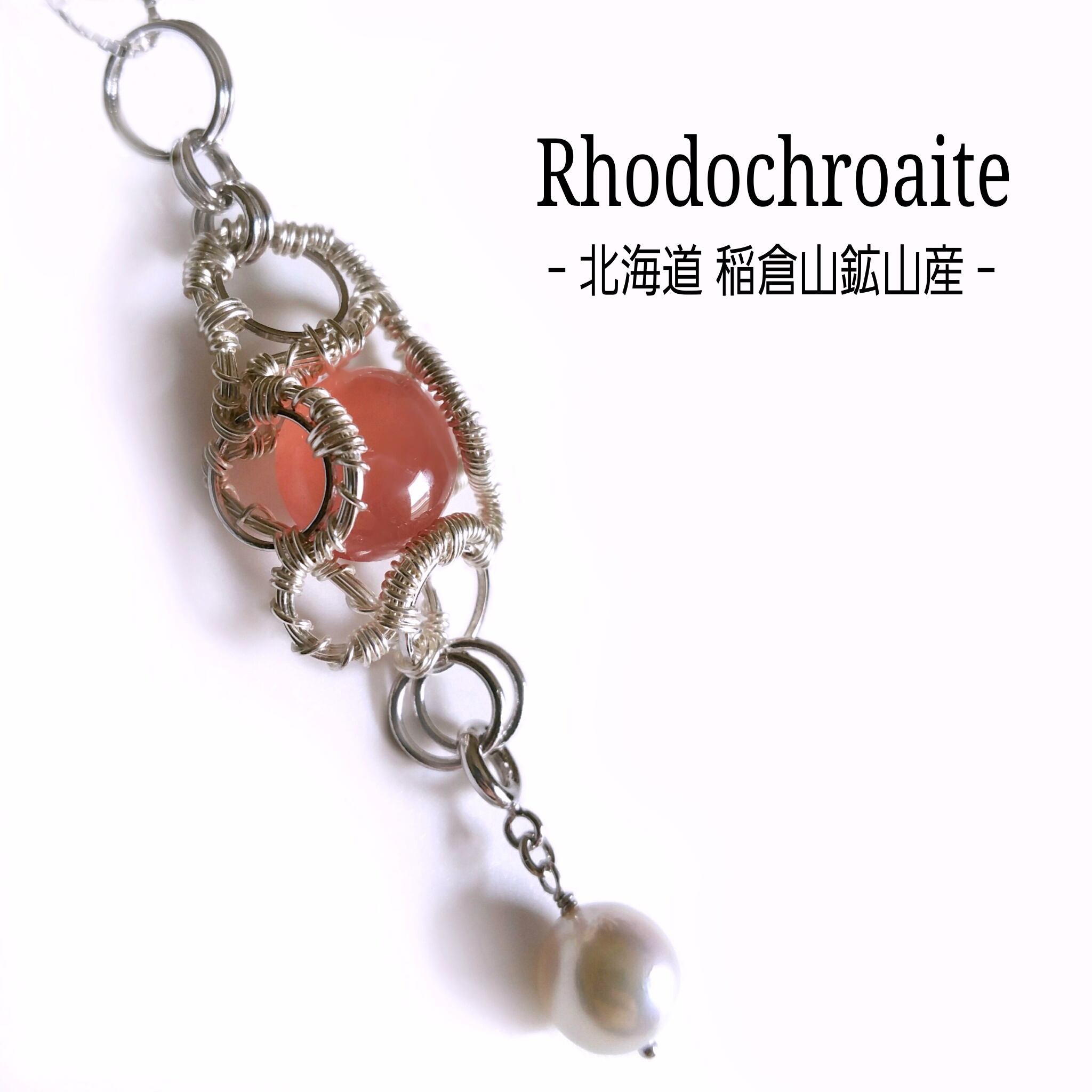 北海道稲倉石鉱山産のロードクロサイトと、伊勢志摩産のアコヤ真珠を組み合わせ、シルバーのアーティスティックワイヤーを使用し、ペンダントトップにデザインしました。